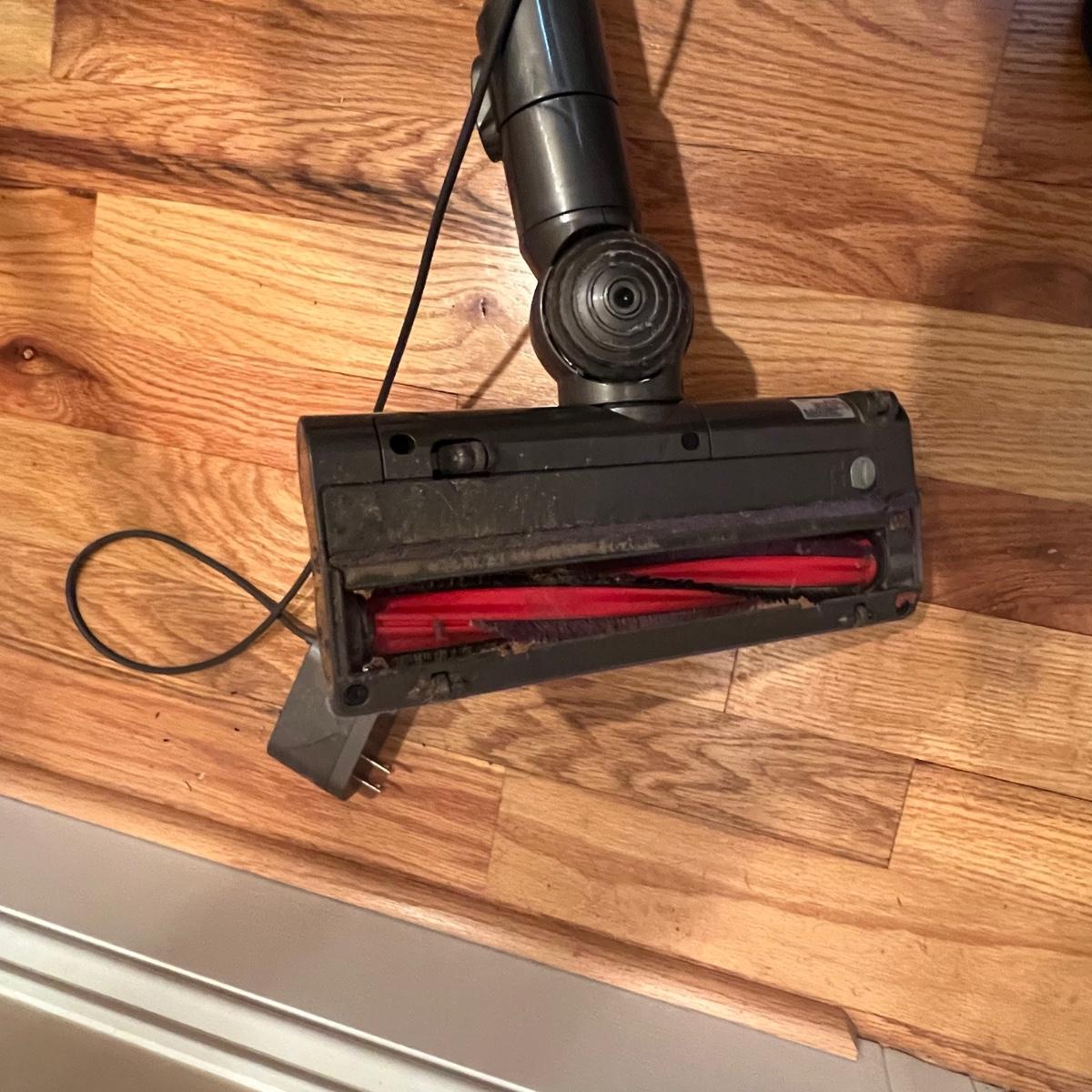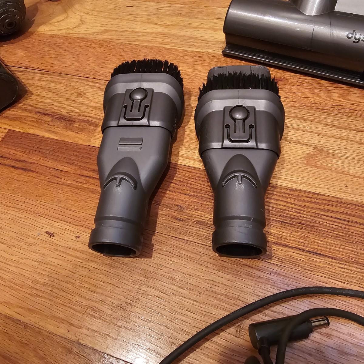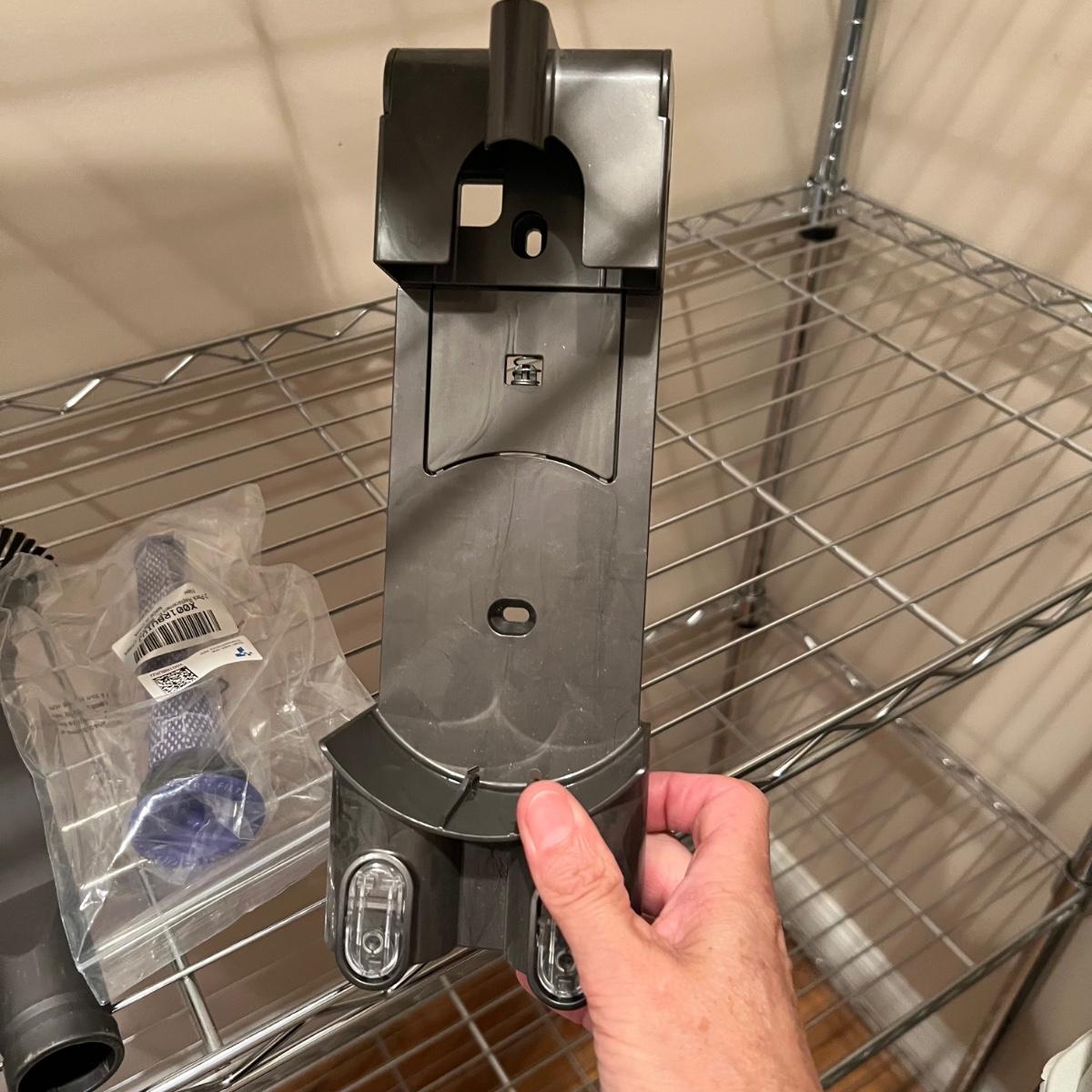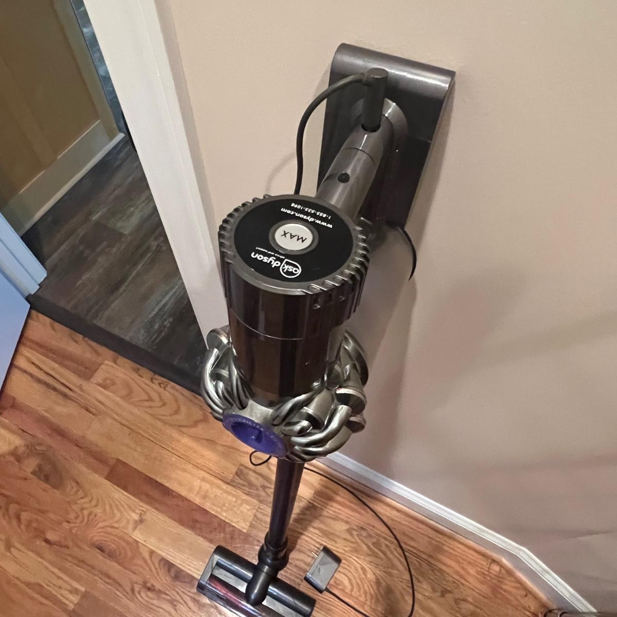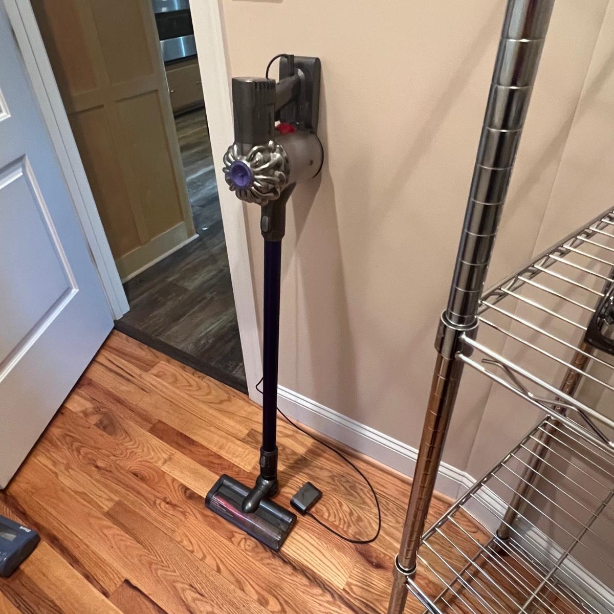 This cordless Dyson vacuum worked when tested and comes with manual, lots of different tools and a hanging bracket.