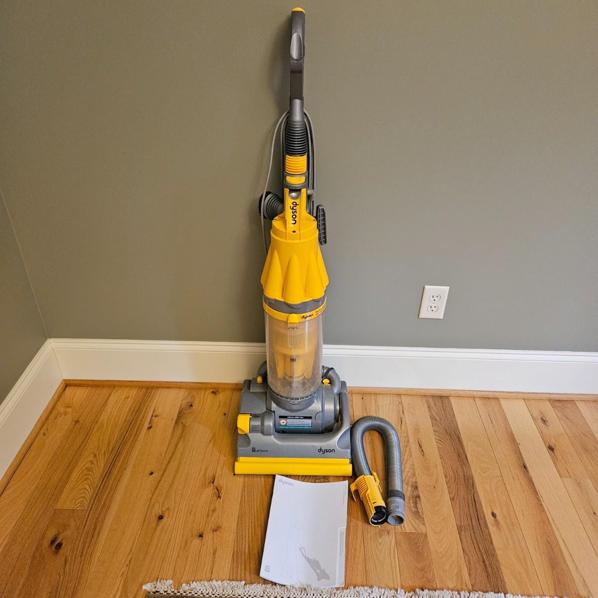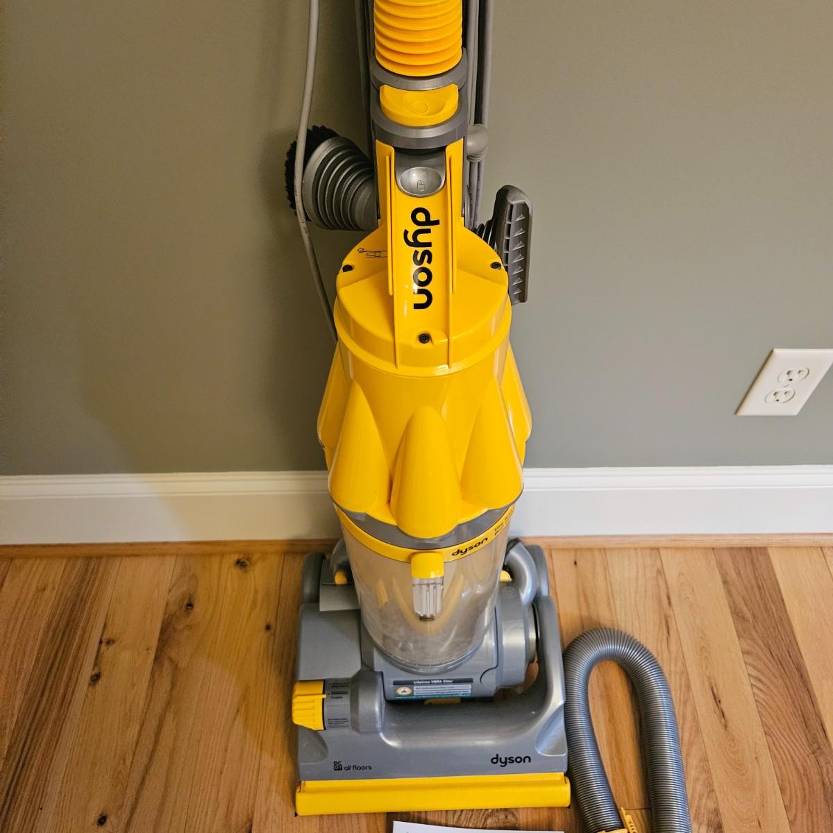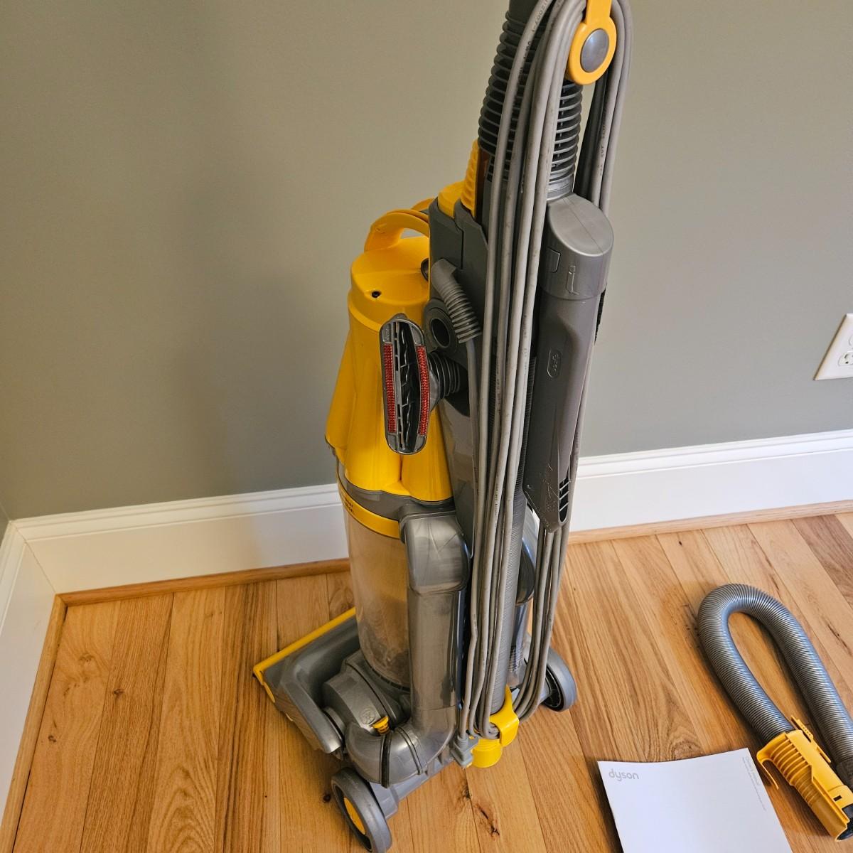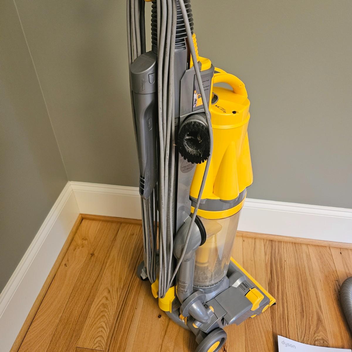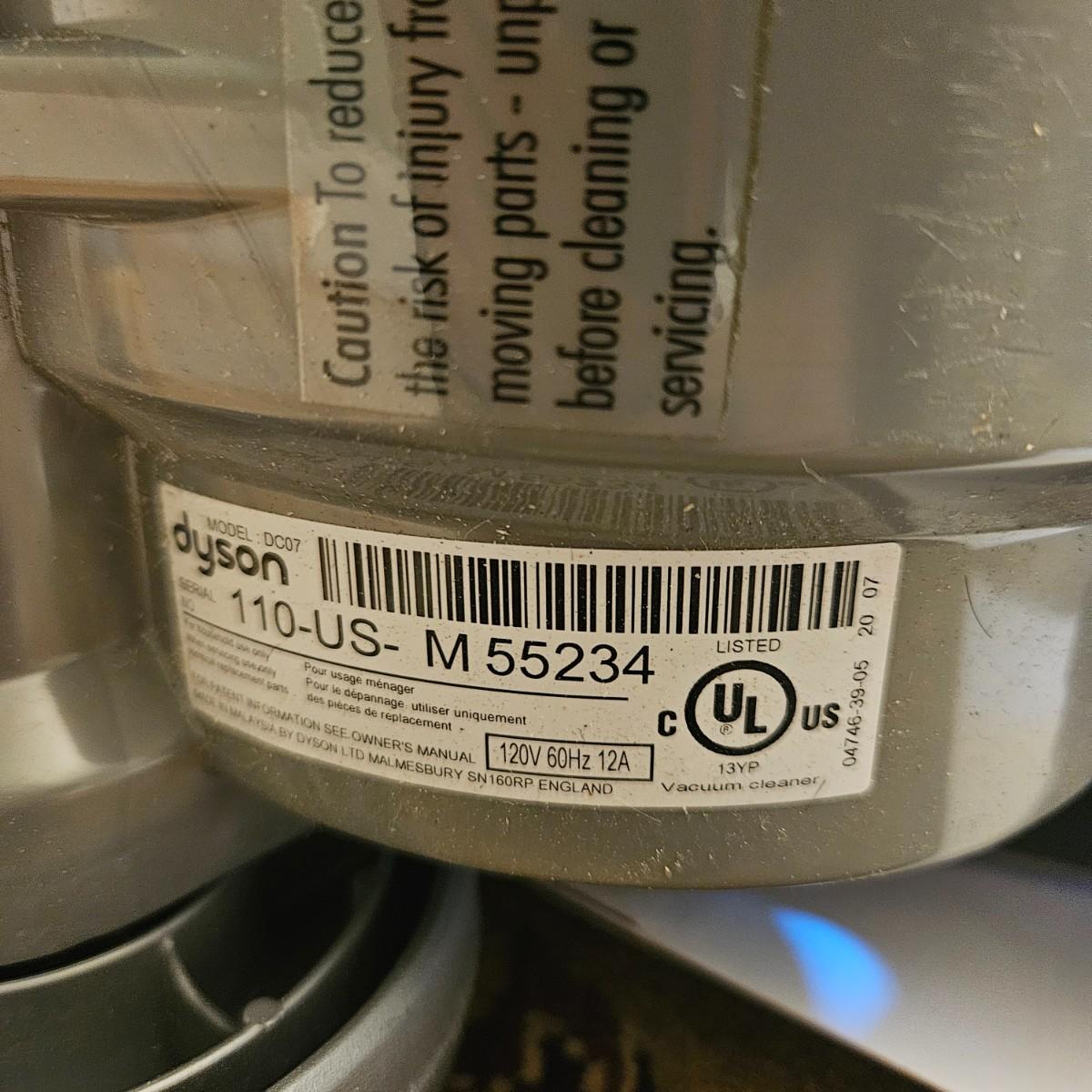 A Dyson DC07 vacuum that powered on when plugged in. It comes with three accessories and a hose extender. It measures approximately 13.5" x 13" x 47"H. Local pickup only