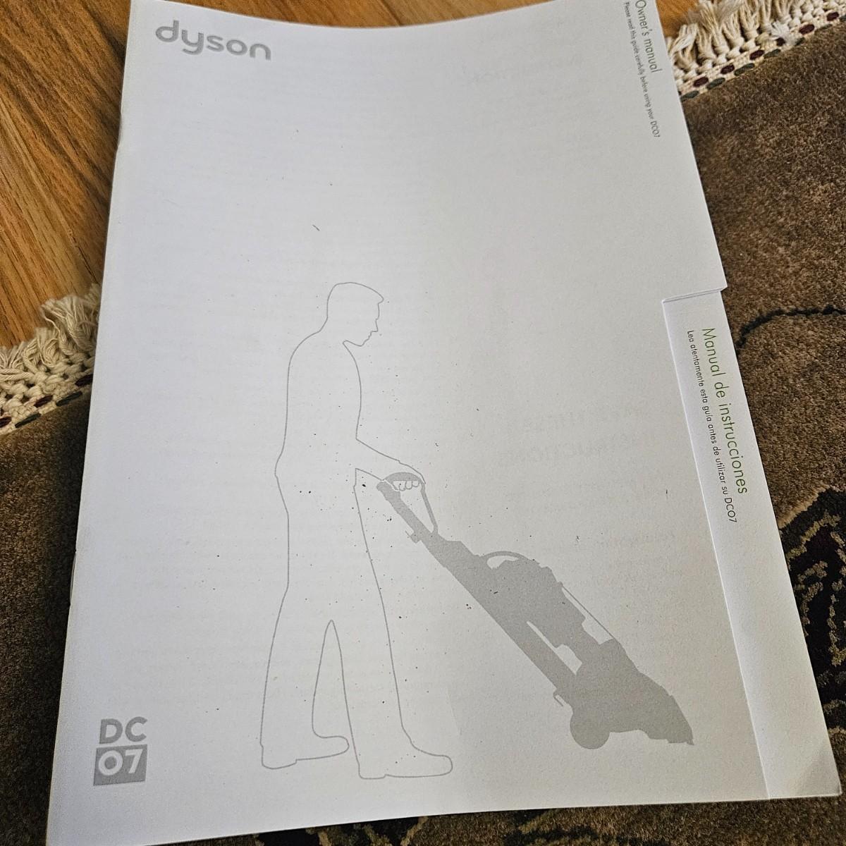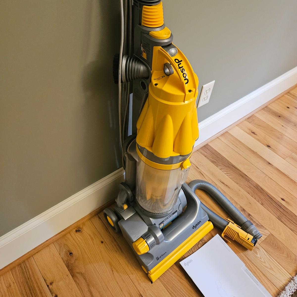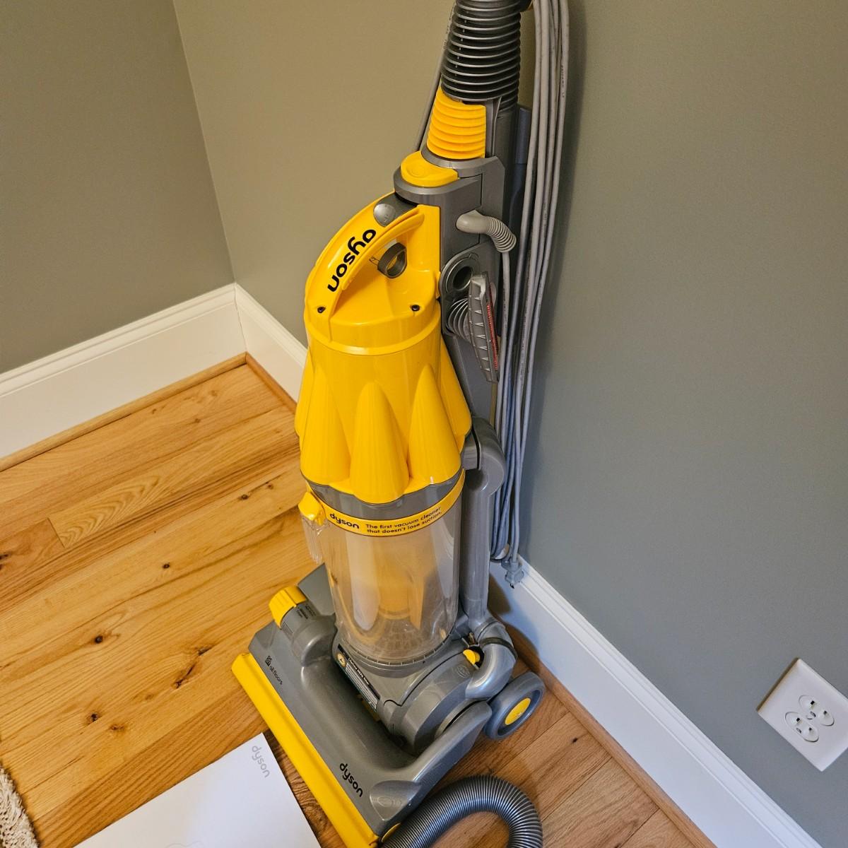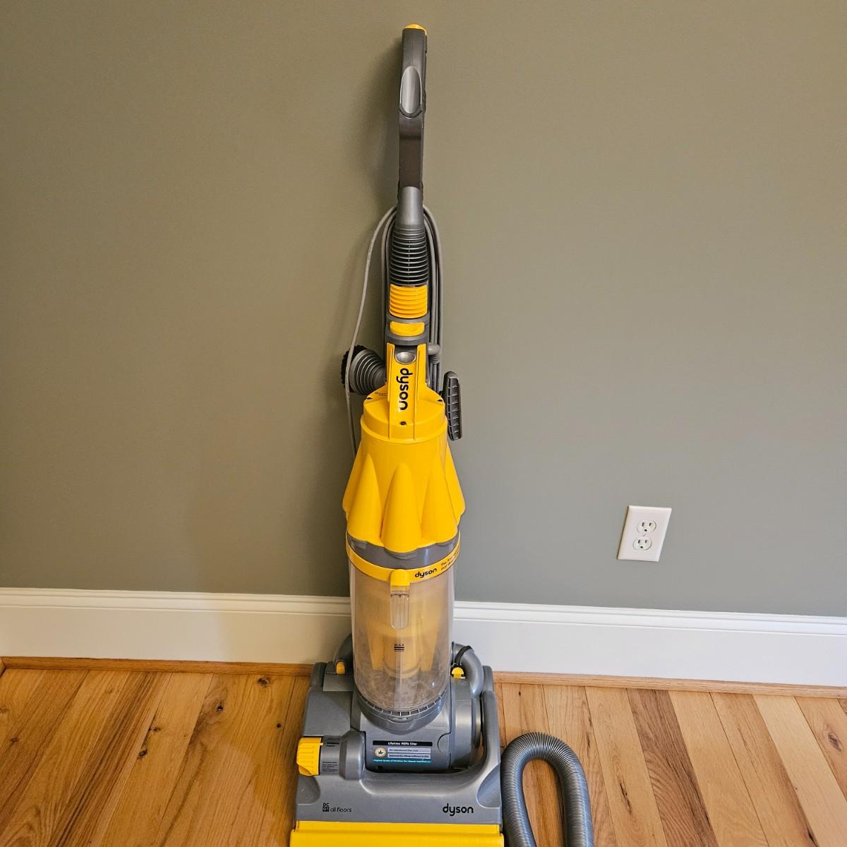 A Dyson DC07 vacuum that powered on when plugged in. It comes with three accessories and a hose extender. It measures approximately 13.5" x 13" x 47"H. Local pickup only