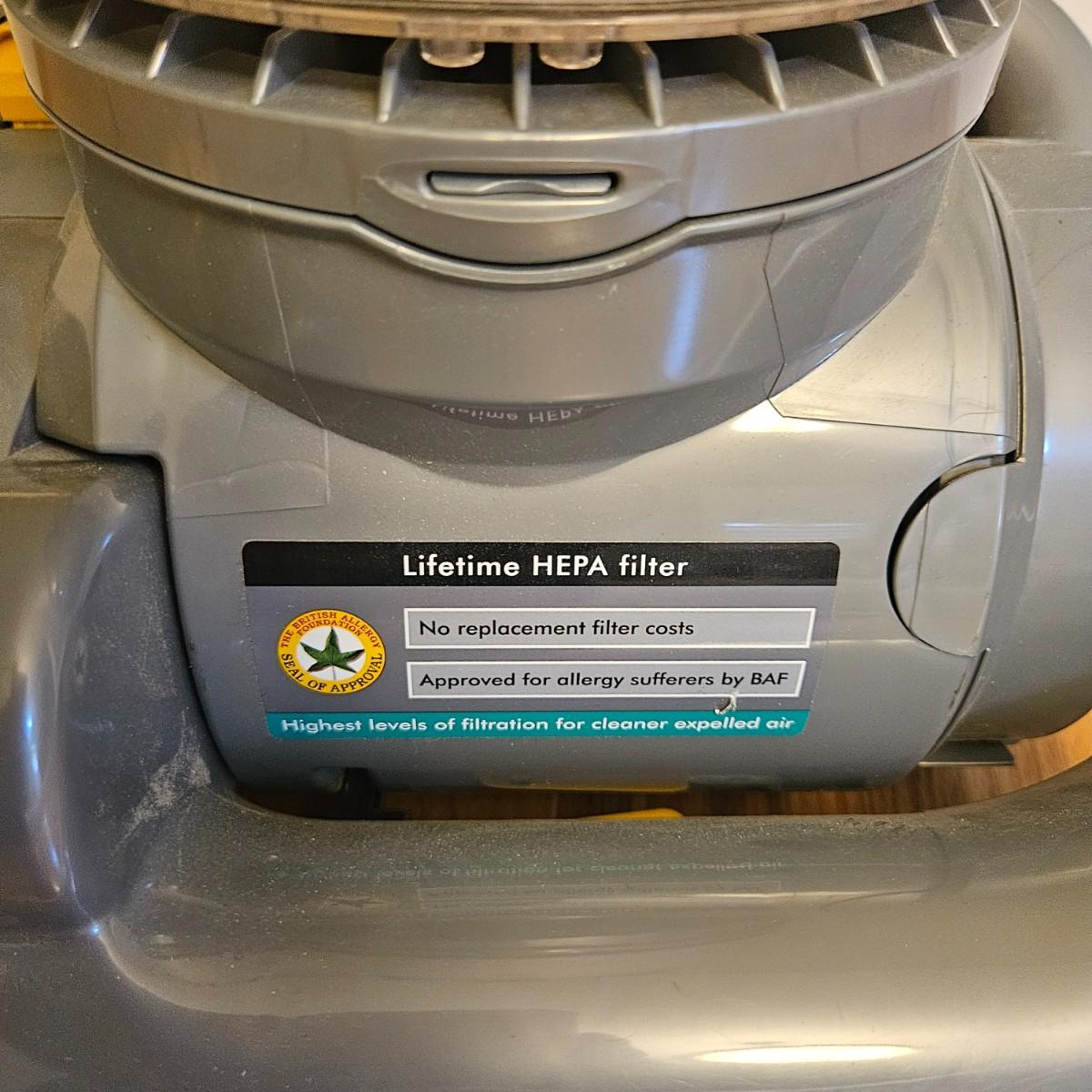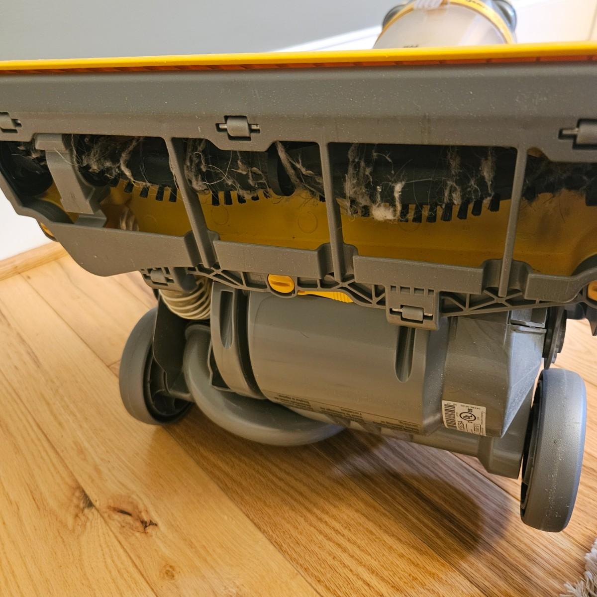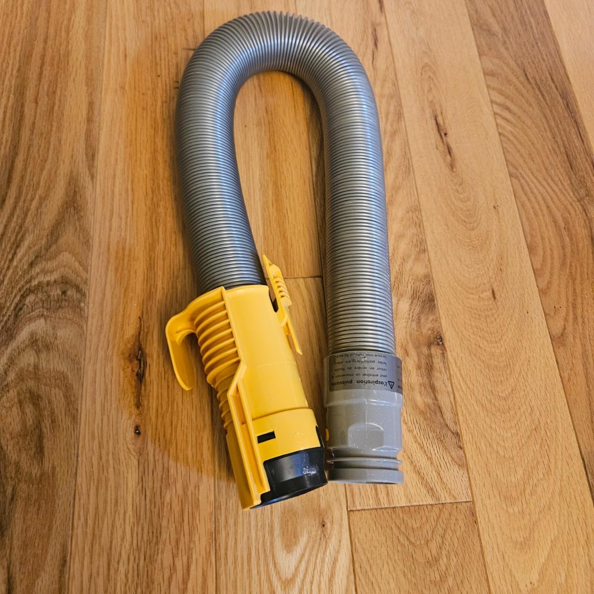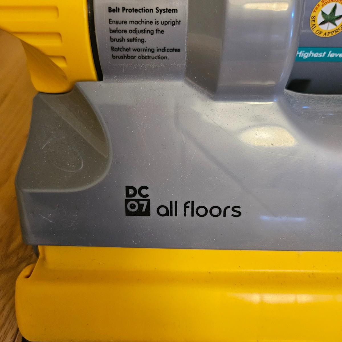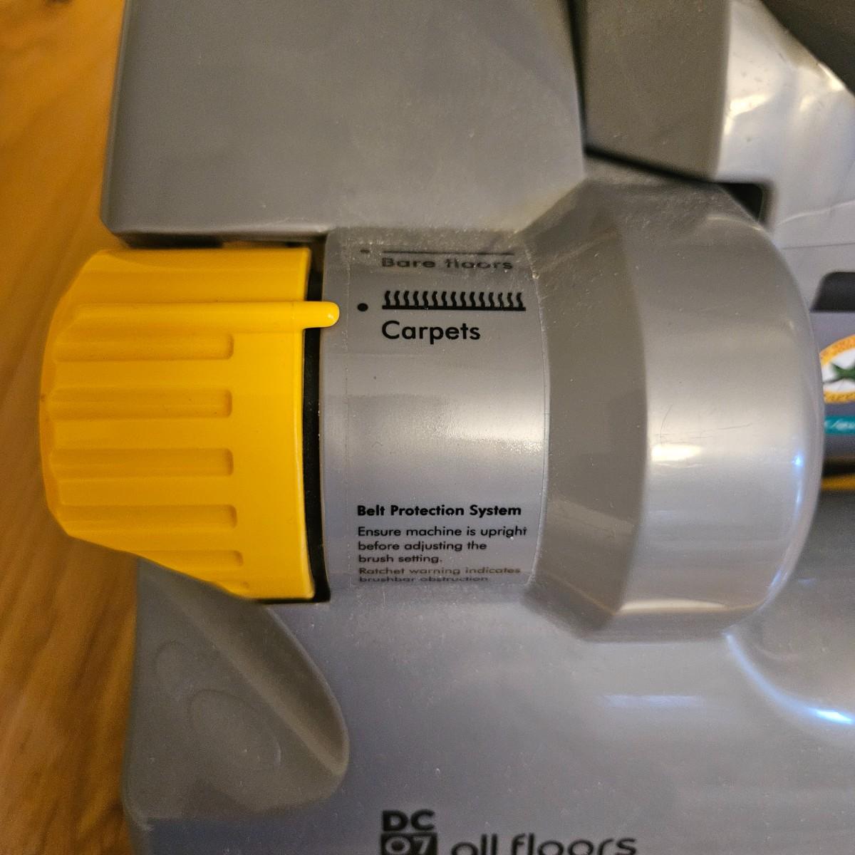 A Dyson DC07 vacuum that powered on when plugged in. It comes with three accessories and a hose extender. It measures approximately 13.5" x 13" x 47"H. Local pickup only
