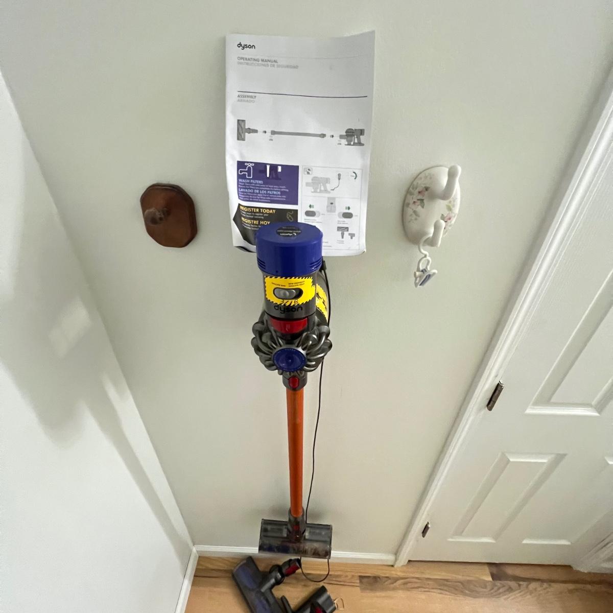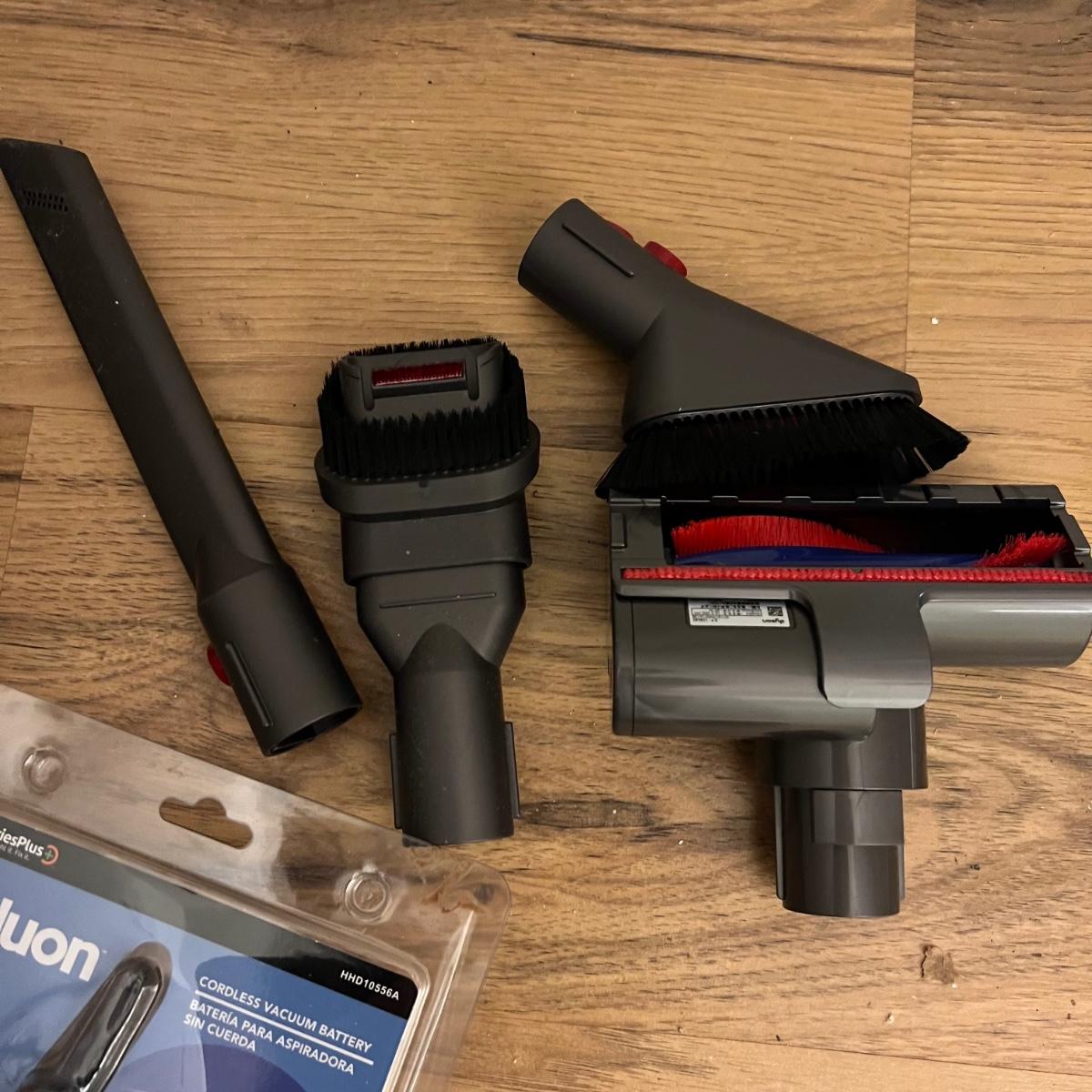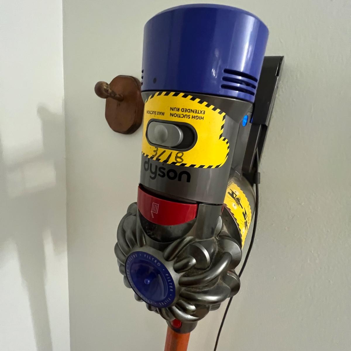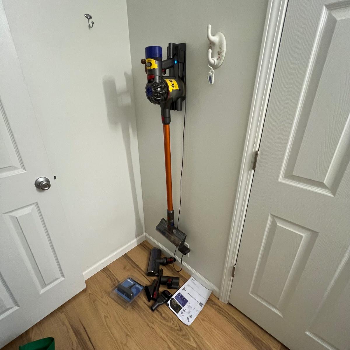 This Dyson V8 cordless vacuum powered on and comes with an extra head plus various smaller heads, an extra unopened battery and manual. Vacuum measures 10” x 50”H. Charging bracket has been dismantled.