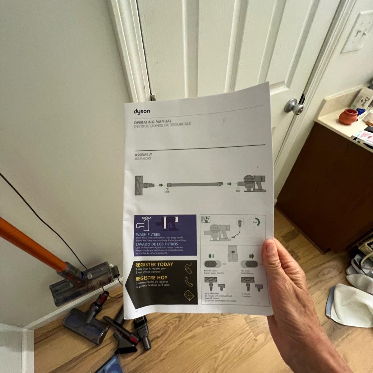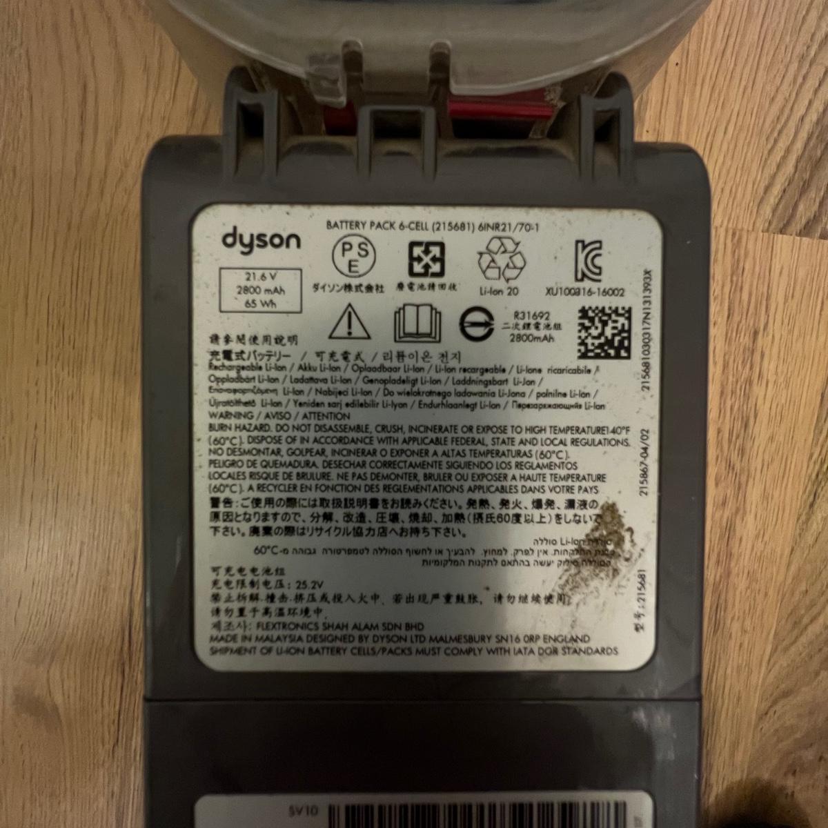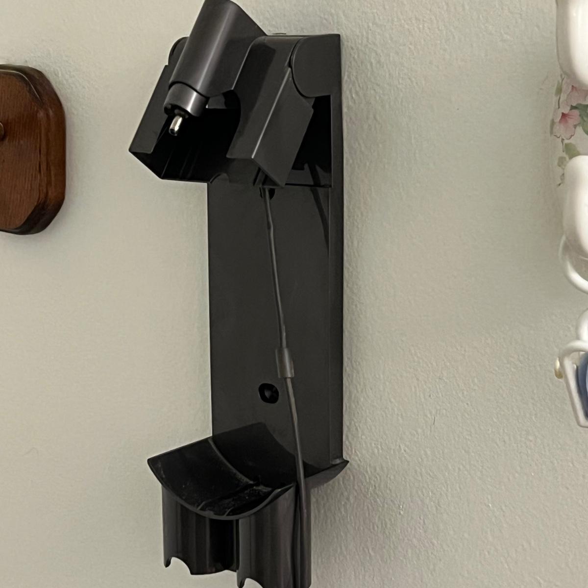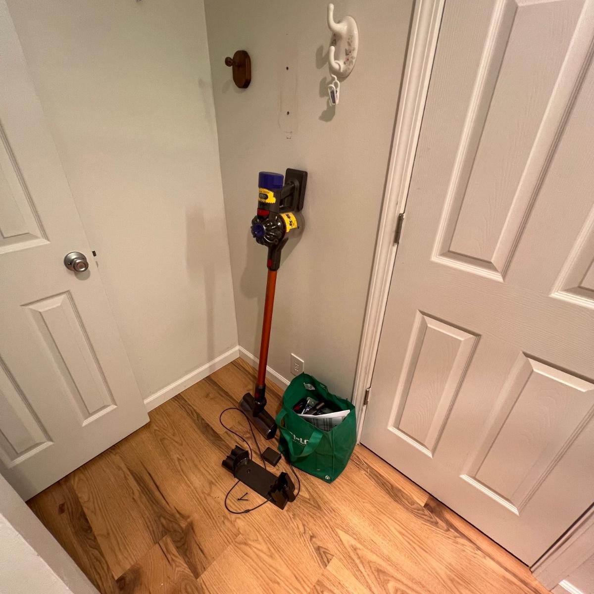 This Dyson V8 cordless vacuum powered on and comes with an extra head plus various smaller heads, an extra unopened battery and manual. Vacuum measures 10” x 50”H. Charging bracket has been dismantled.