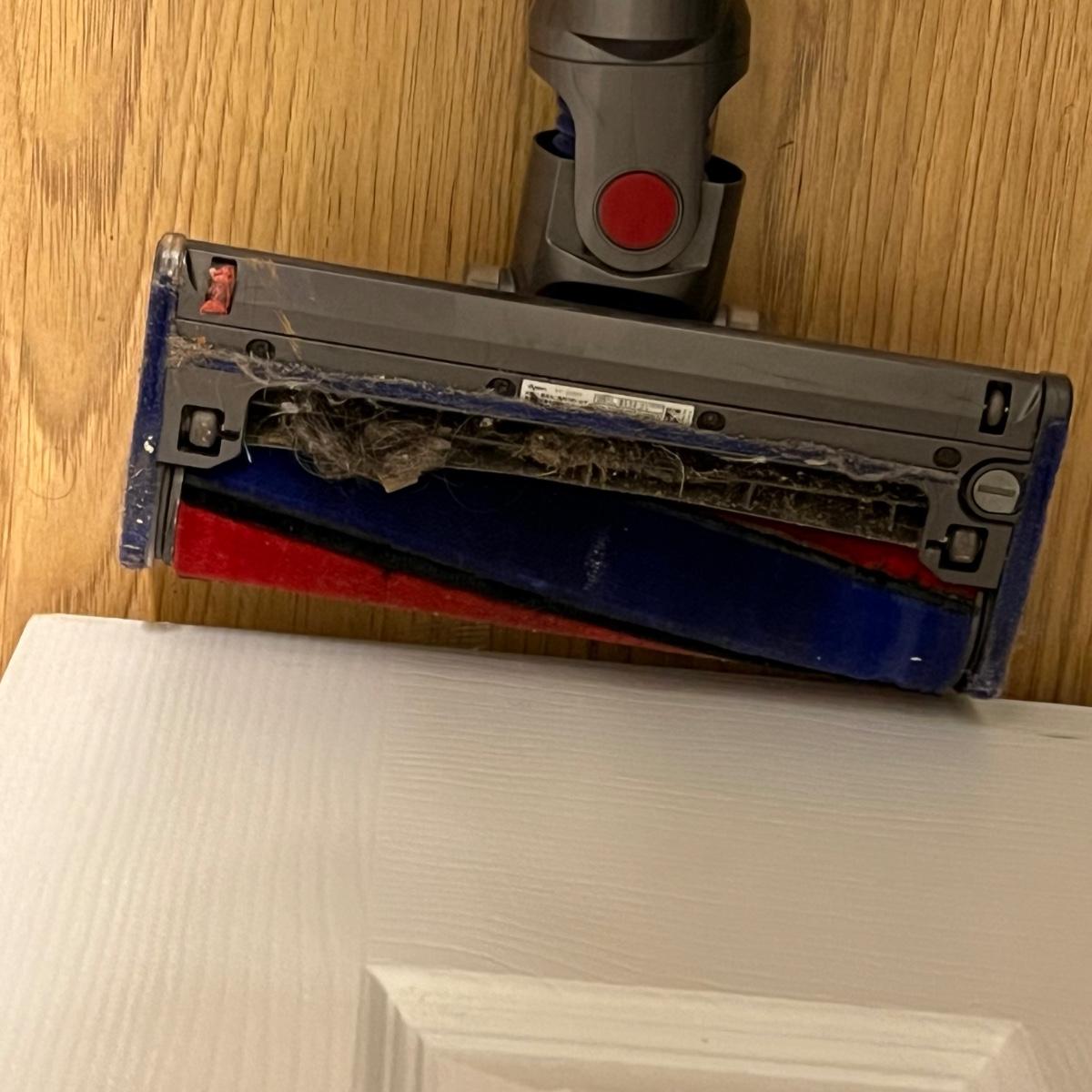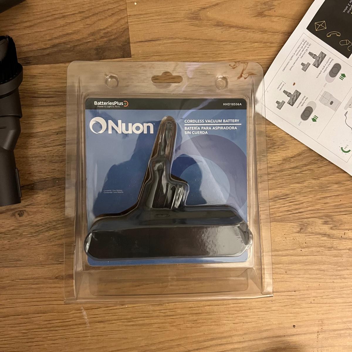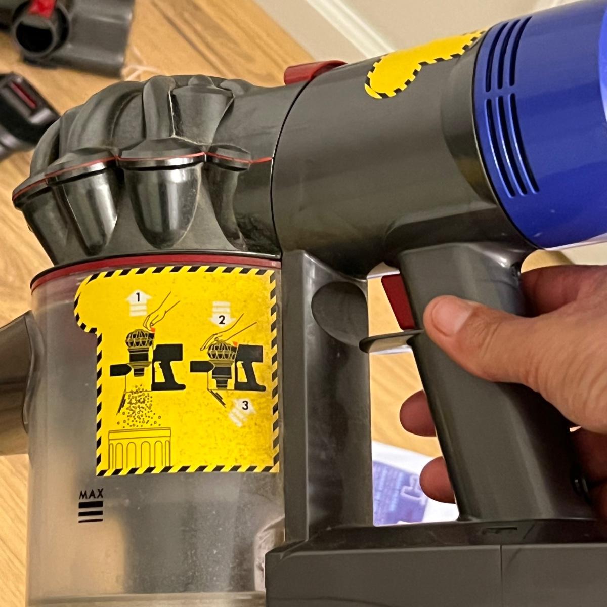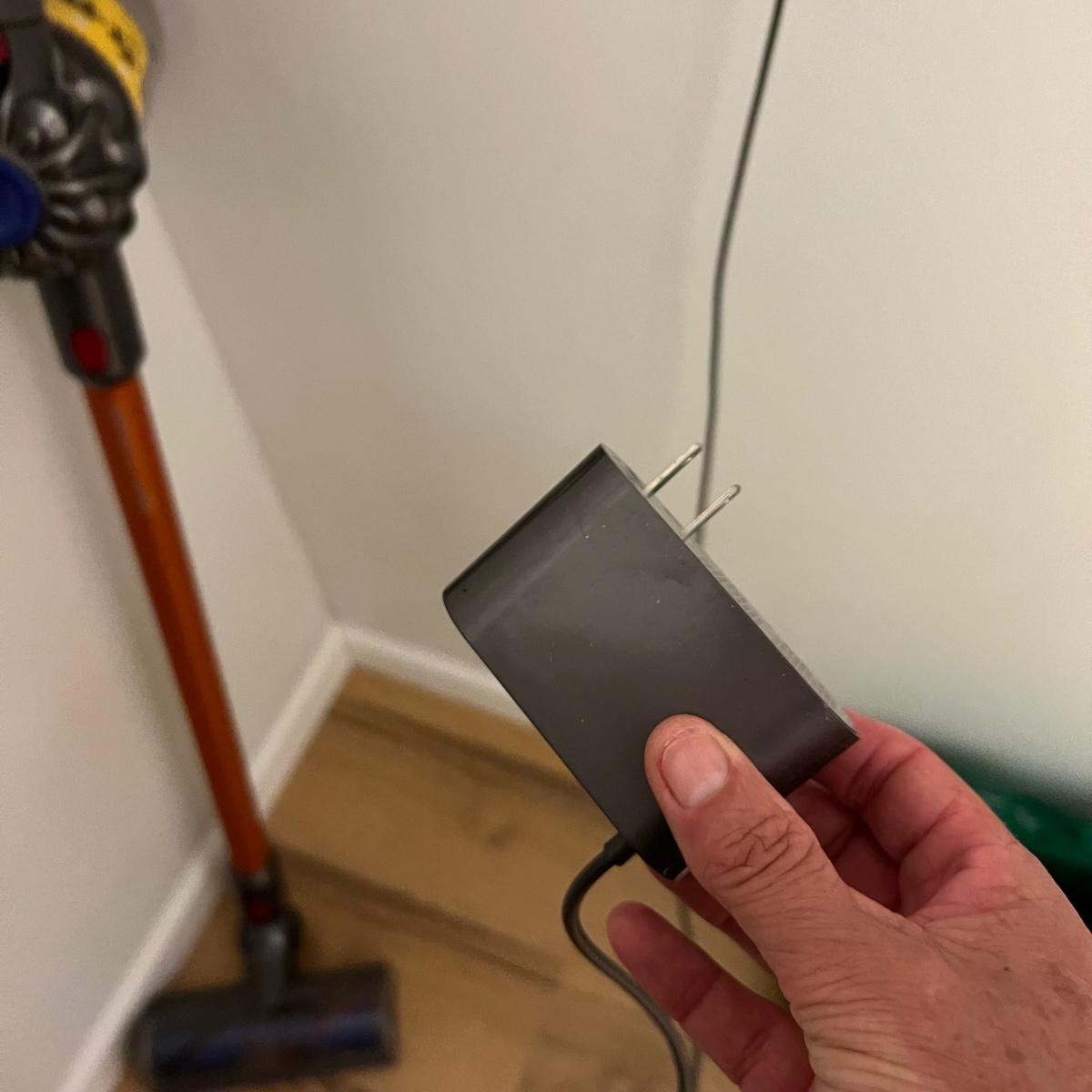 This Dyson V8 cordless vacuum powered on and comes with an extra head plus various smaller heads, an extra unopened battery and manual. Vacuum measures 10” x 50”H. Charging bracket has been dismantled.