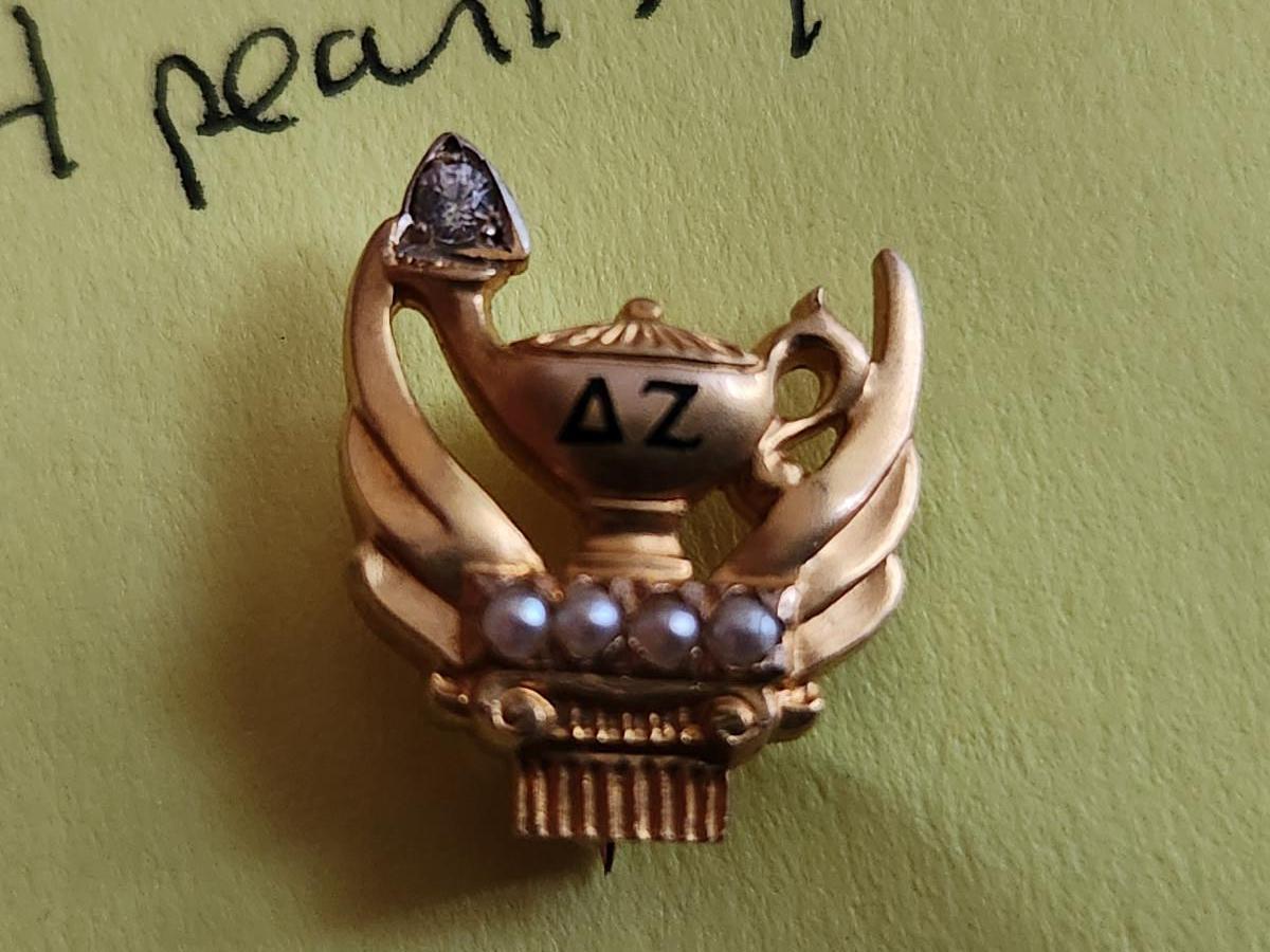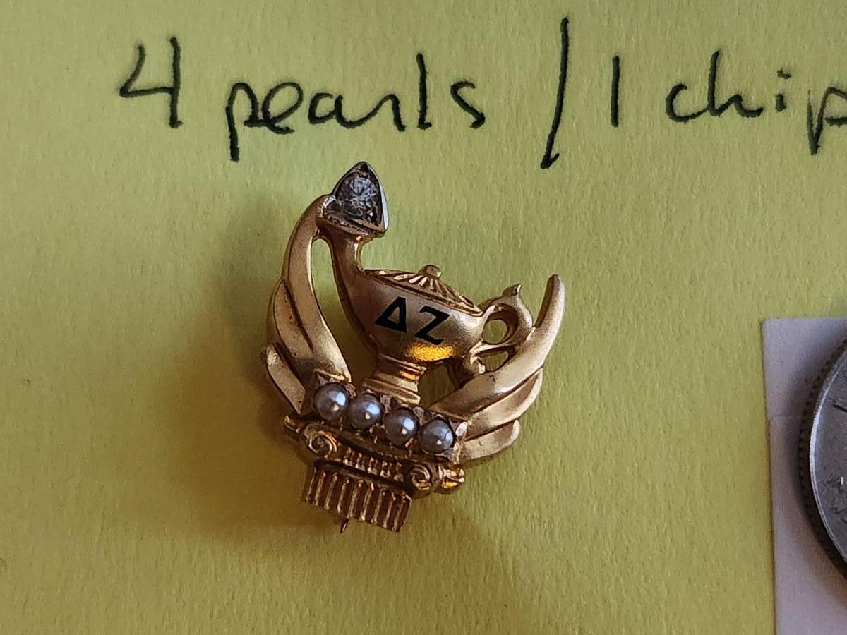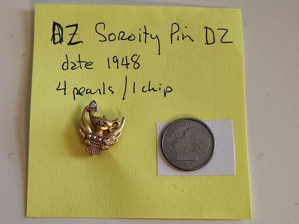 This auction lot is for a DZ Sorority Pin. The pin has 4 pearls and 1 diamond (?) chip. The pin has no metal markings but does have the date of 7-15-1948 engraved on the verso.