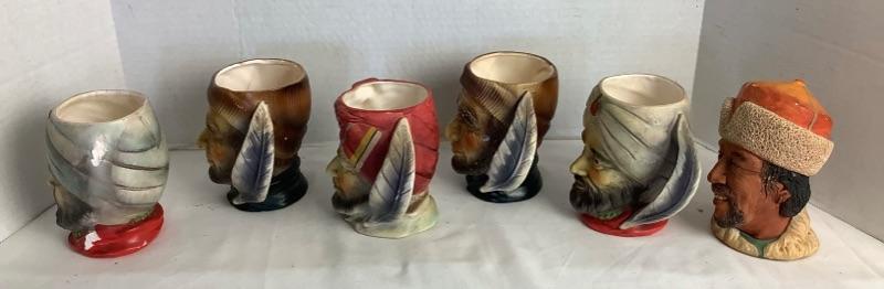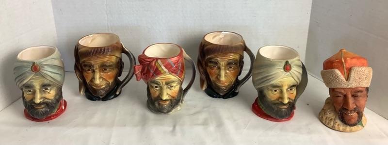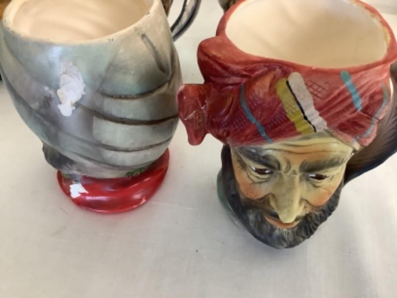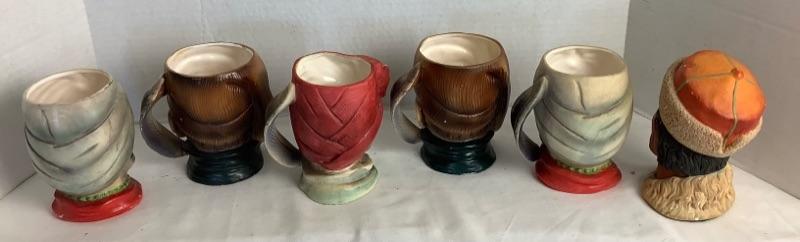 5 Vintage Tilso Japan ceramic character mugs measuring approximately 5-1/4” tall, 1 is missing its handle, 1 has been repaired and some have some minor chips in the paint (see photos). 1 Vintage Bossons English artware chalkware head measures 5-1/2” tall and has some minor chips in paint (see photos)