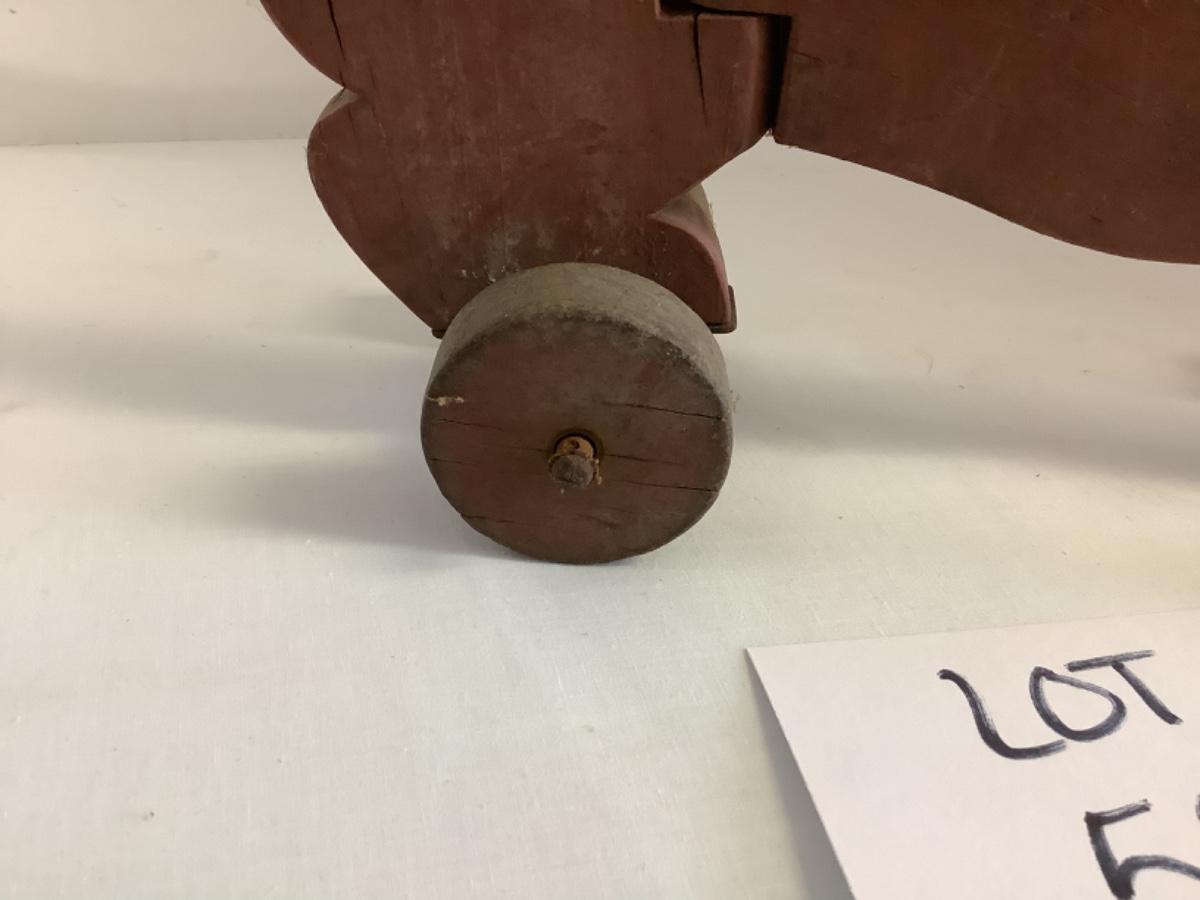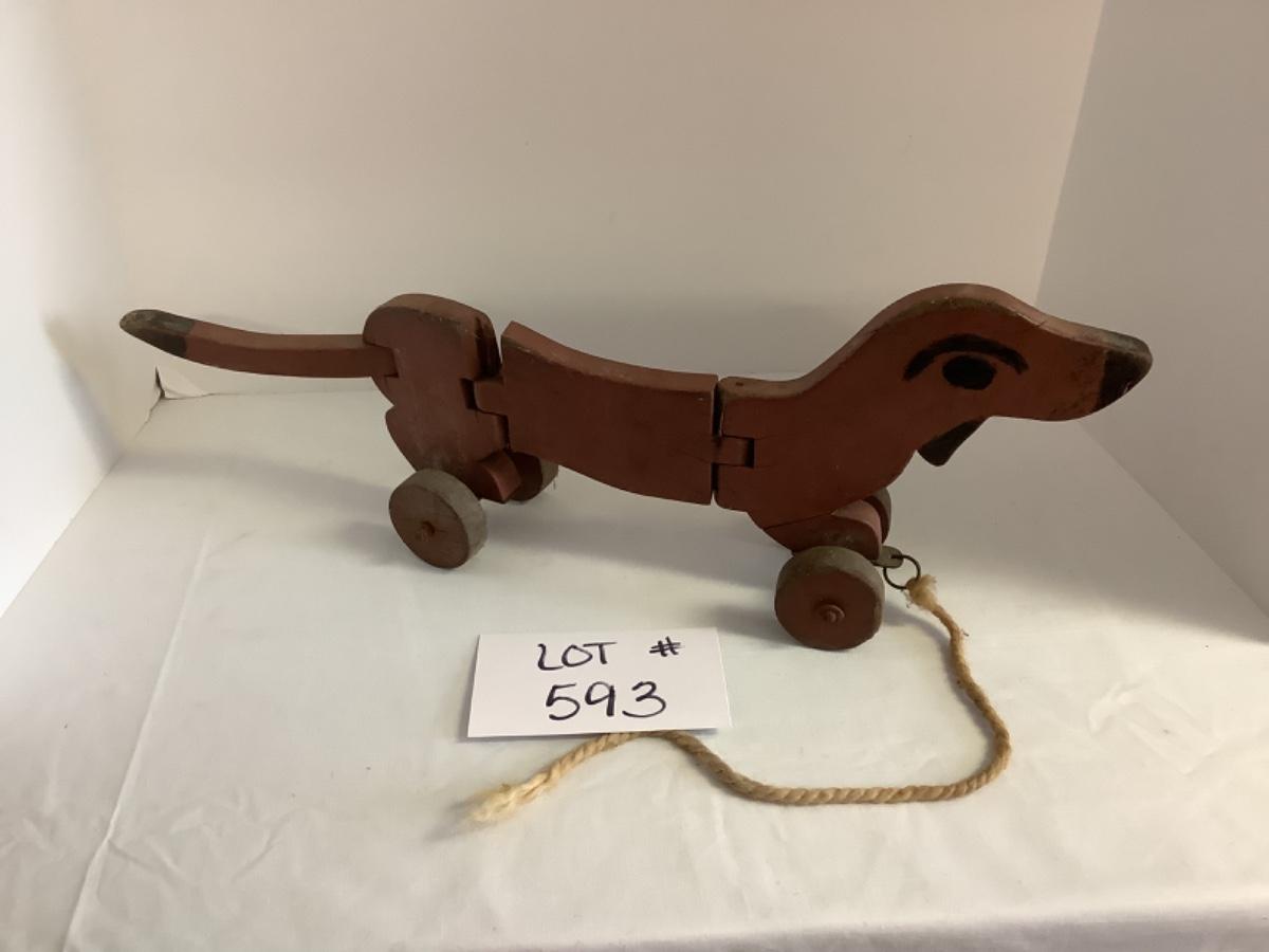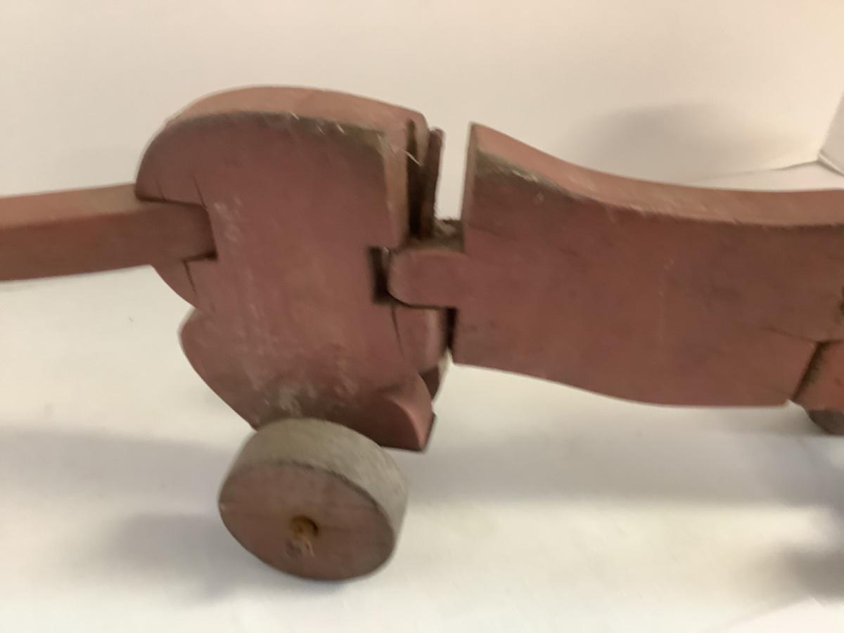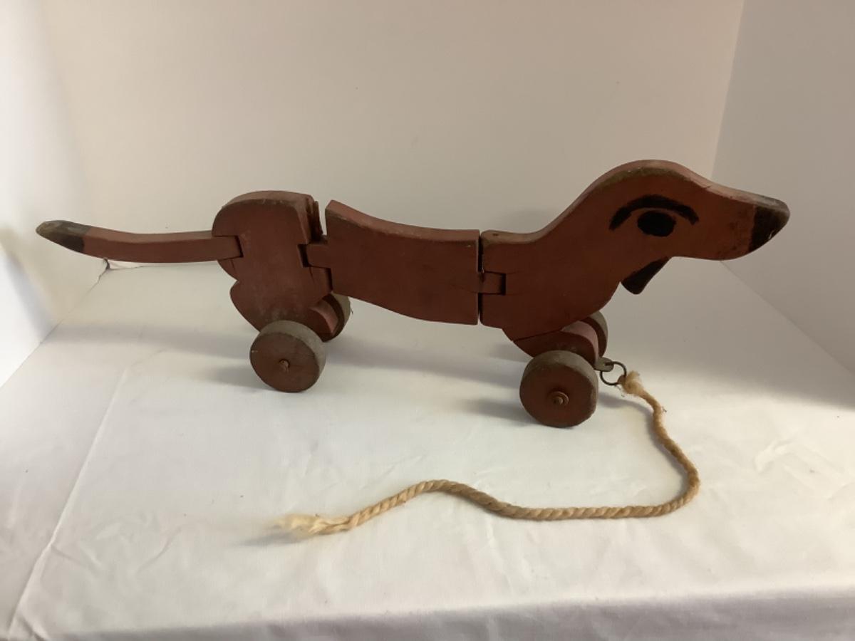 E - 593 Vintage Wooden Hinged Pull Toy, Dachshund Dog