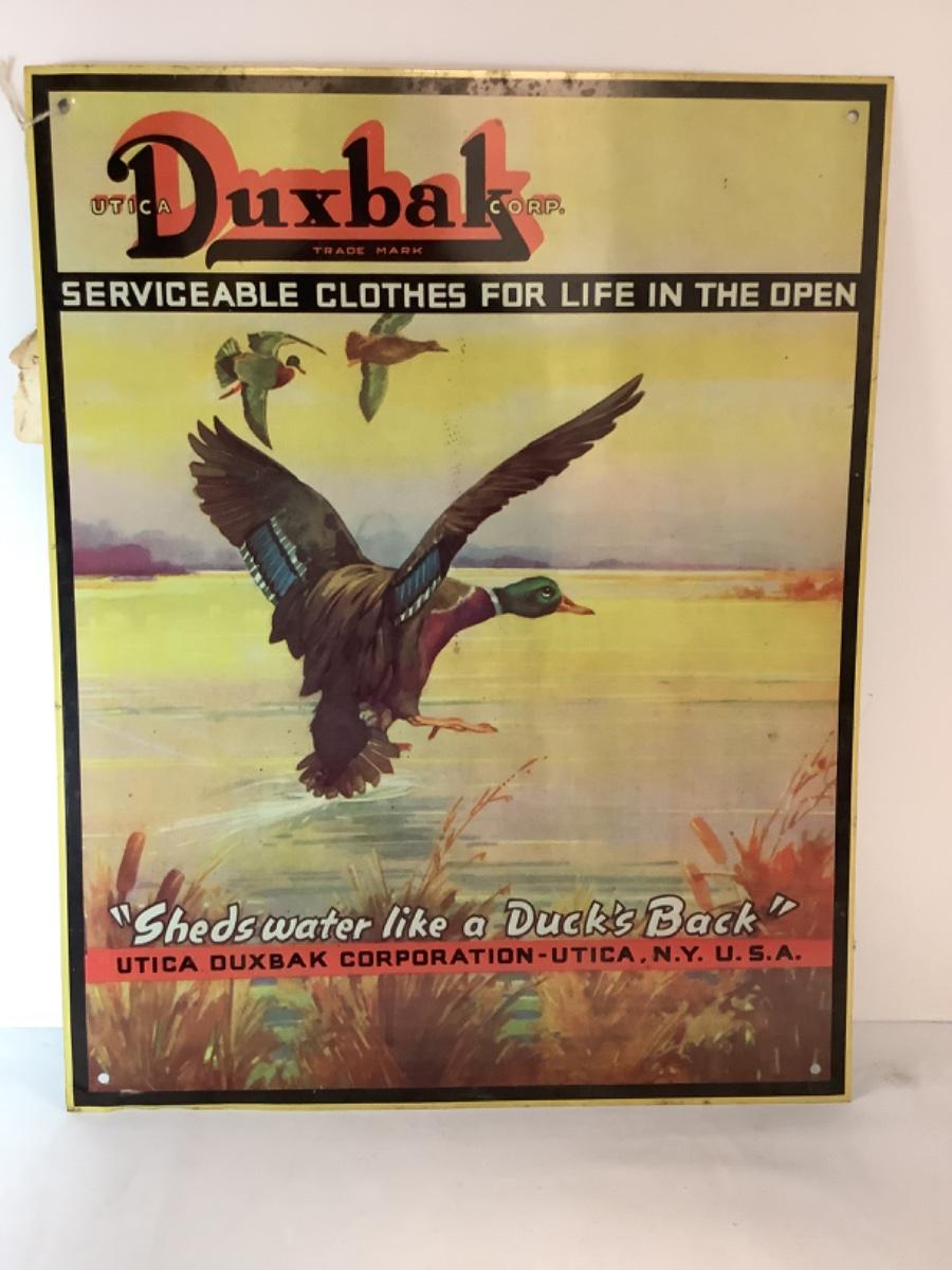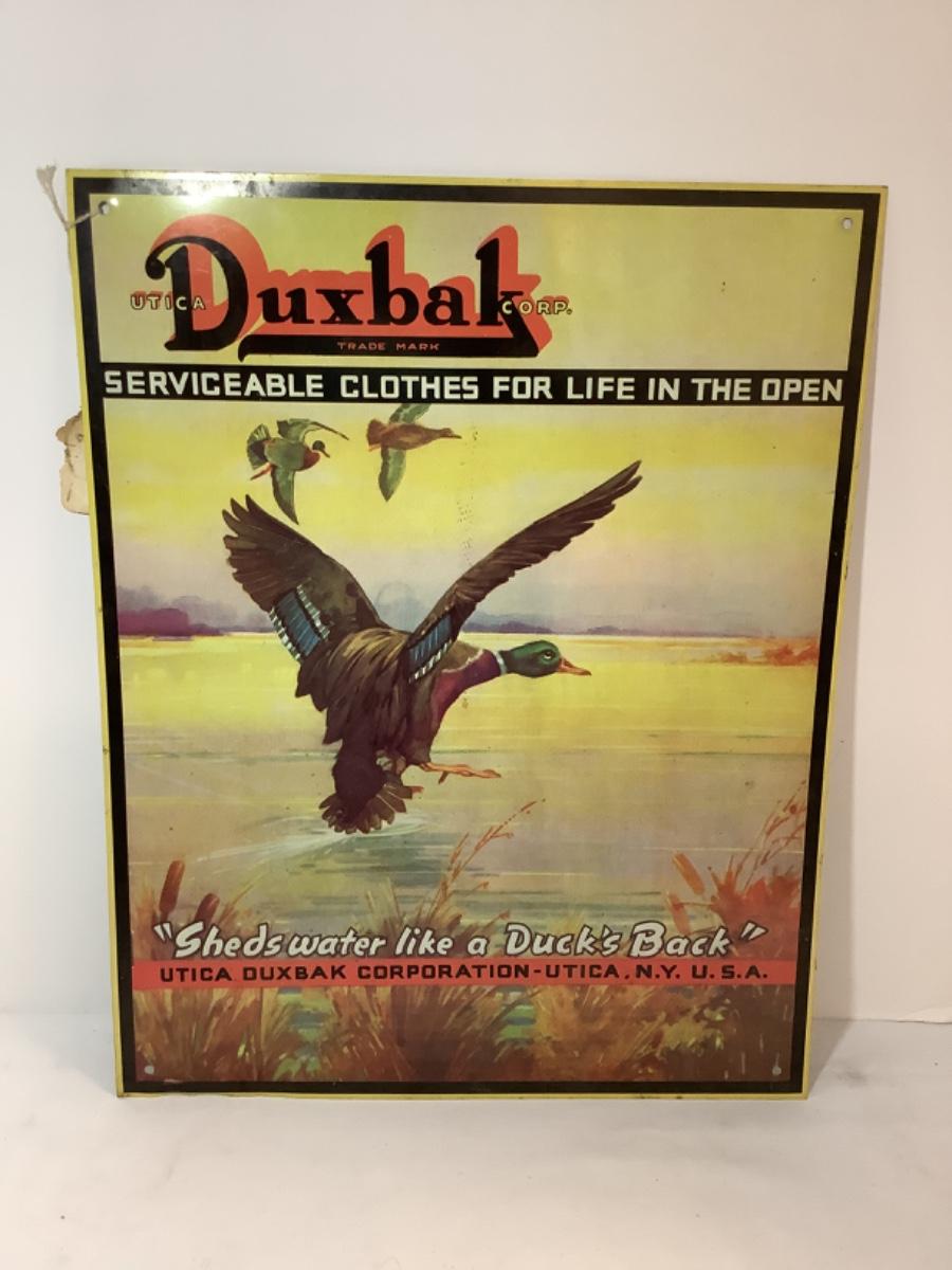 Vintage DUXBAK Metal Tin Sign Hunting Clothes