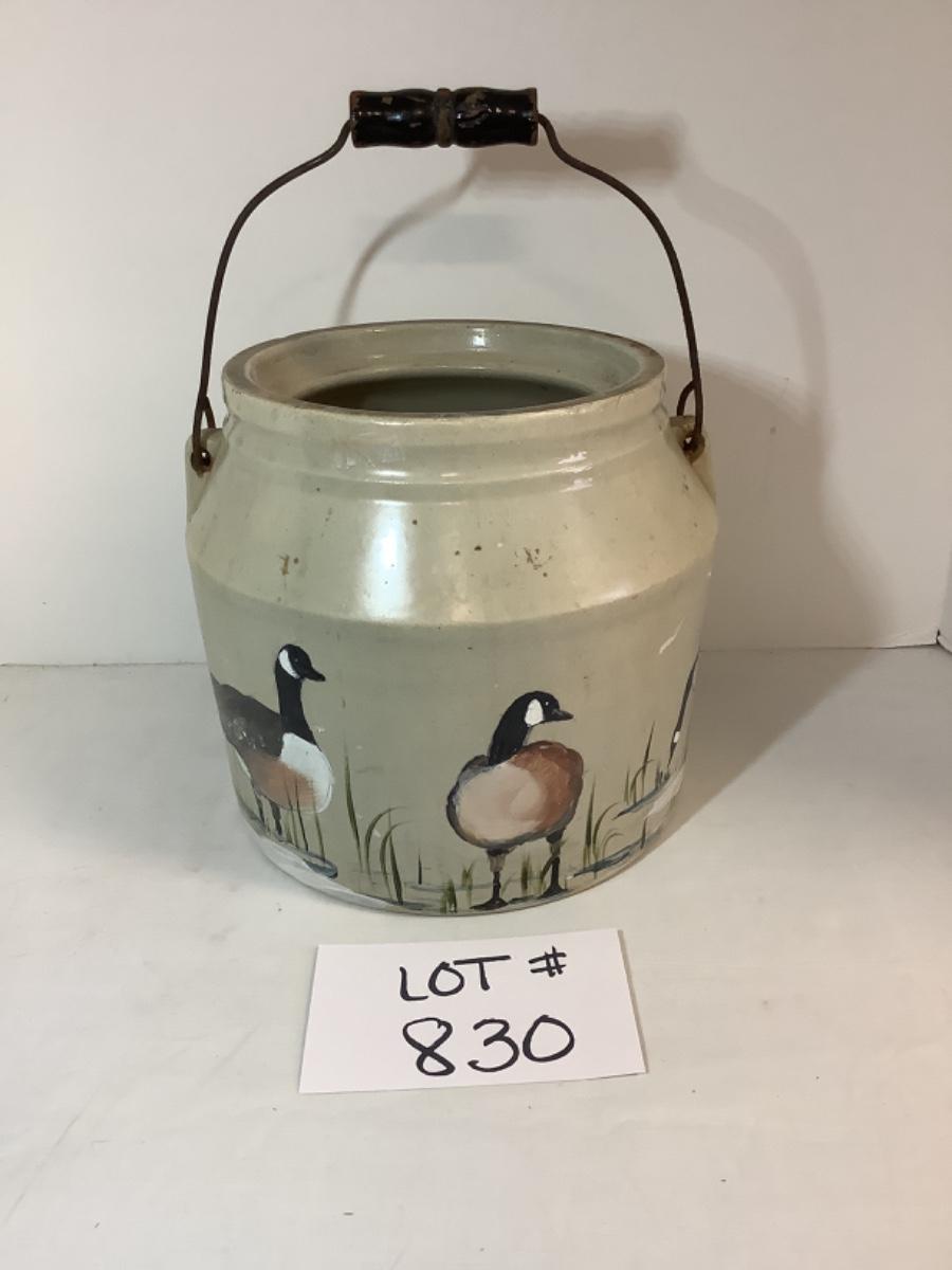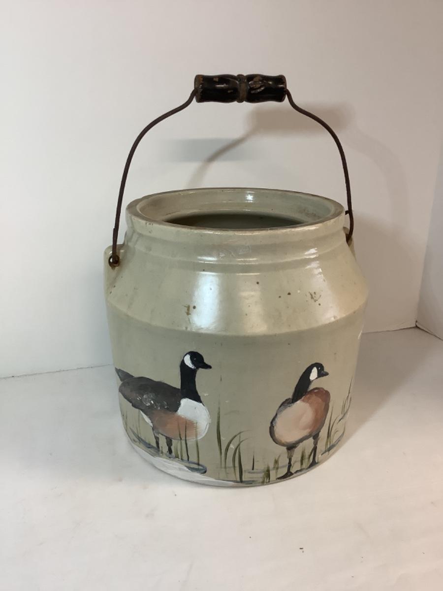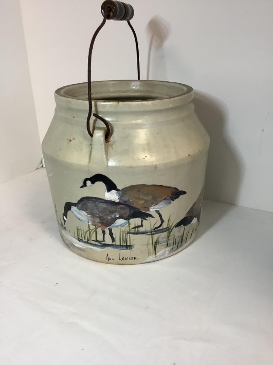 E - 830 Antique Hand Painted Handled Stoneware Food Crock by Ann Lanier