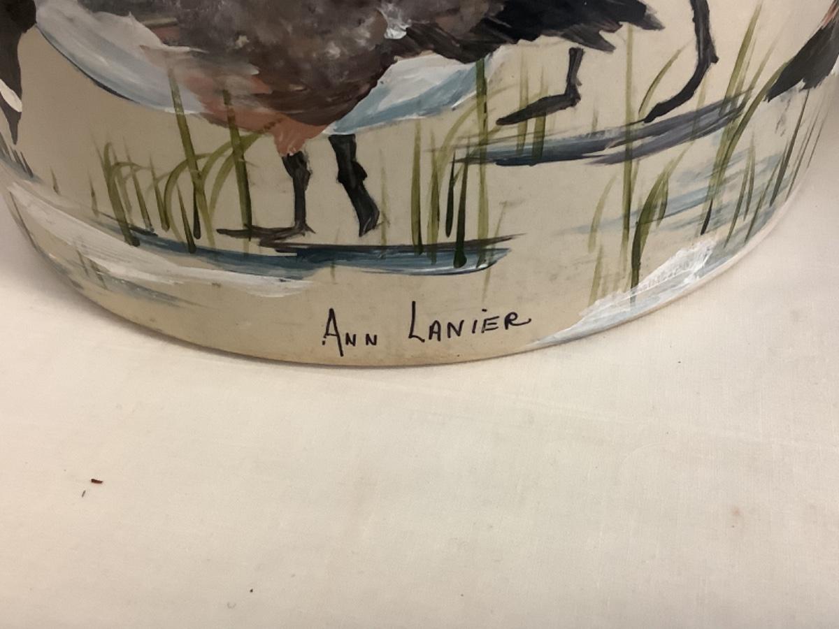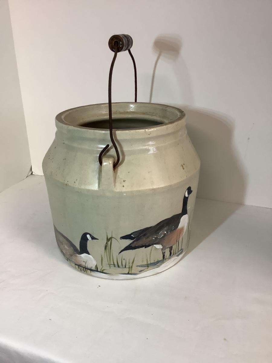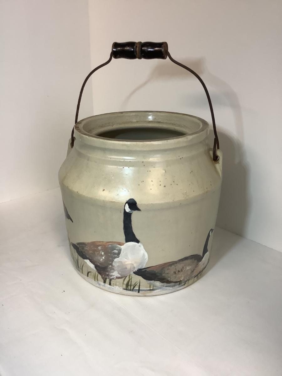 E - 830 Antique Hand Painted Handled Stoneware Food Crock by Ann Lanier