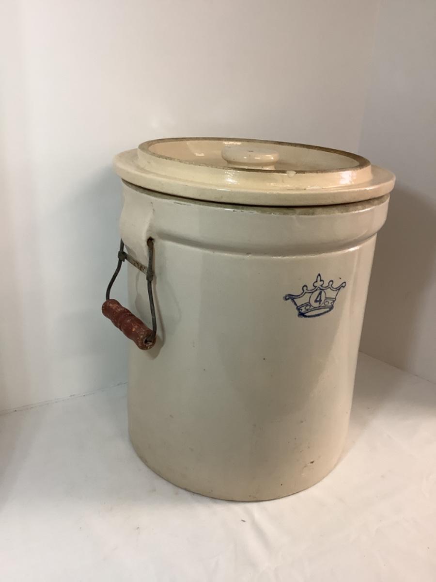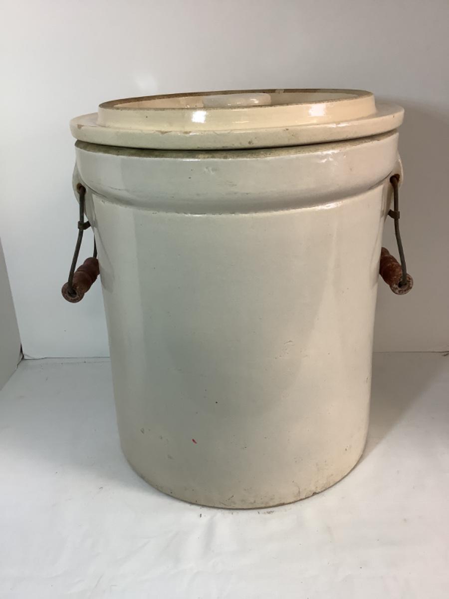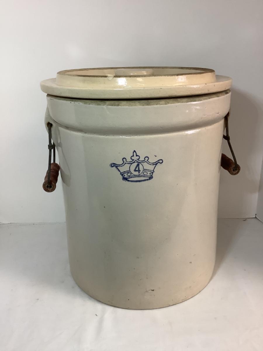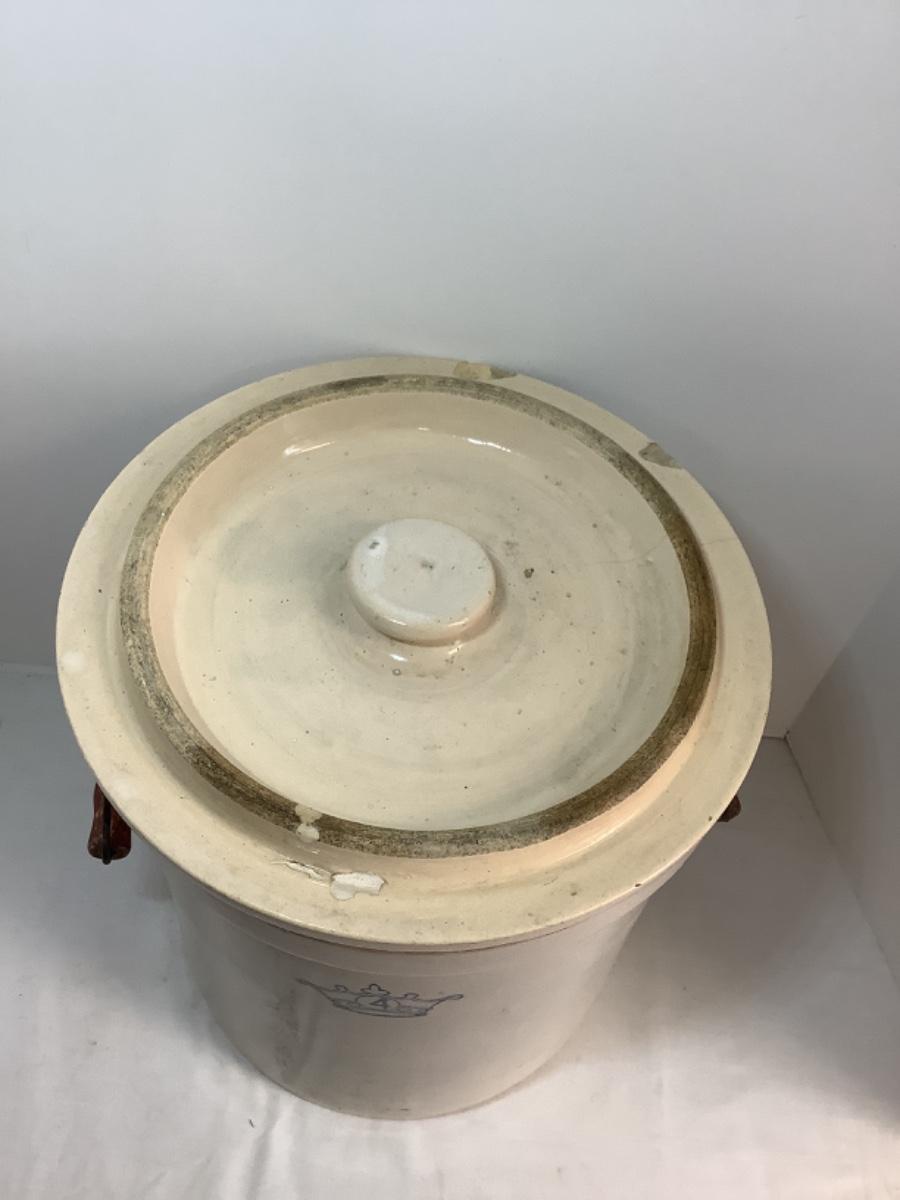 Large Ransbottom Brothers Four Gallon Stoneware Crock with Lid & Wooden Handles