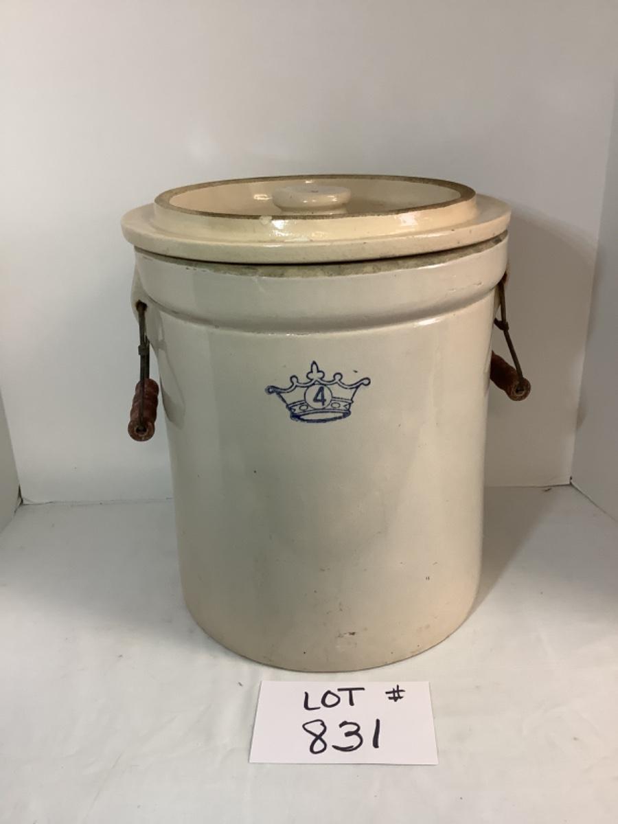 E - 831 Large Ransbottom Brothers Four Gallon Stoneware Crock with Lid & Wooden Handles