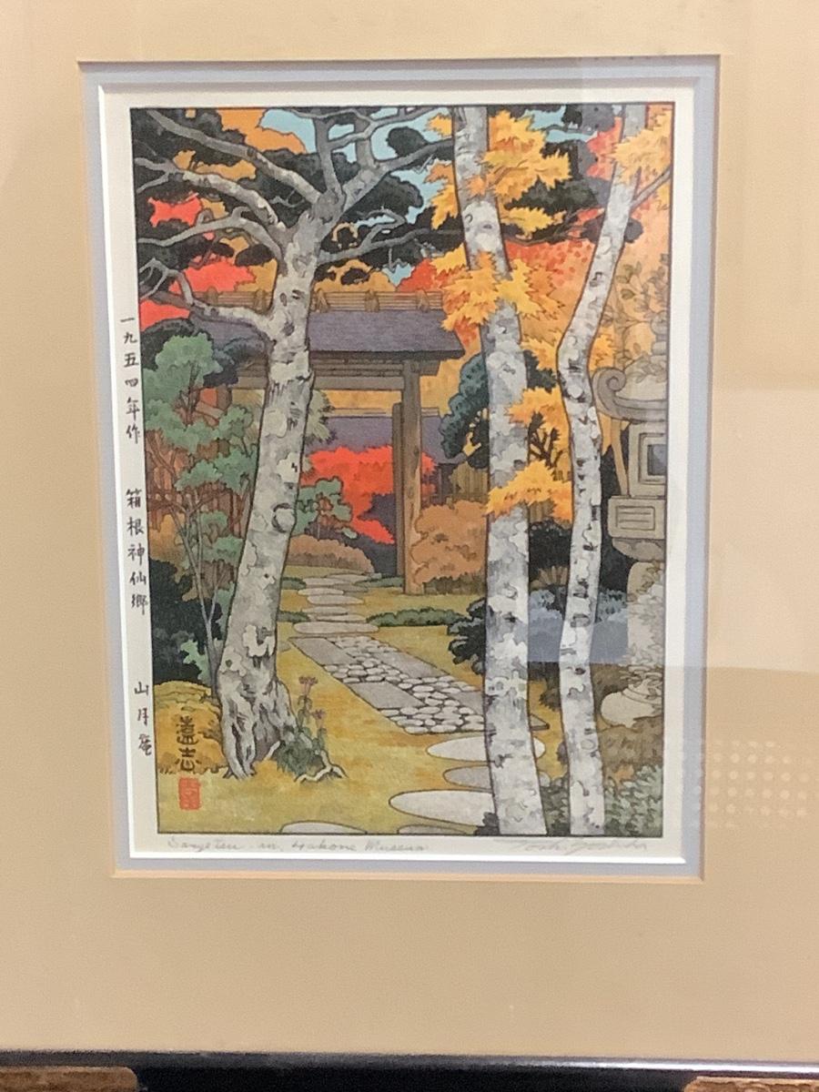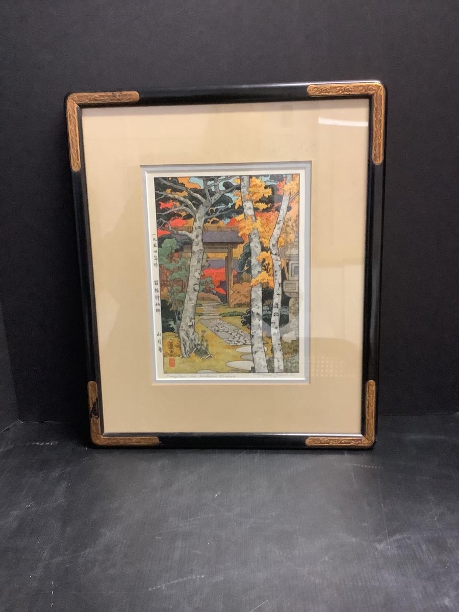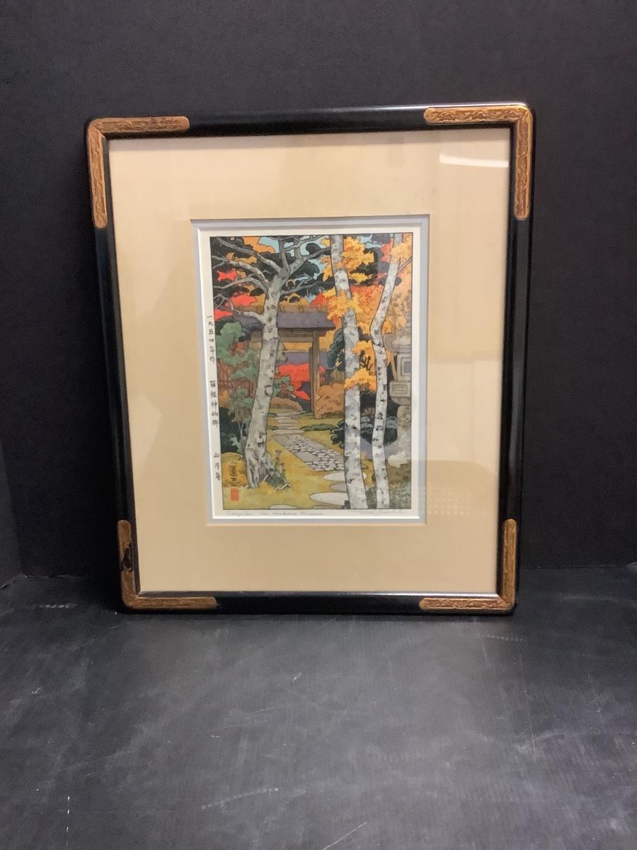 Measuring 14.25" wide x 17" high framed Toshi Yoshida - Toshi Yoshida was the son of Hiroshi Yoshida, one of the most famous woodblock print artists of the twentieth century. He followed the family tradition and centuries-old Japanese craft of woodblock printmaking, adopting and developing his signature style. His close relationship with his father was instrumental in the pursuit of his art. Together, father and son traveled Japan and the globe, examining and sketching the people and places around them. Although Yoshida's prints span a wide range of subjects, he is most well known for his lovely portrayals of everyday life in Japan and the beautiful countryside. His works often include the human element, adding a sense of scale and a personal quality to his remarkable landscapes. Softly colored and masterfully composed, Toshi Yoshida's evocative woodblock prints capture the beauty of Japan in his own unique style.