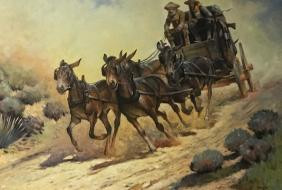 Description: Original, dramatic oil rendering of a thundering stagecoach drawn by four horses; signed by E. Nourse. Material: Canvas; wood. Measurement: approximate 41"w x 29" h in frame/ painting, approximate 38" x 26" (INCHES). Shipping cost: $150. Different rate to Hawaii, Alaska & California; International rate applies.