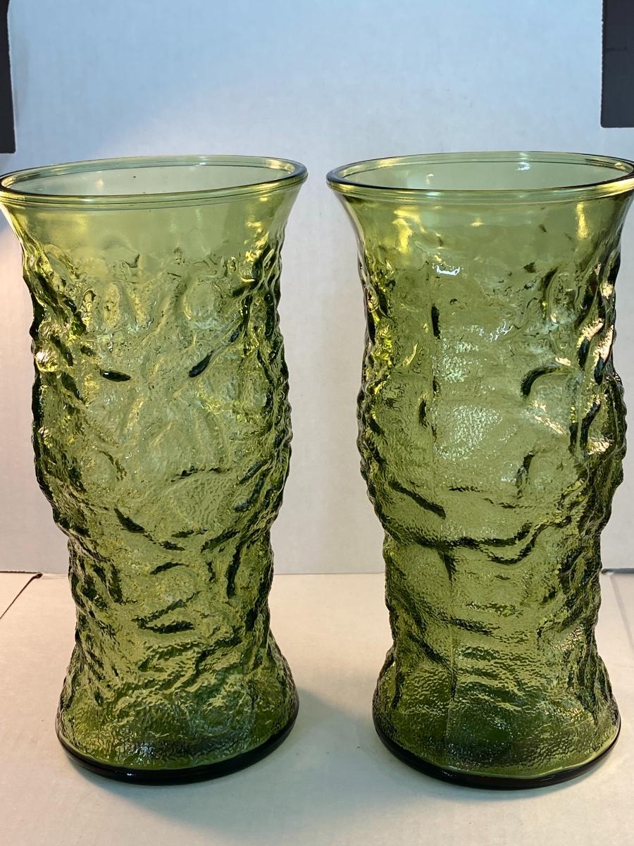 Vintage crinkle avocado green pair, E O Brody pressed glass vases. Ten inches in height in perfect condition