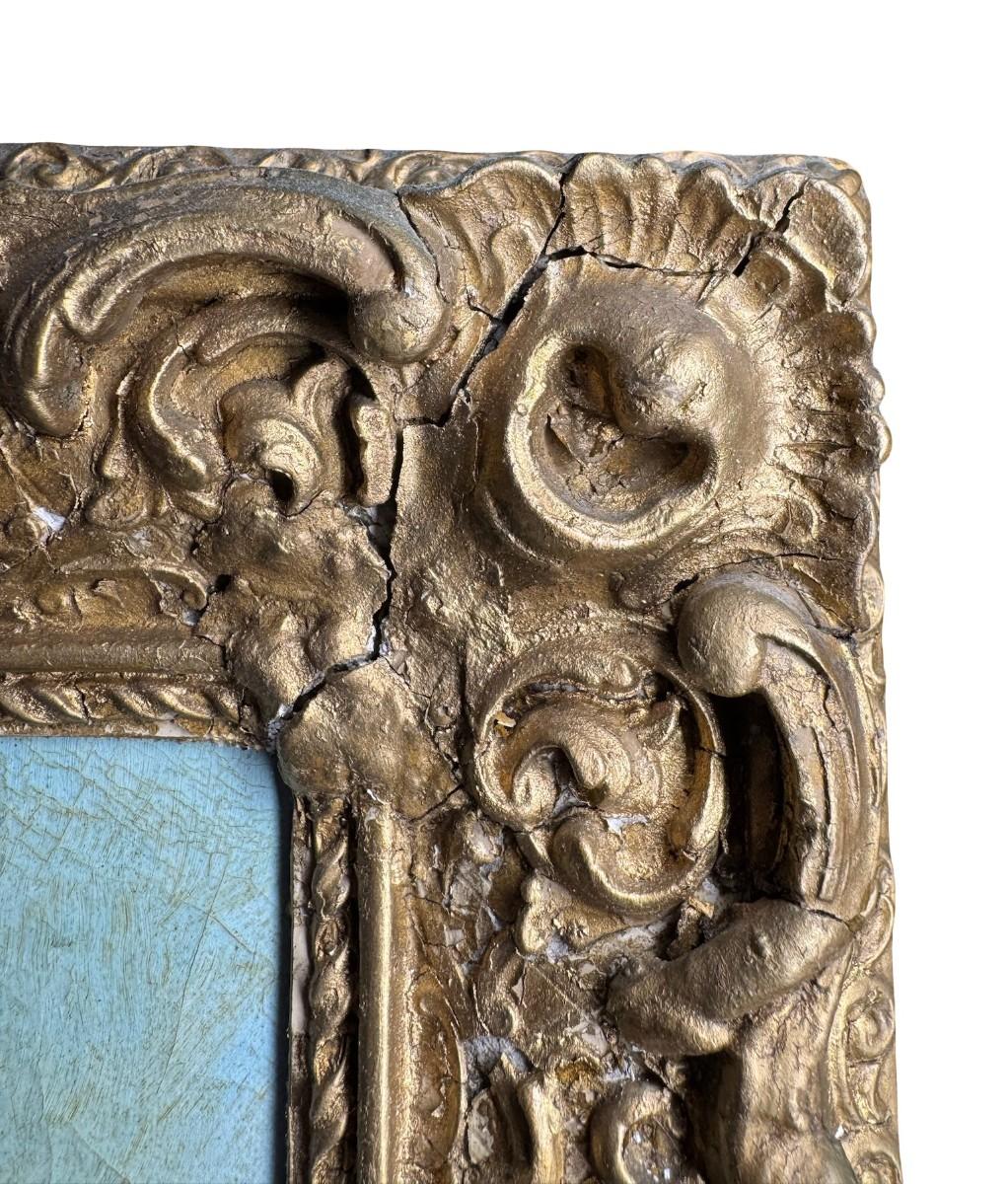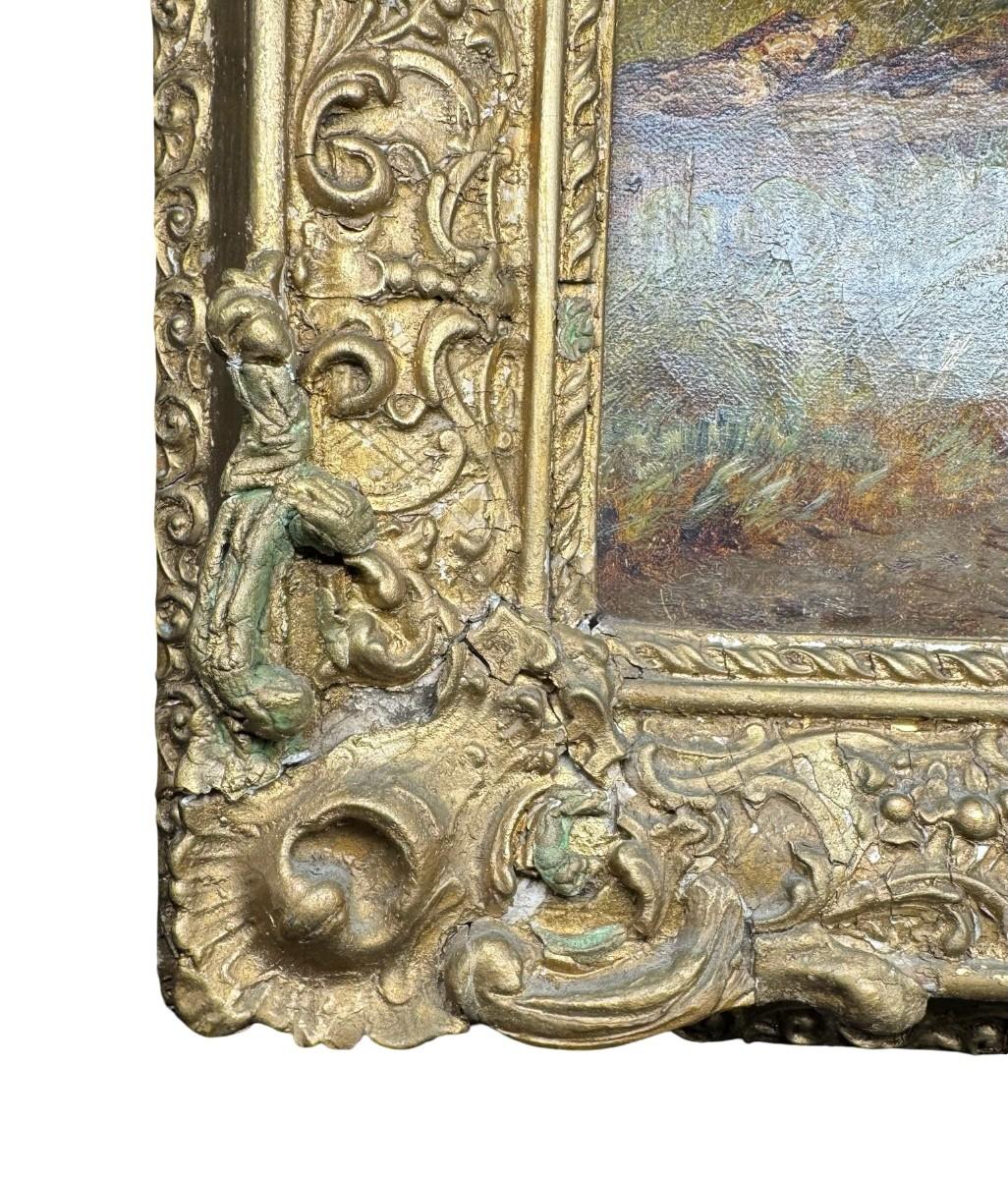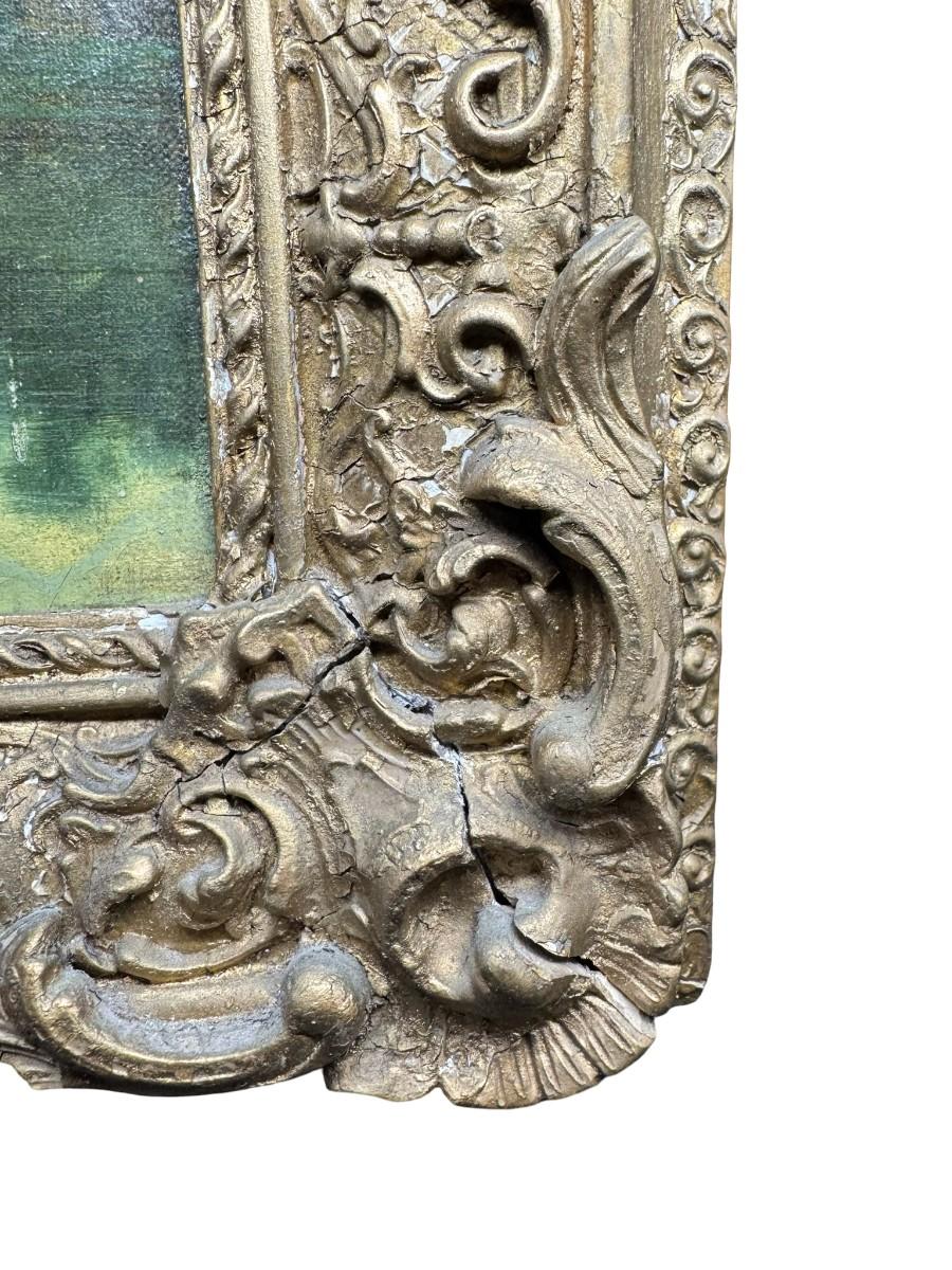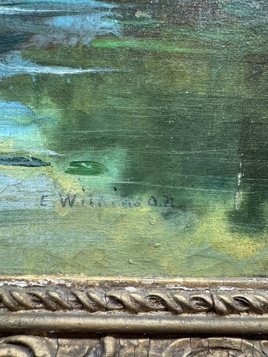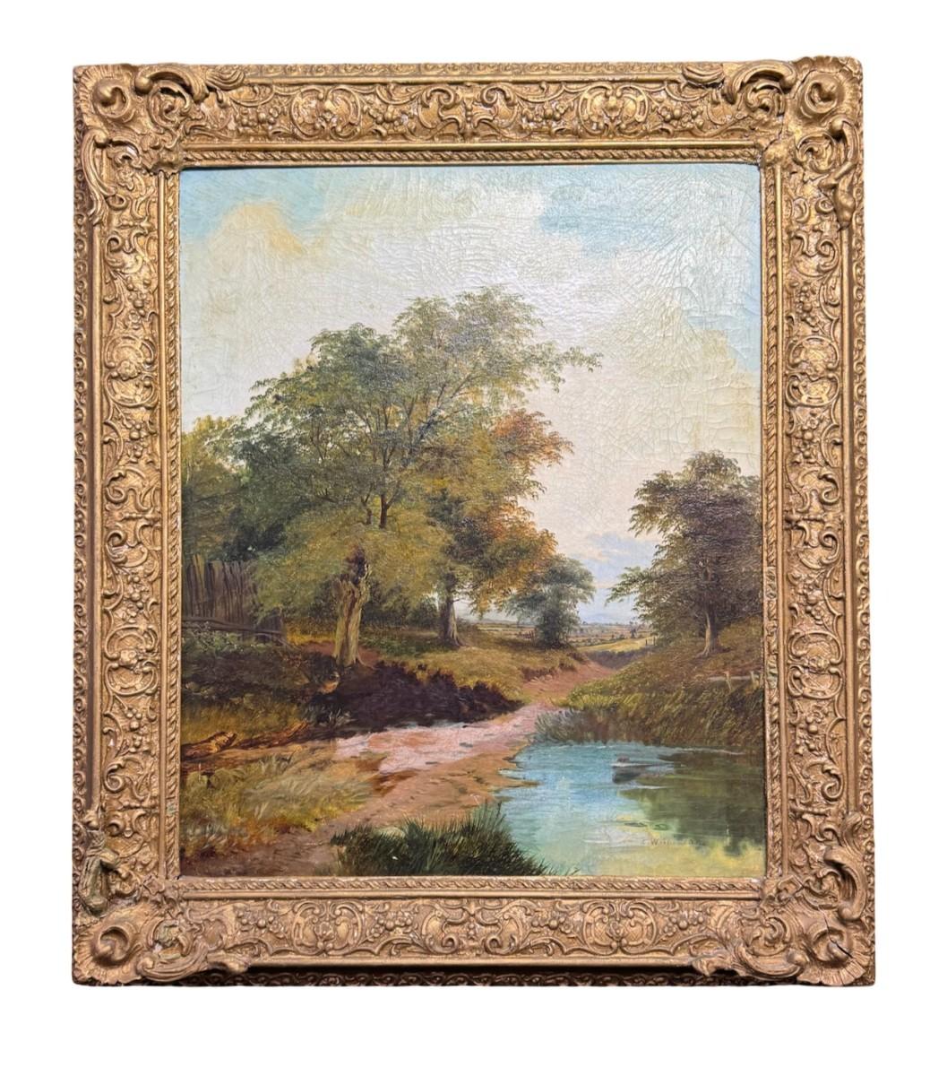 Wilkinson was an English artist known for his landscapes often depicting a water source in the foreground. This piece has craquelure throughout. The gesso appears to have been repaired in areas on the frame. Measurement: 26”H x 24”W. [JP]