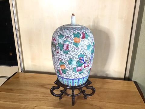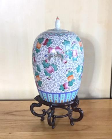 E102 - Lg. Oriental Porcelain Ginger Jar w/ Wooden Stand   #2