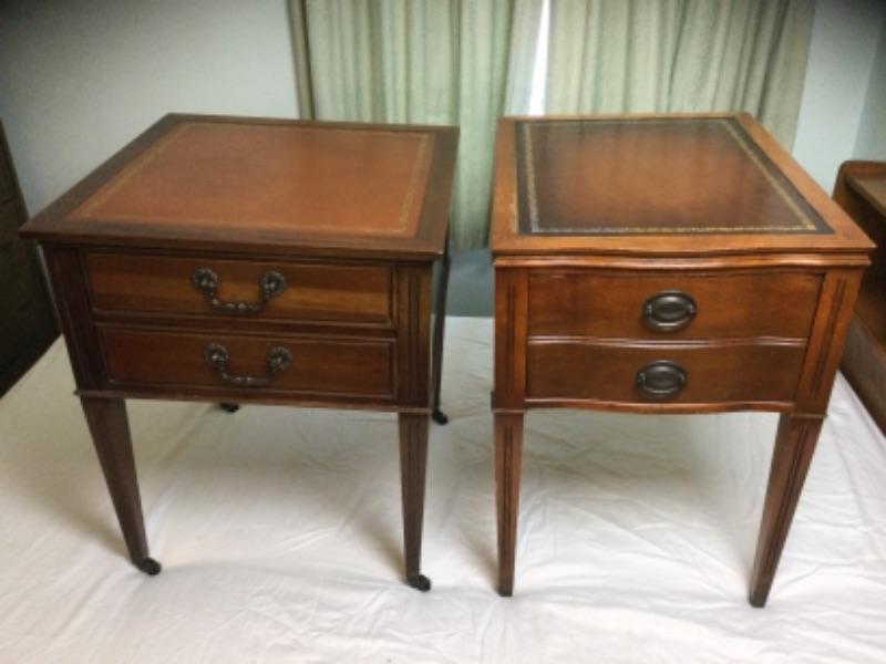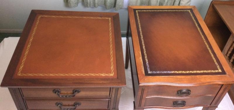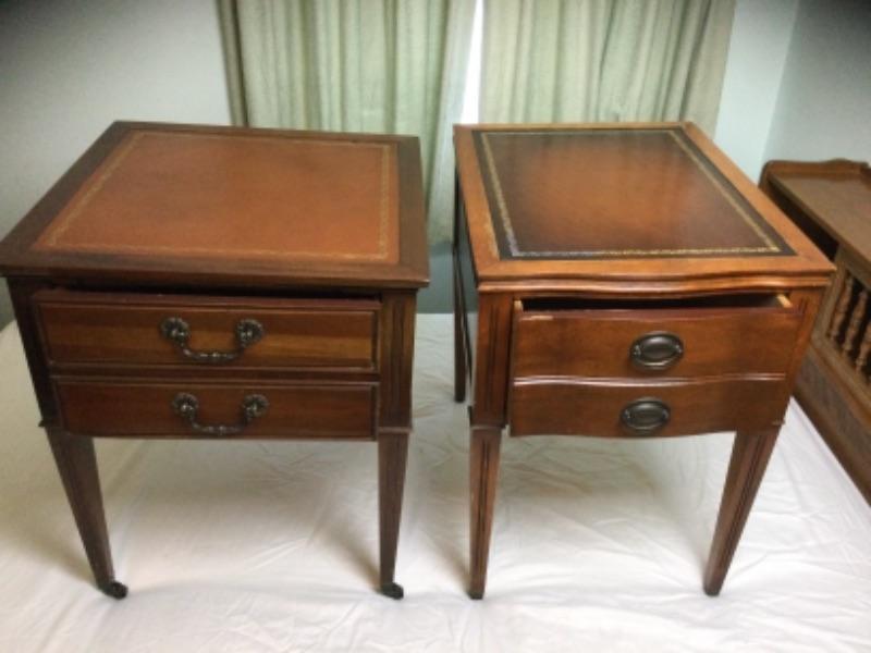 One stand is solid Cherry and has wheels, the other one is Cherry stained. Both stands have a single drawer