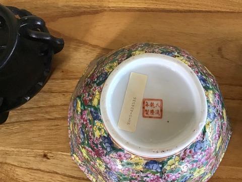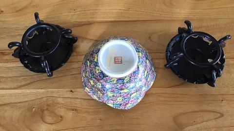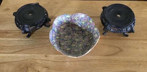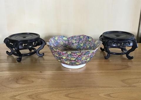E110 - Asian Floral Bowl w/ 2 Wooden Display Stands