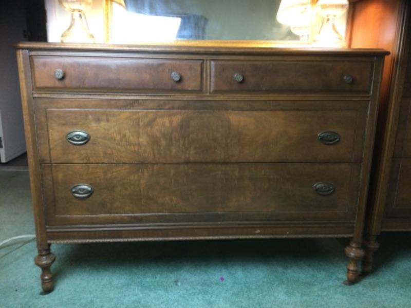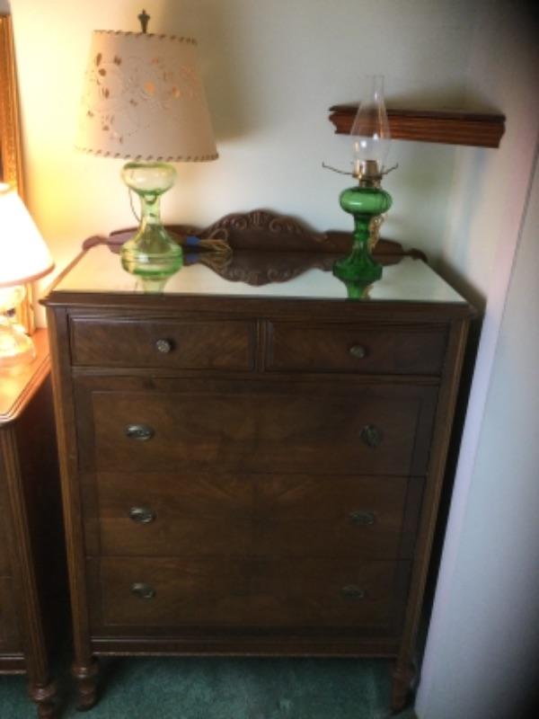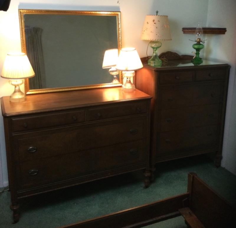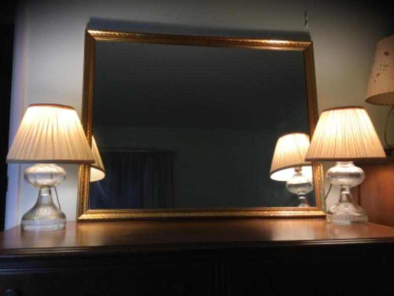 Pair of depression dressers made of Poplar with veneer. Four drawer long dresser 48” long x 35” high x 20” deep, Five drawer tall dresser 50” high x 34” wide x 18” deep. Gold over dresser mirror 36” x 28”. Pair of clear glass lamps. Pair of Green electric oil lamps
