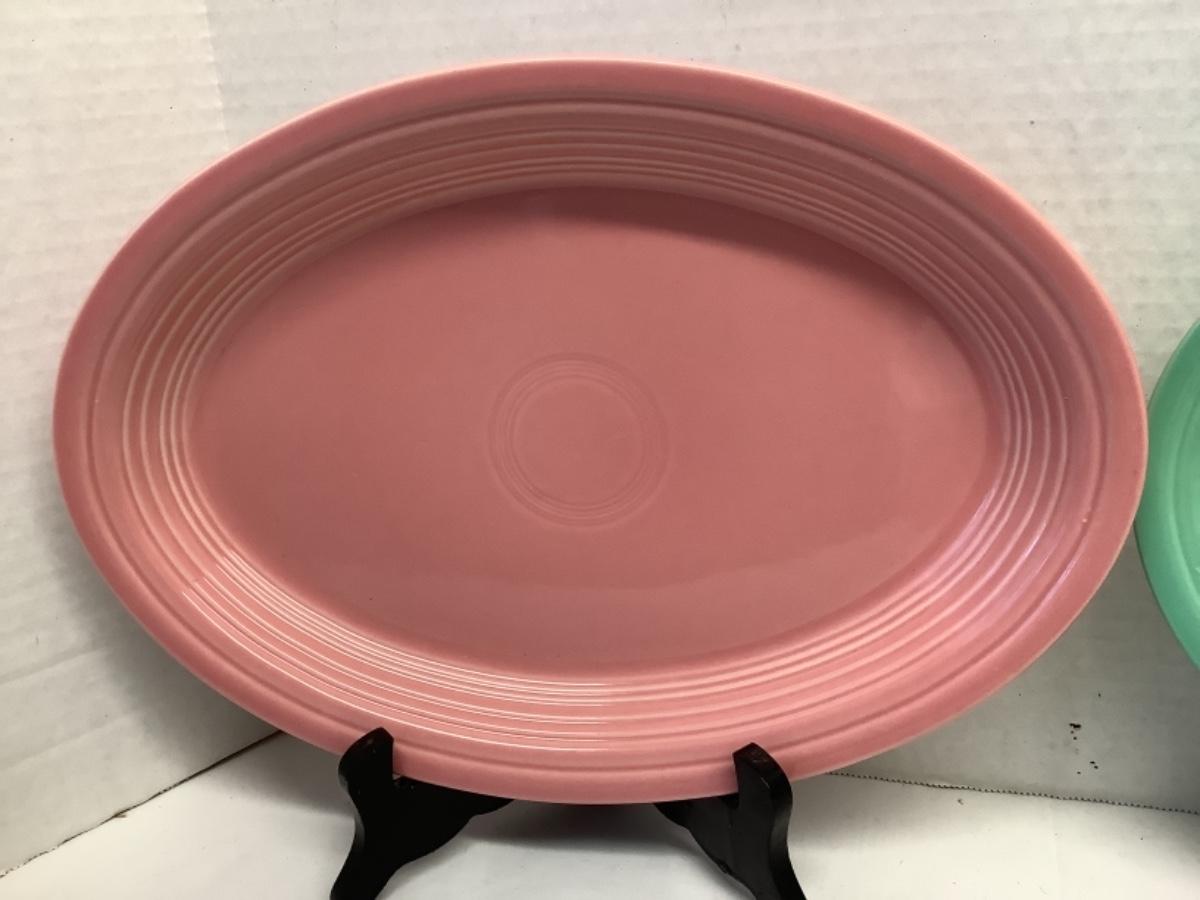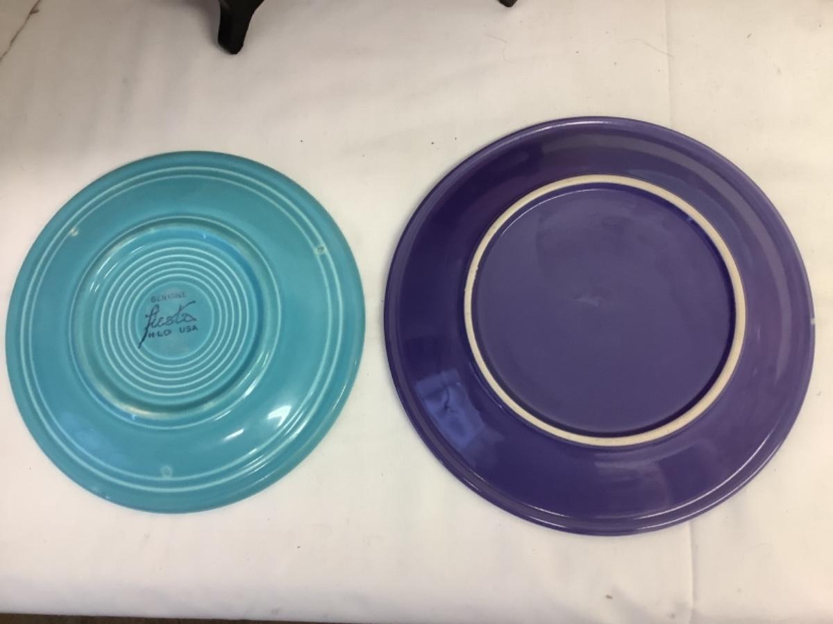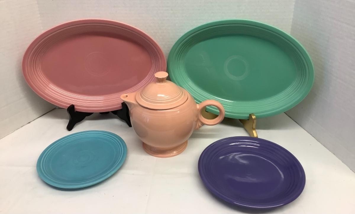 5 pieces of vintage Fiesta Ware, 2 oval platters measuring 13-1/2” long and 9-1/2” wide, Tea pot measures 7-1/2” high including lid and 9-1/2” from handle to spout, Blue plate measures 7-1/4” round, purple plate measures 801/4” round and is not marked Fiesta.