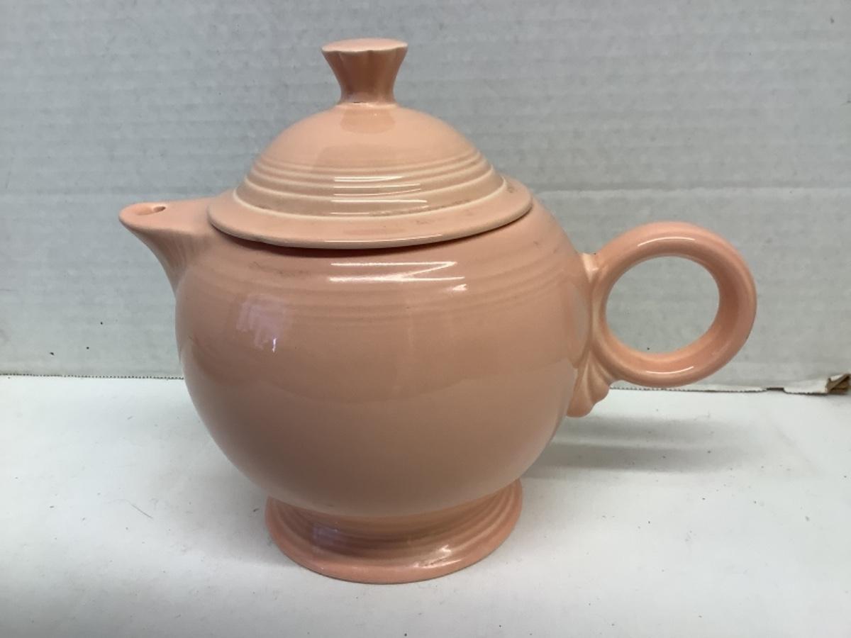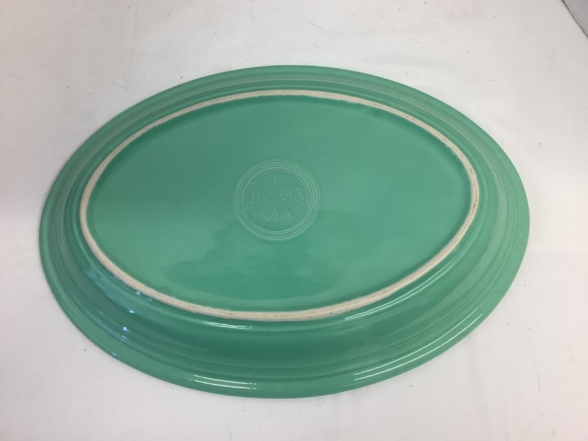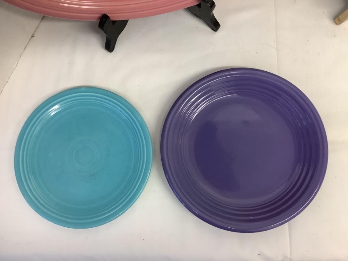5 pieces of vintage Fiesta Ware, 2 oval platters measuring 13-1/2” long and 9-1/2” wide, Tea pot measures 7-1/2” high including lid and 9-1/2” from handle to spout, Blue plate measures 7-1/4” round, purple plate measures 801/4” round and is not marked Fiesta.