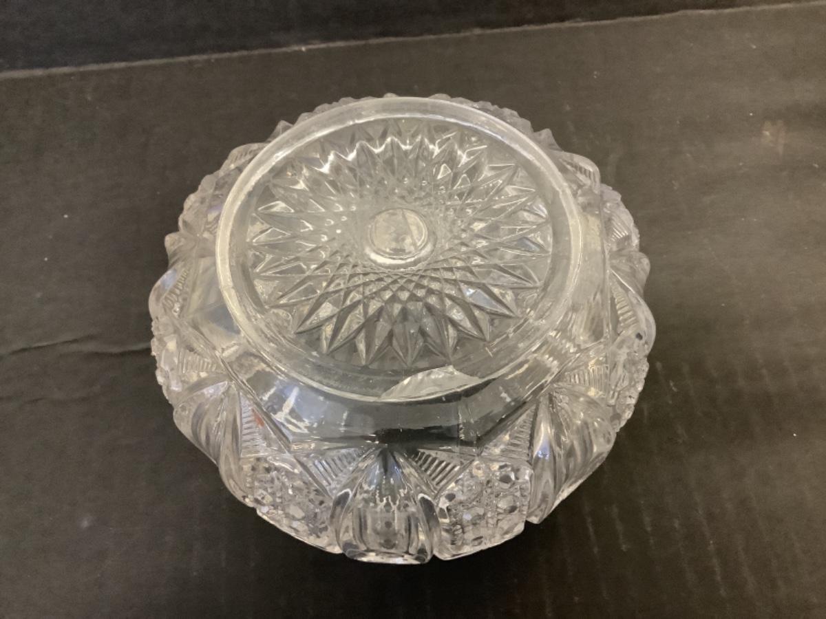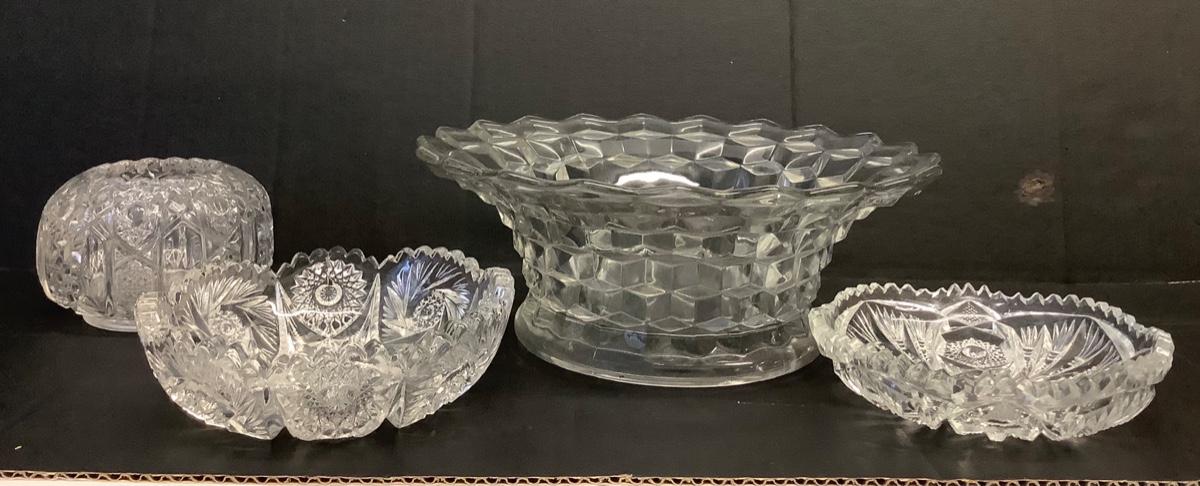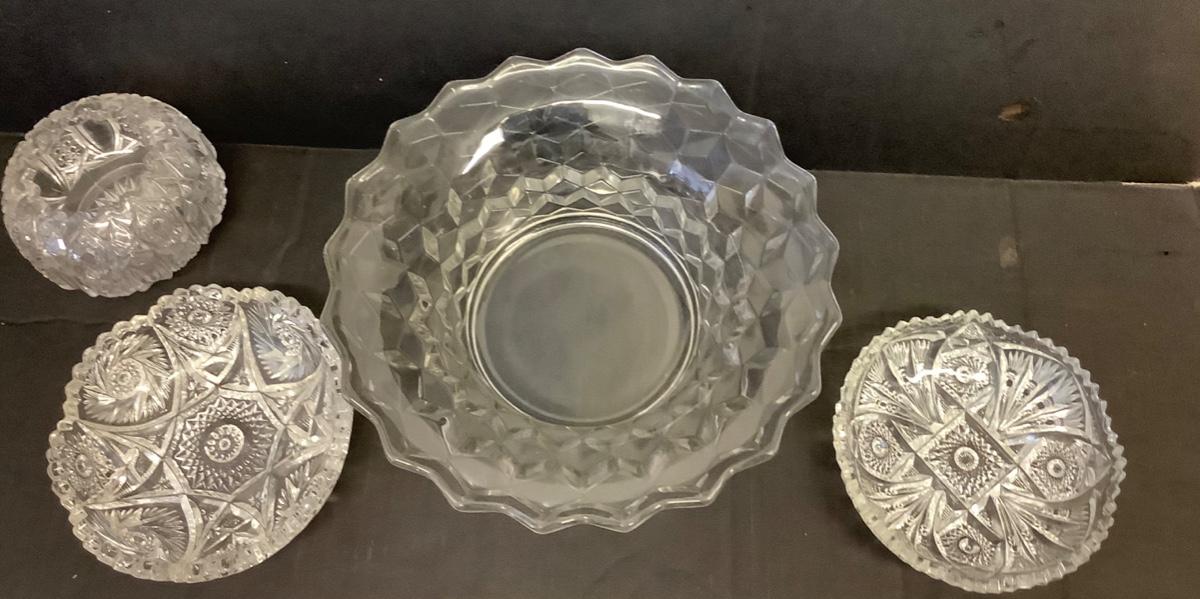 Large pressed glass serving bowl measures 11” round and 4-1/2” deep, small pressed glass dish has a chip on the bottom, two cut glass bowls in excellent condition