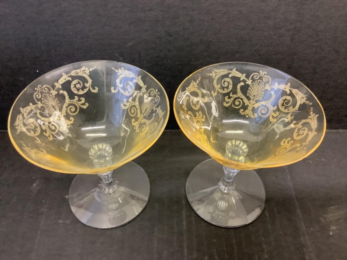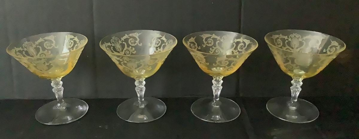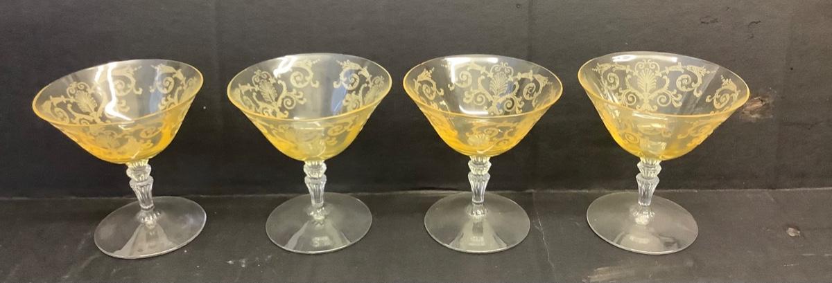 E1238 Set of 4 Vintage Yellow Etched Glass Champagne Glasses