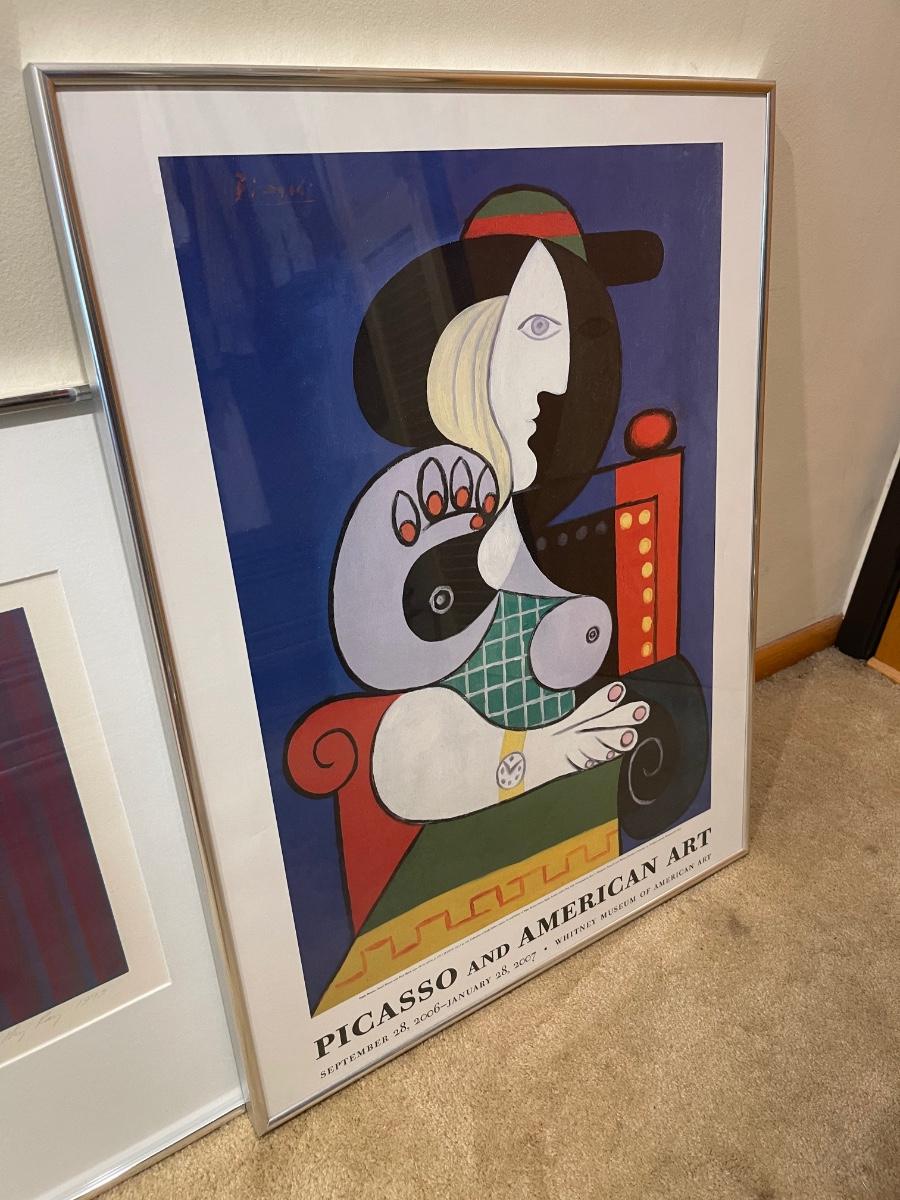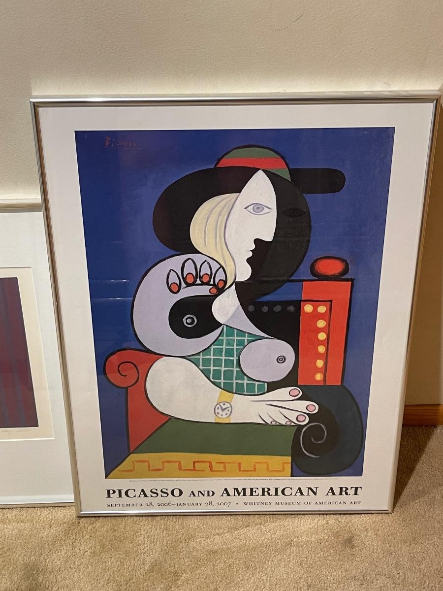 E13-Framed Picasso exhibit poster, and” “flag for marcus” signed