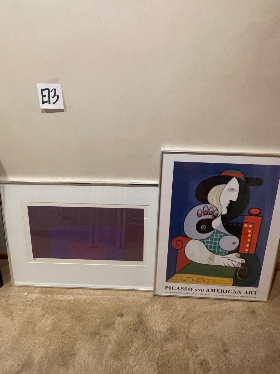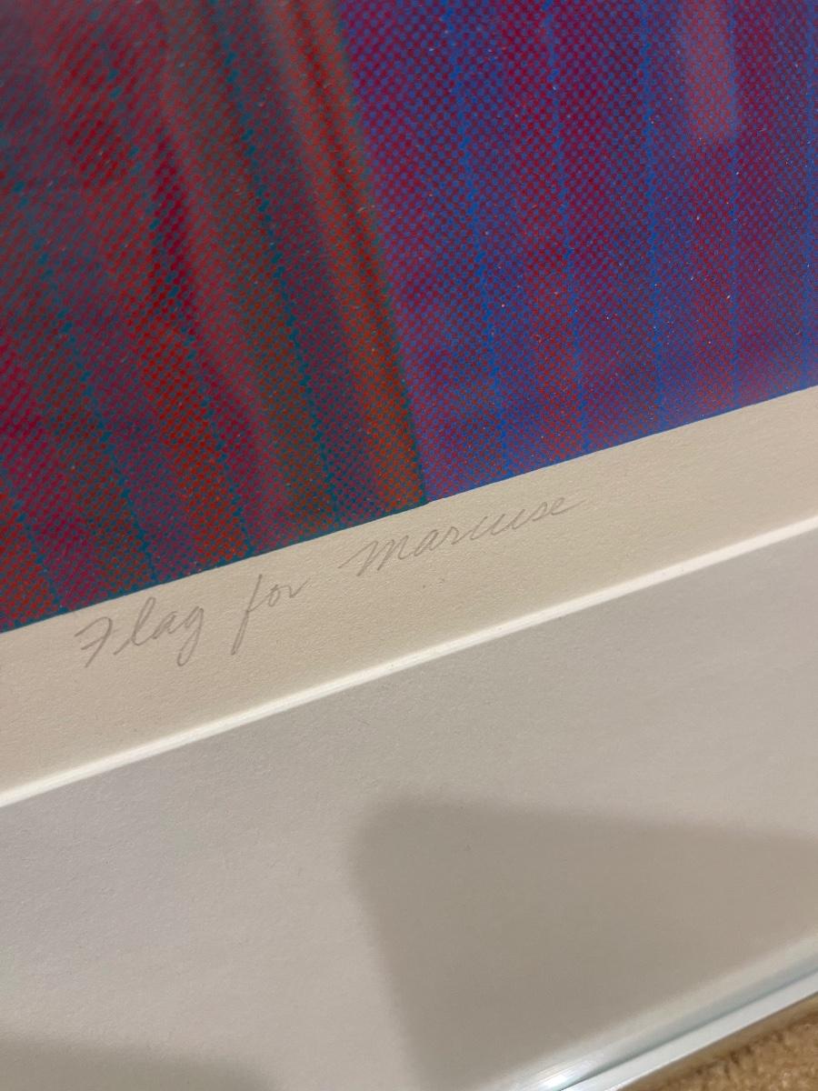 E13-Framed Picasso exhibit poster, and” “flag for marcusframed Picasso exhibit poster and flag for Marcuse” signed