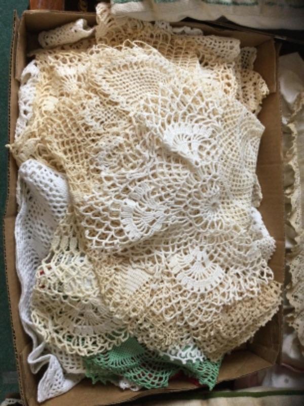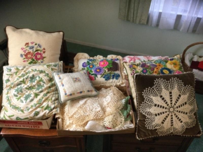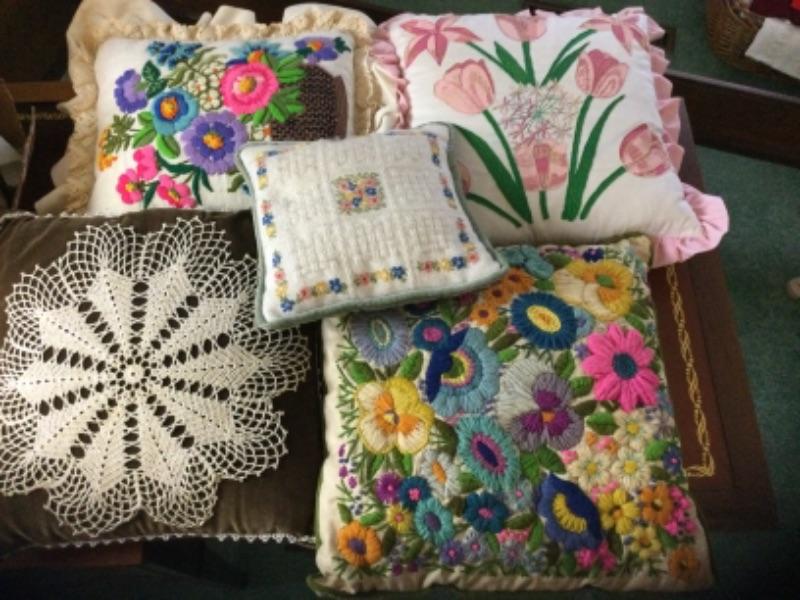 Seven vintage throw pillows some have needlepoint work and some cross stitch work. Lot of vintage doilies, some are hand made