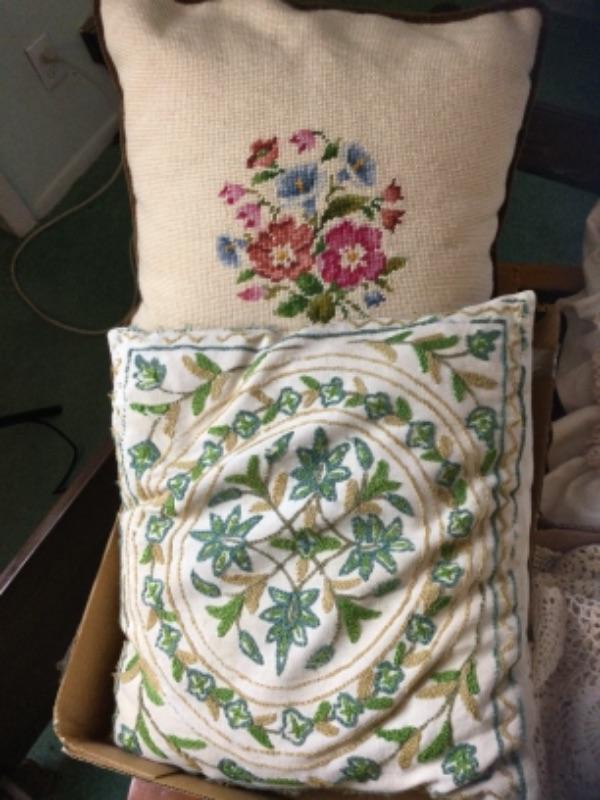 E-194 Vintage Needlepoint Cross Stitched Throw Pillows and Doilies