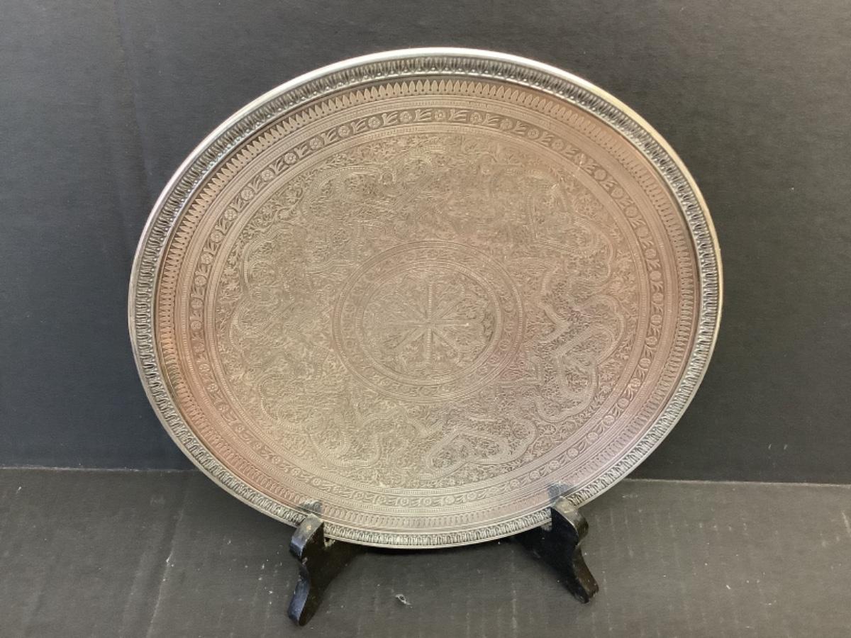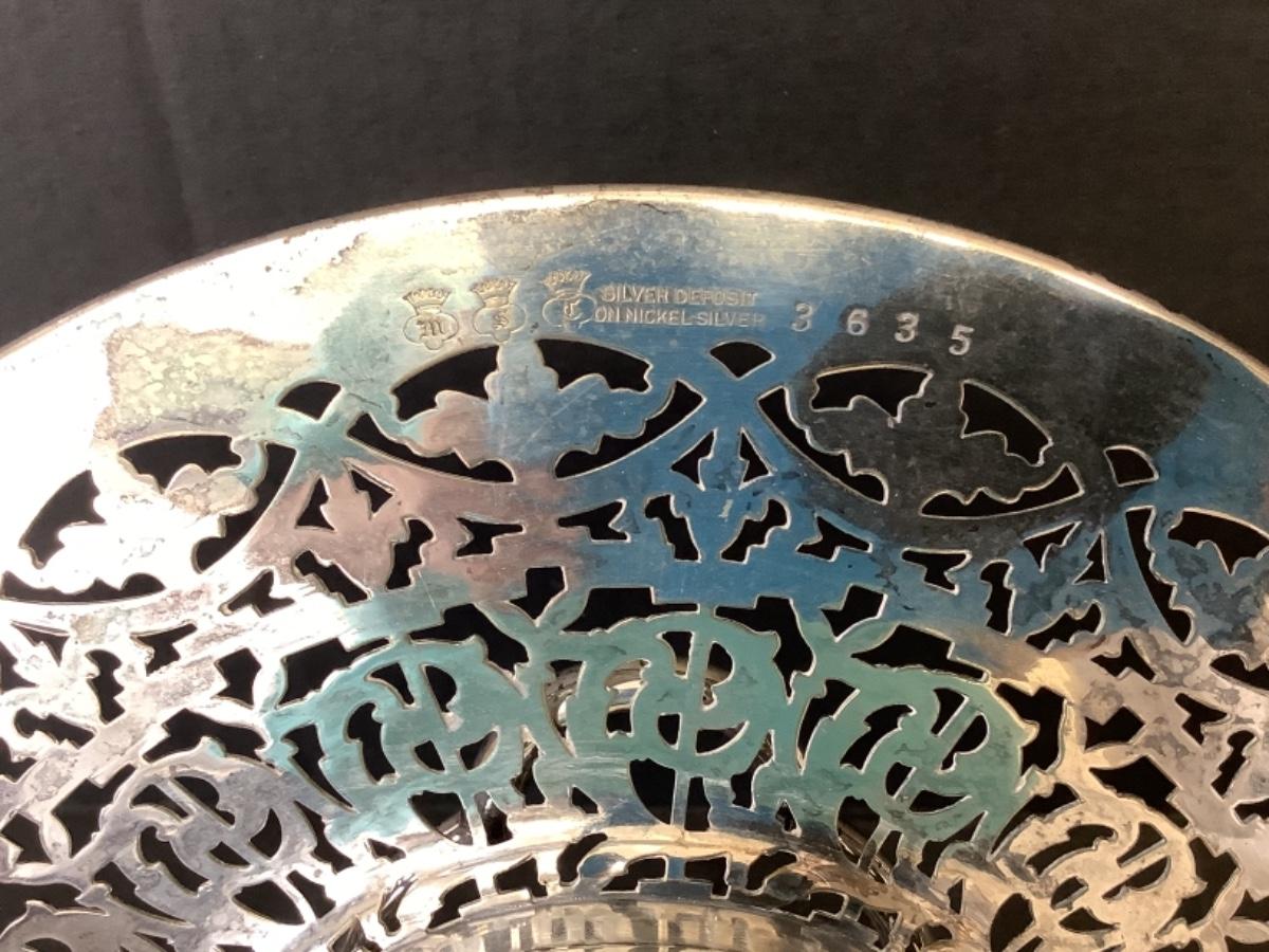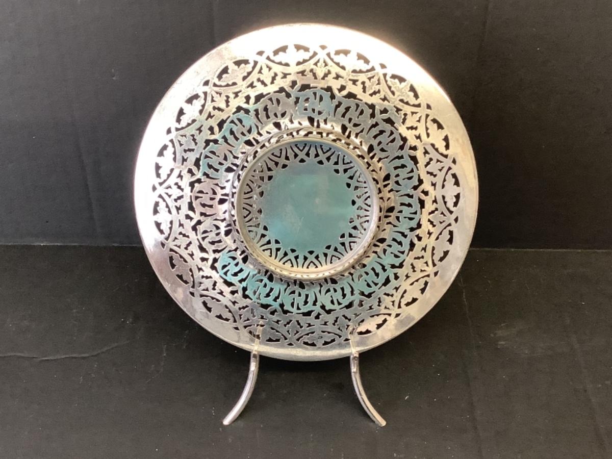 10” round Nickel Silver reticulated plate, stamped Silver Deposit on Nickel Silver on back, Meriden Silver Plate Co. footed plate with intricate design, measures 10” round