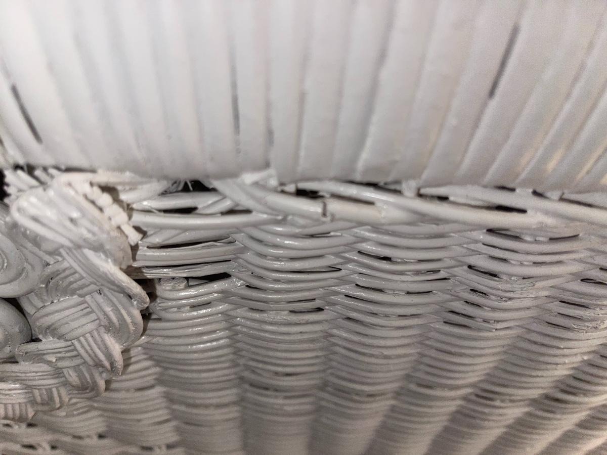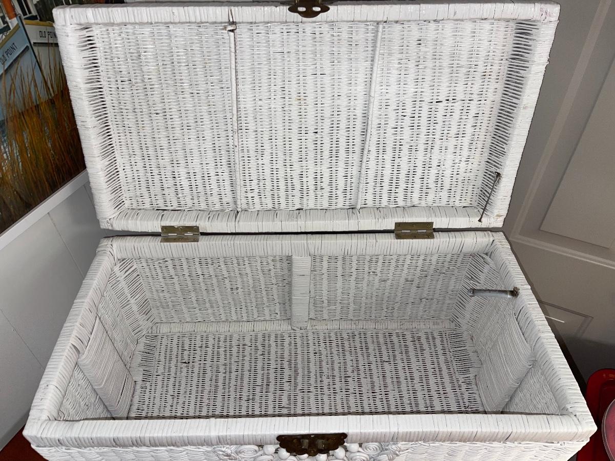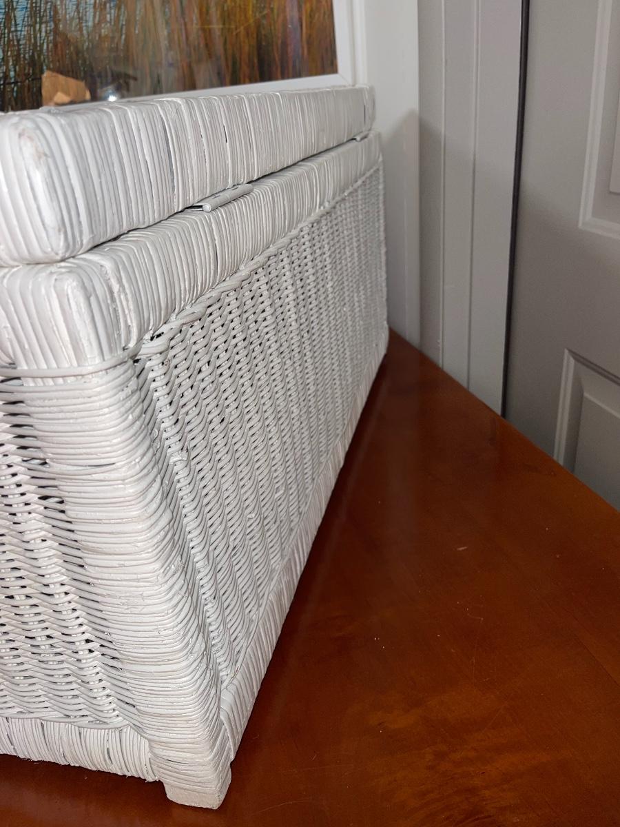 Overall great condition with very minor wicker damage, (see pic). Decorative front with front brass hardware.