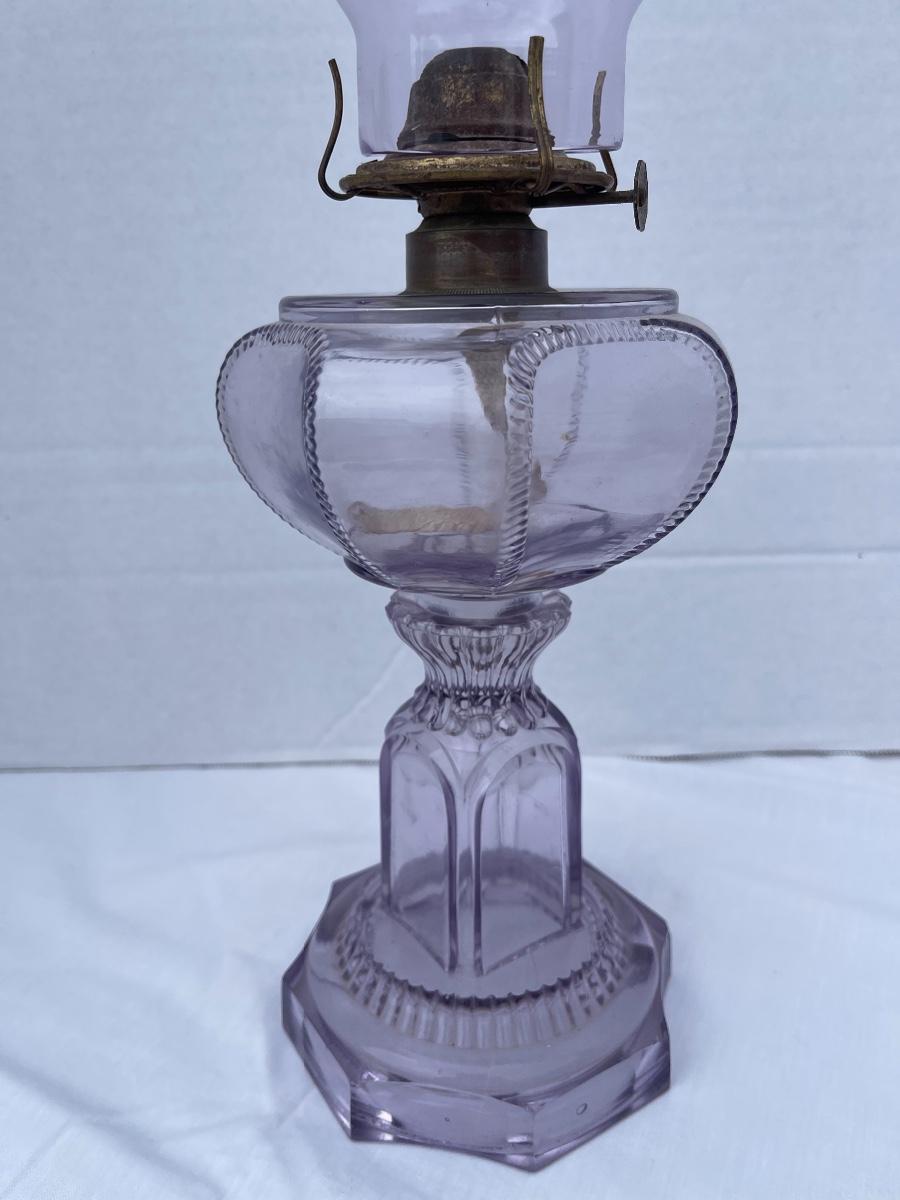 Lavender glass with wick. Wic operation hardware in working order.