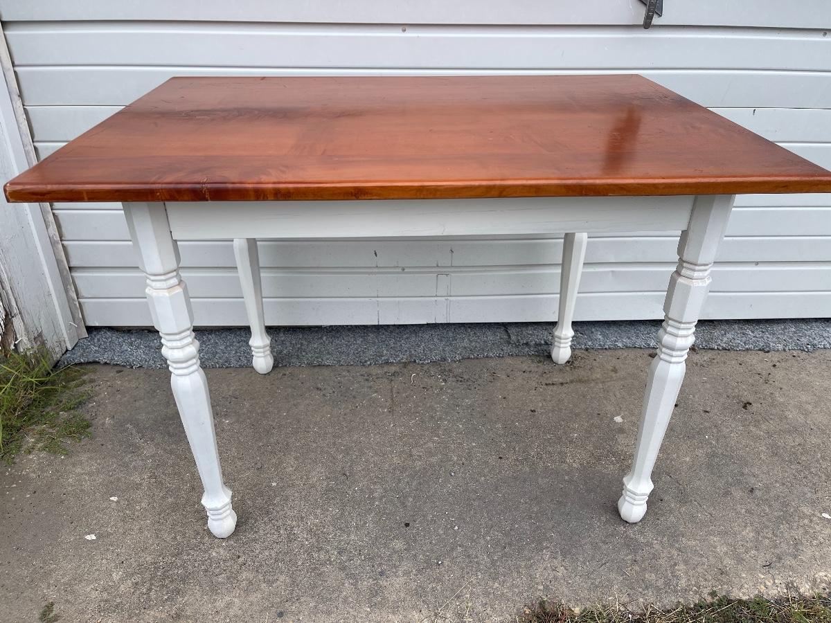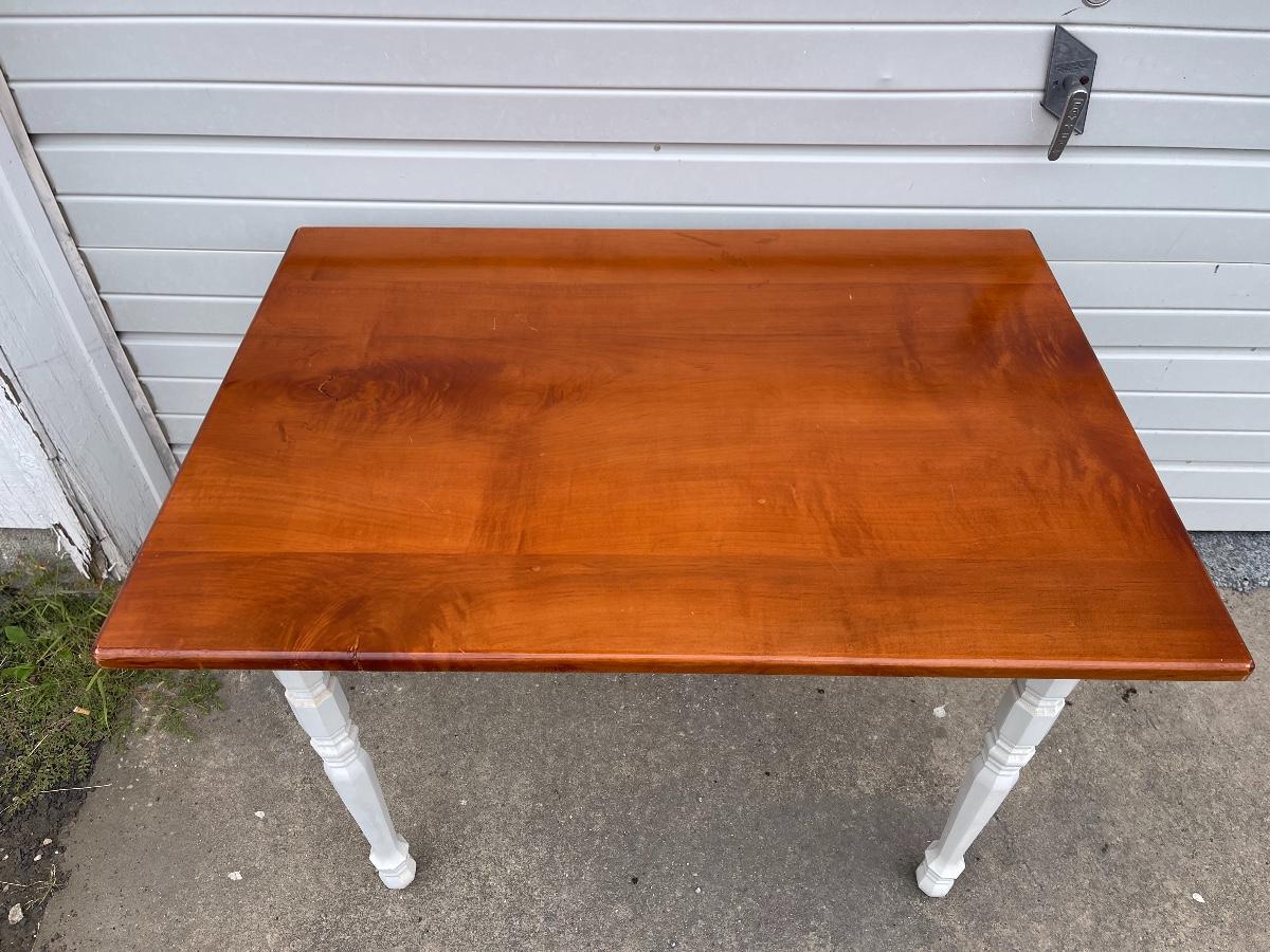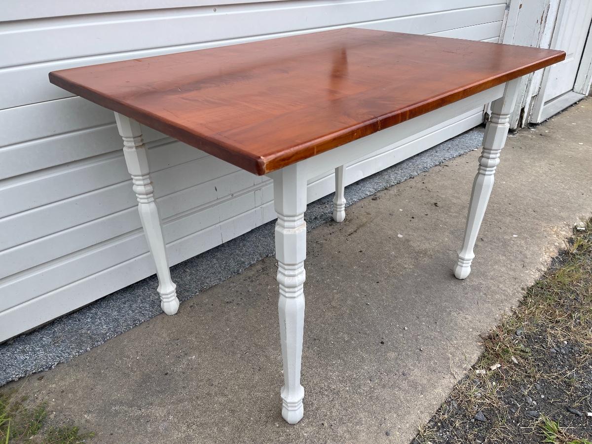 Wooden kitchen table w/stained and varnished top and painted white wooden base.