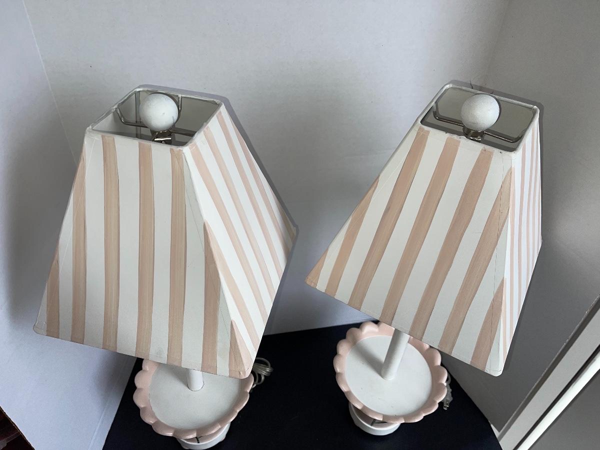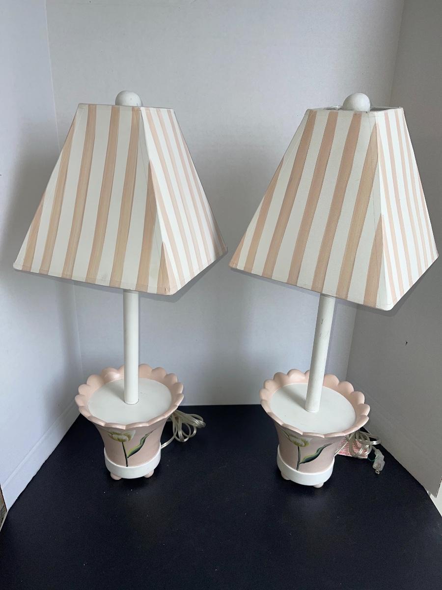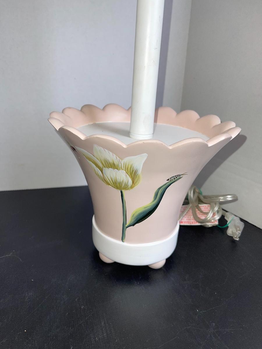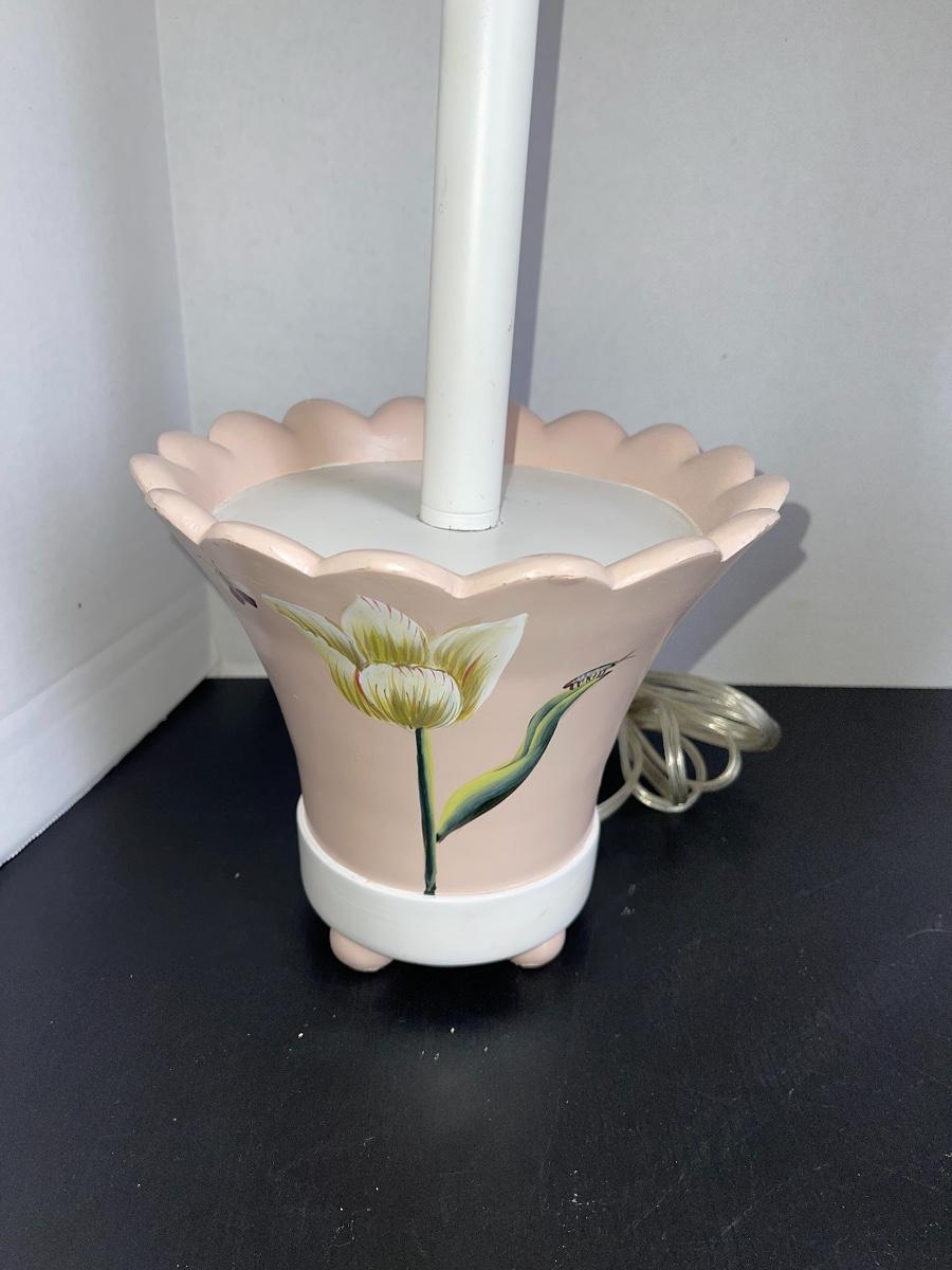 Painted eggshell white, peach with stripes. Base has painted pic of flower with a butterfly and insect.