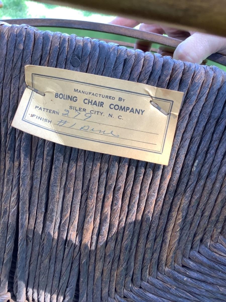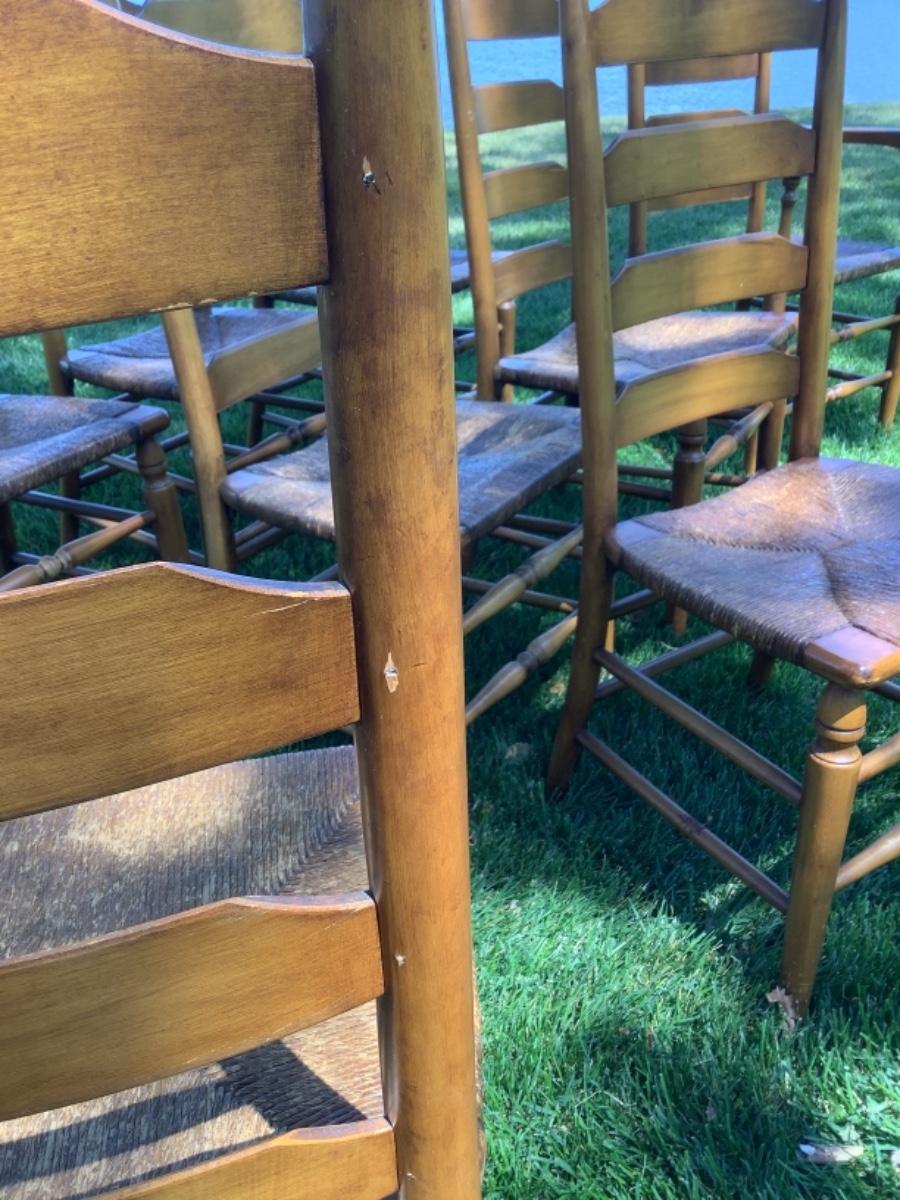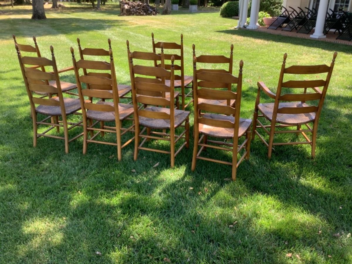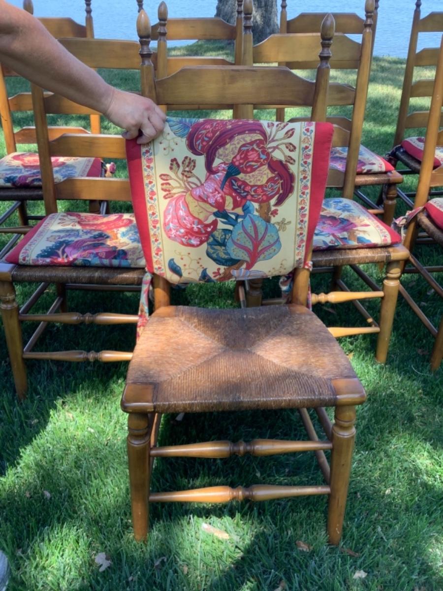Set of 10 Pine Finish Ladderback Chairs by Boling Chair Co. with rush seats and cushions