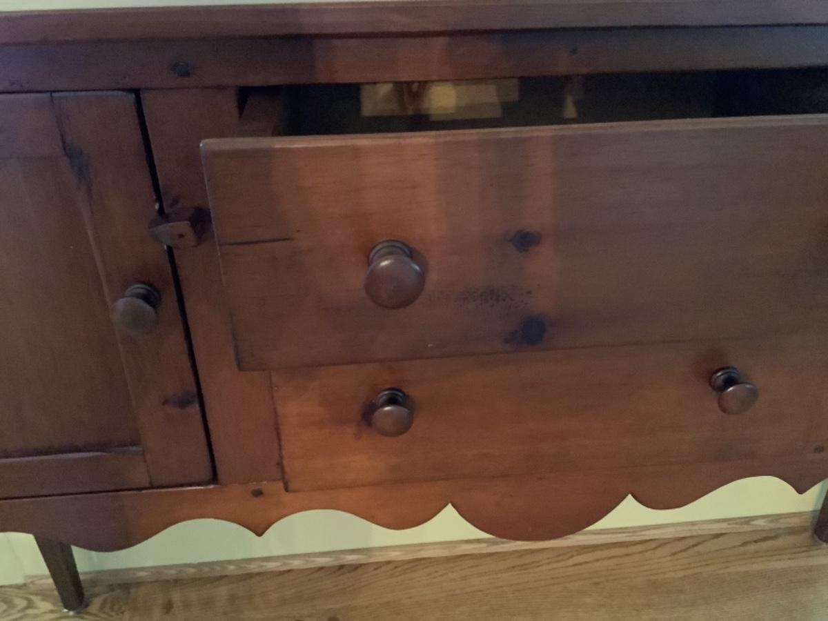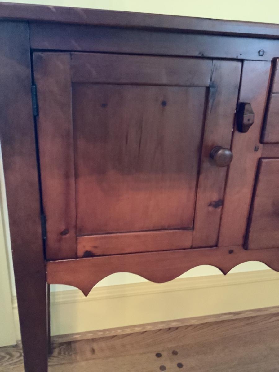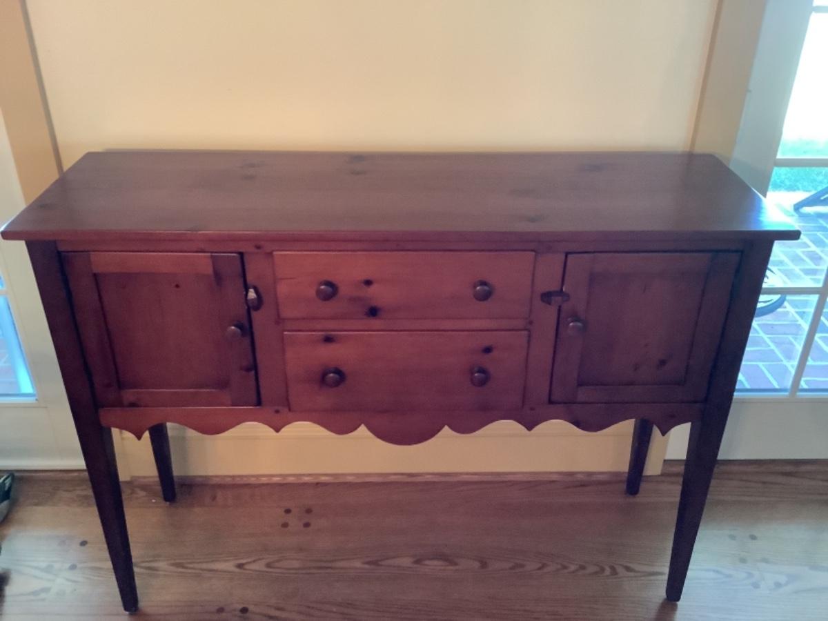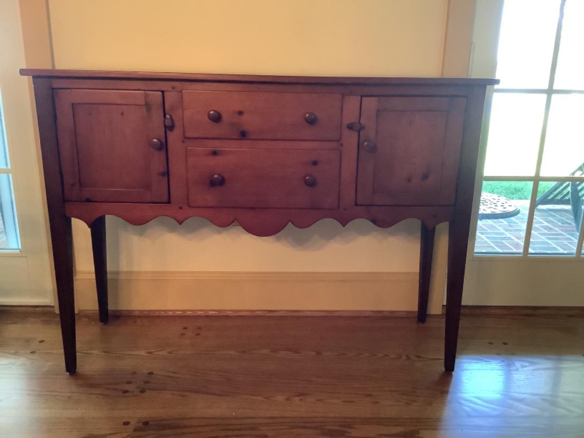 Handcrafted French country Style sideboard by Bernard Delin with two drawers and 2 cabinet doors and a delicate scalloped skirt bottom