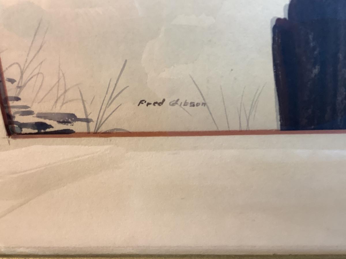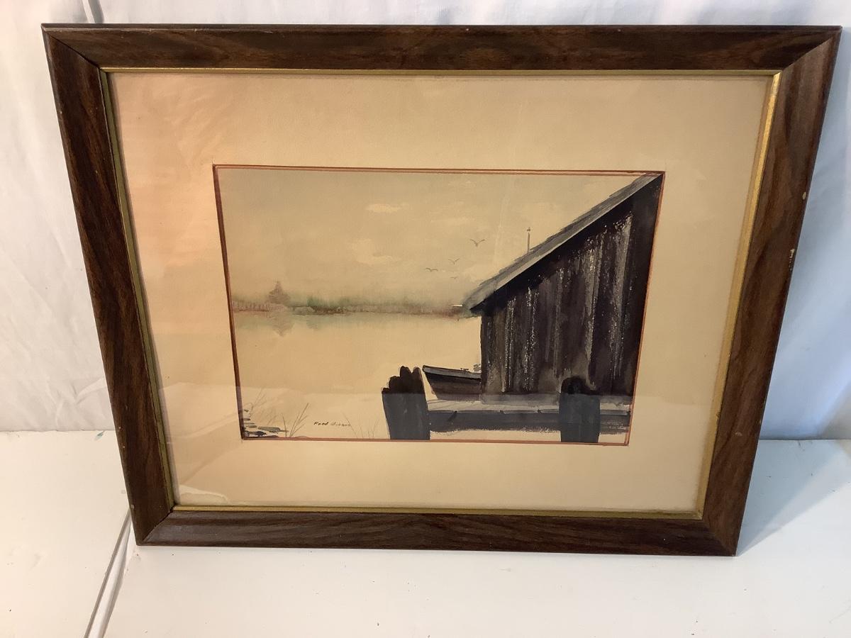 E941 Signed and Framed Watercolor of Boat House by Fred Gibson