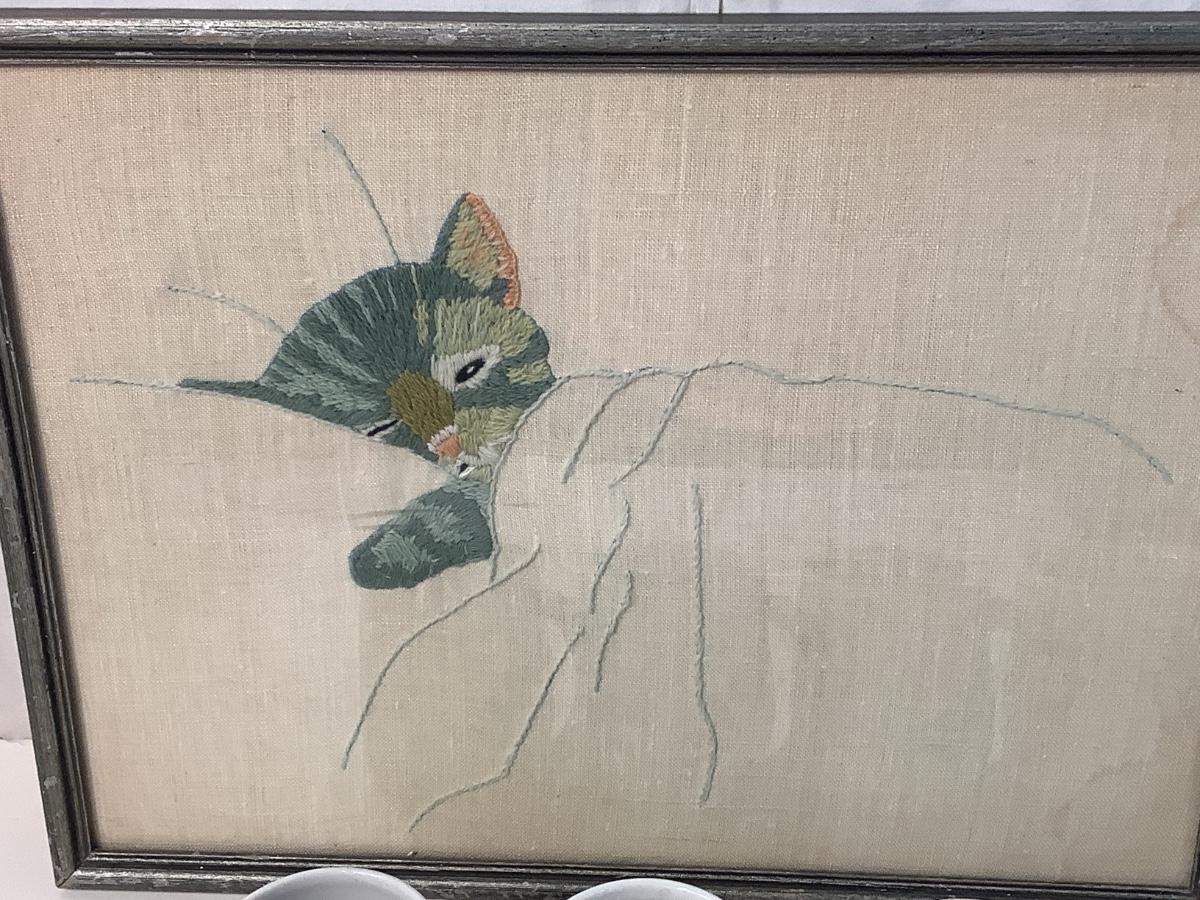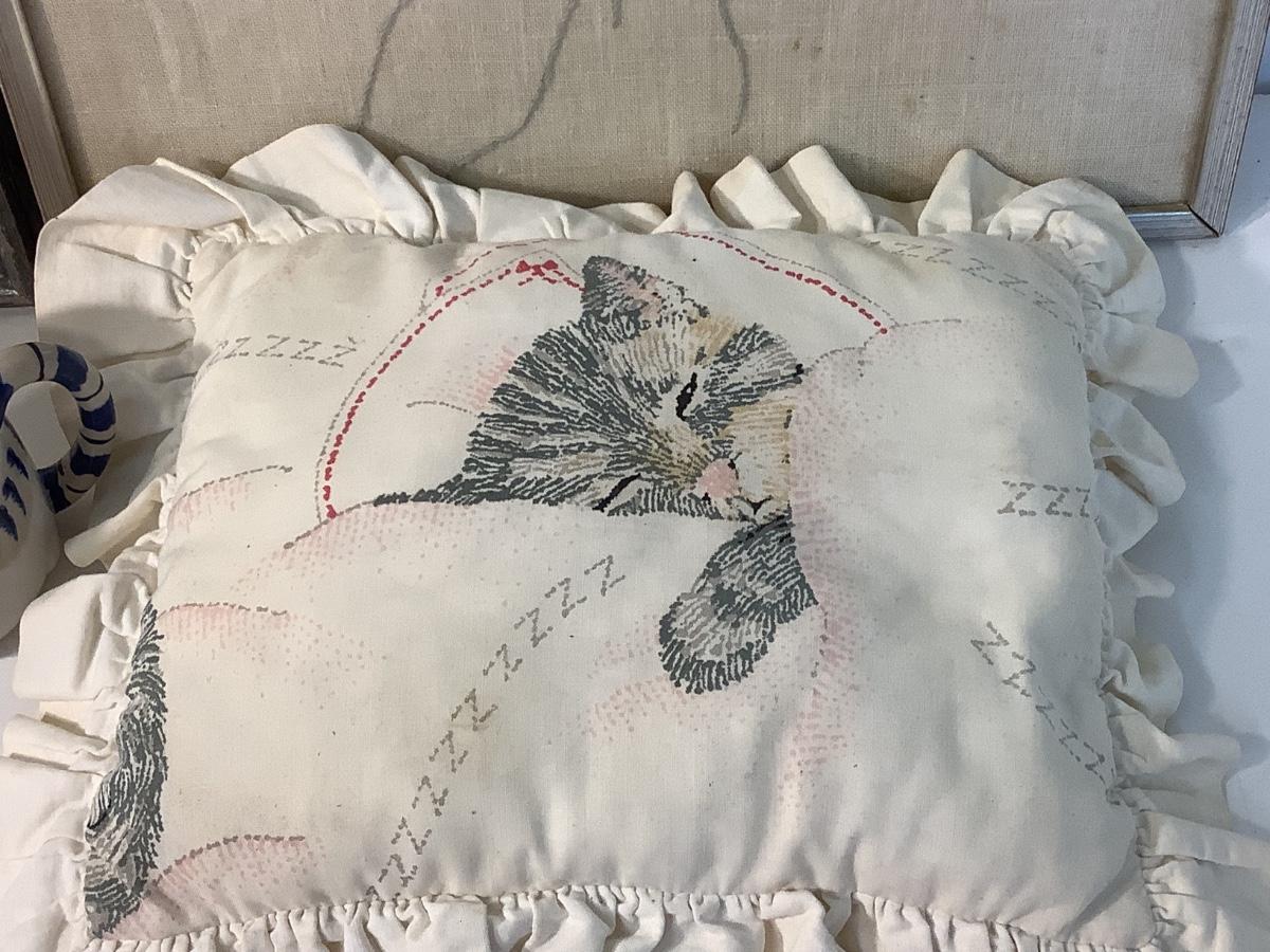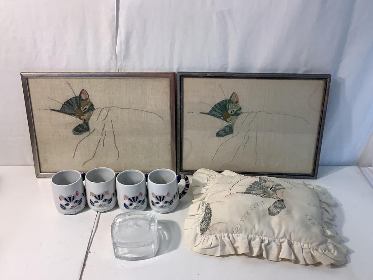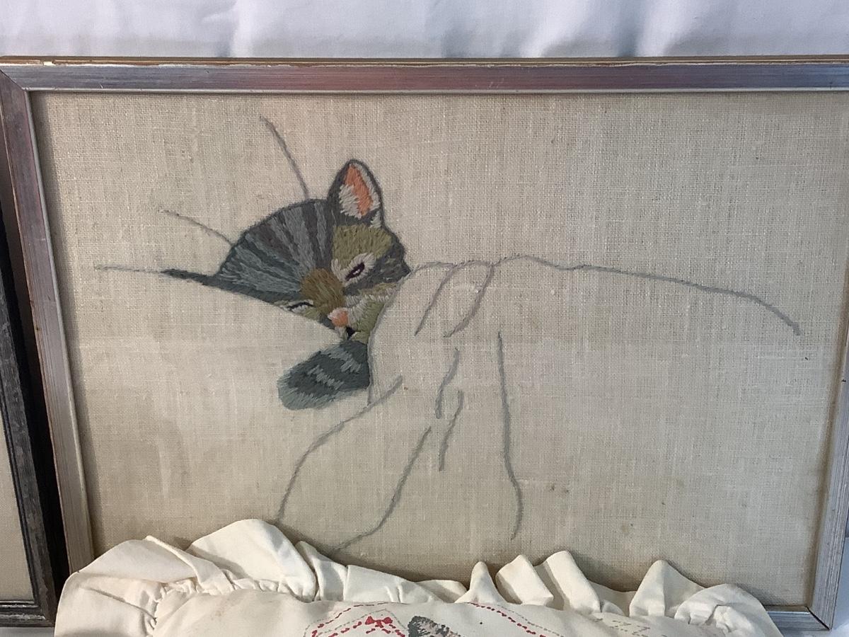 E945 Pair of Crewelwork Kittens with Mugs and pillow