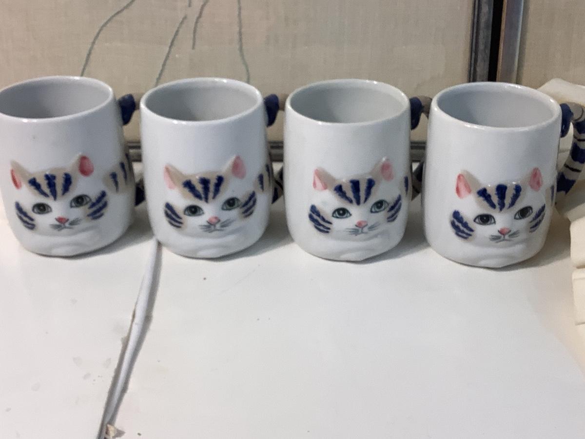 Set of 4 mugs with frosted glass covered cat dish