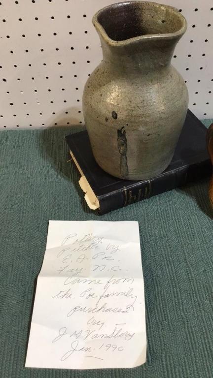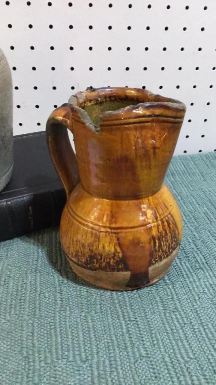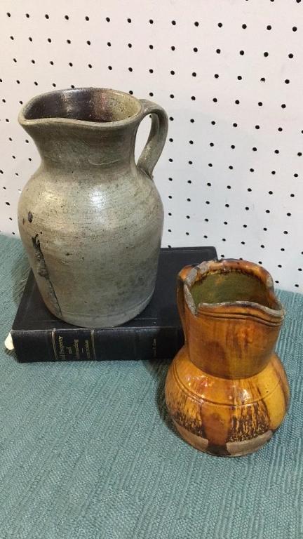 EA Poe pitcher with salt glaze, firing imperfections, written provenance included, 9 inch..Brown glazed pitcher, chips to rim, unsigned, 6 inch.