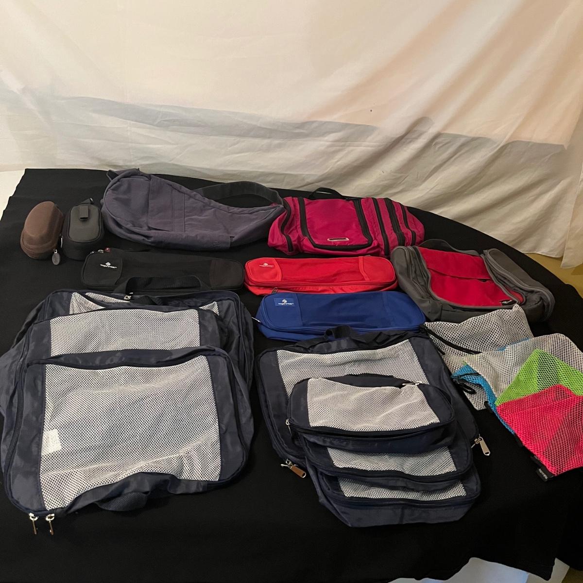 Lot includes Pro Packing cube bag, eight American Tourister packing bags, three bags and a shaving kit by Eagle Creek, seven Zipclikgo bags and a Healthy Back Bag that measures 10” x 17” x 4”.