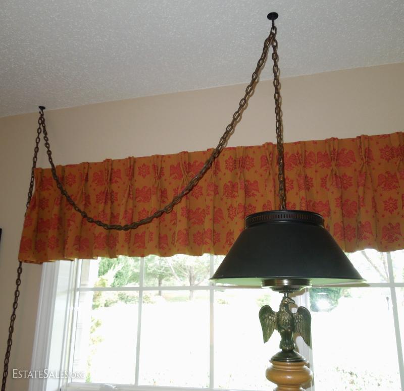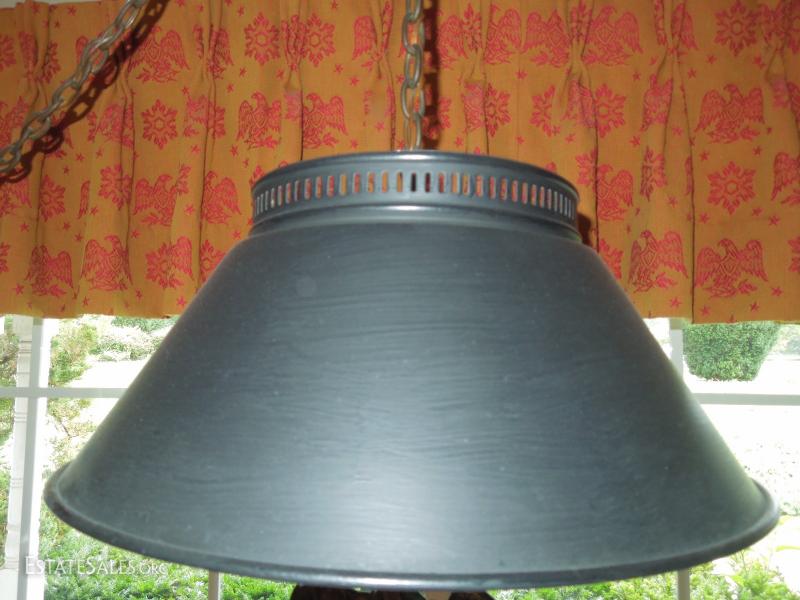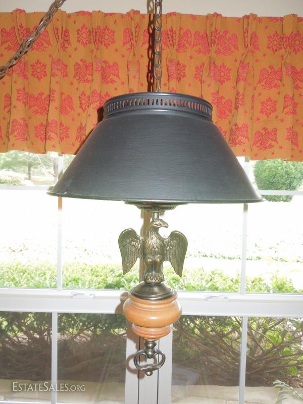 Metal shade and eagle atop wood knob. Switched cord runs through chain. No scratches.