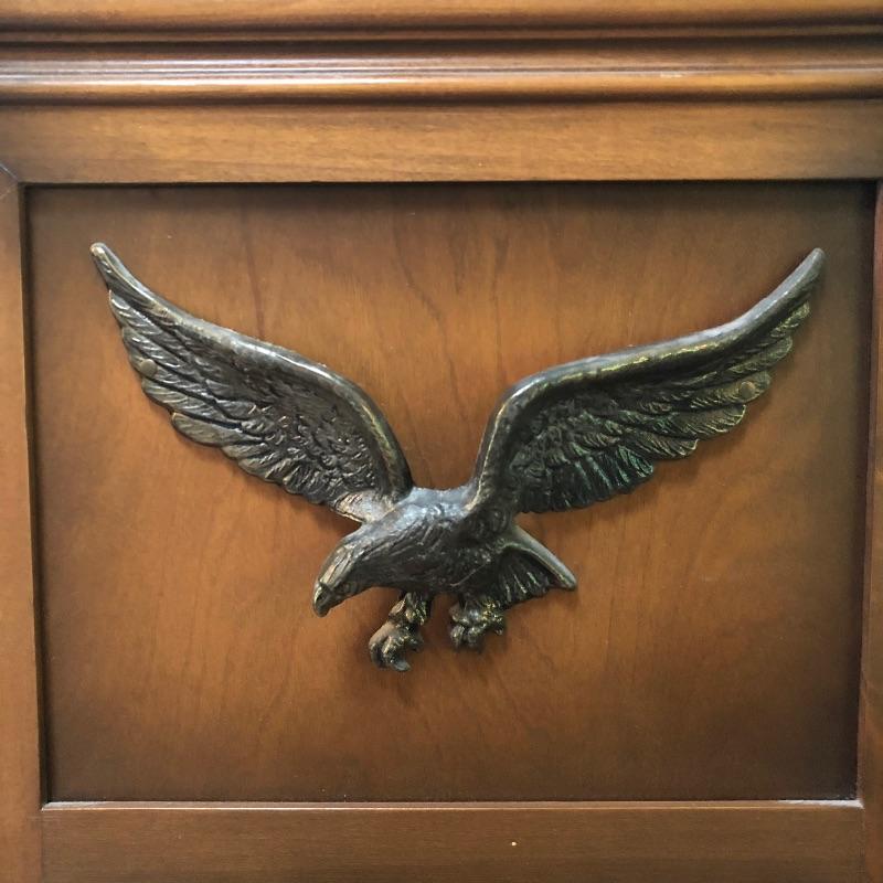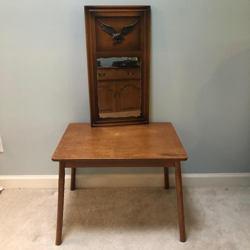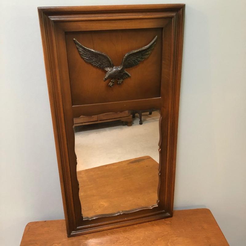 This lot includes a mirror framed in wood with a three-dimensional eagle design, as well as a wooden table. These eclectic pieces would pair well with each other or look great on their own. The mirror measures 15"W x 28.5"H. The table measures 27"W x 20"D x 21"H