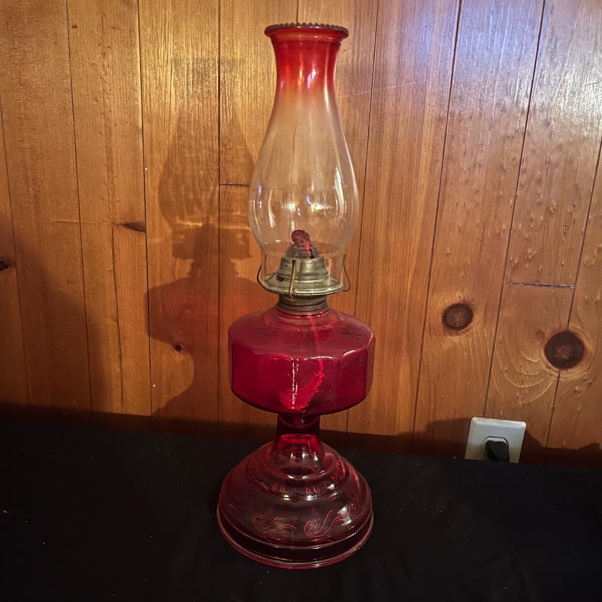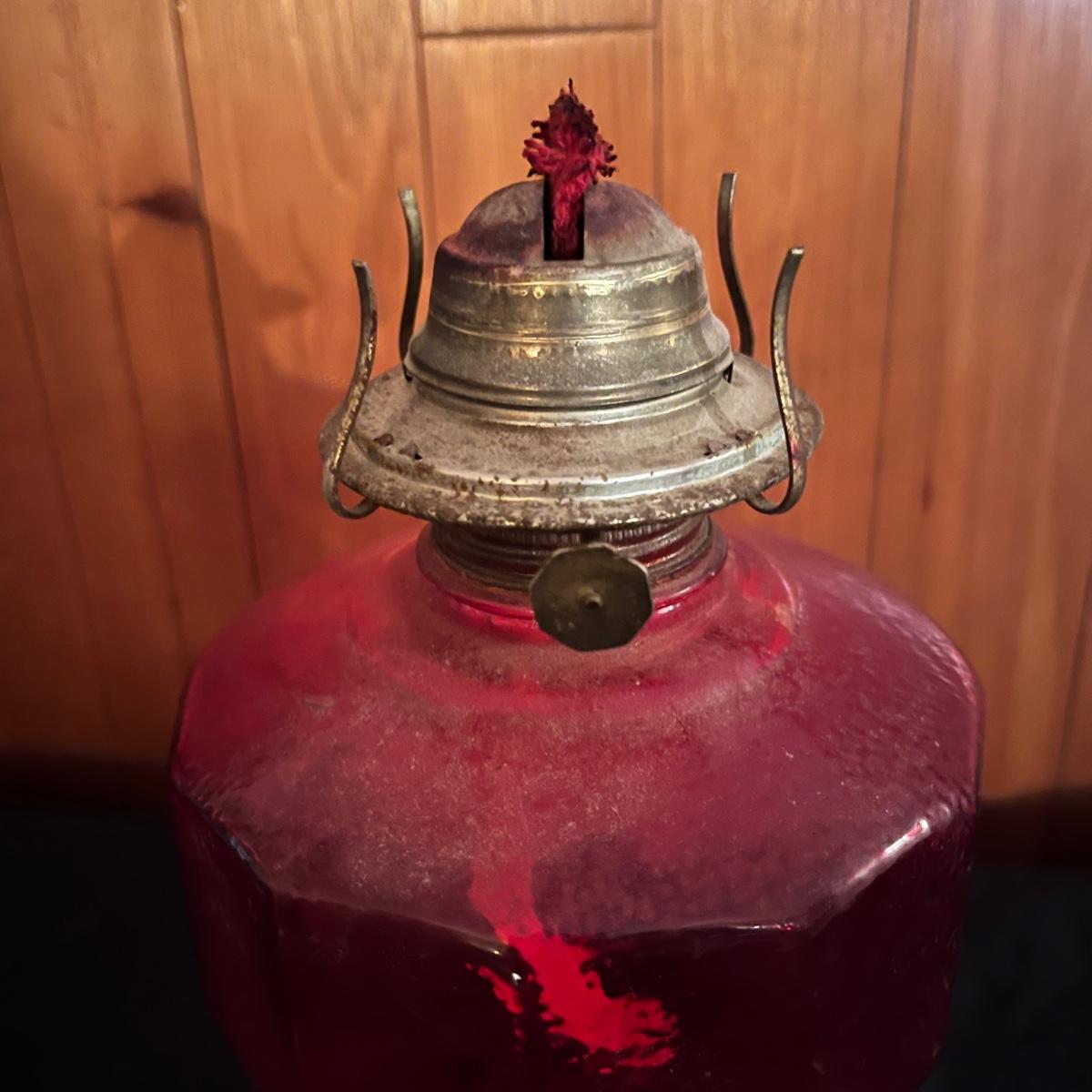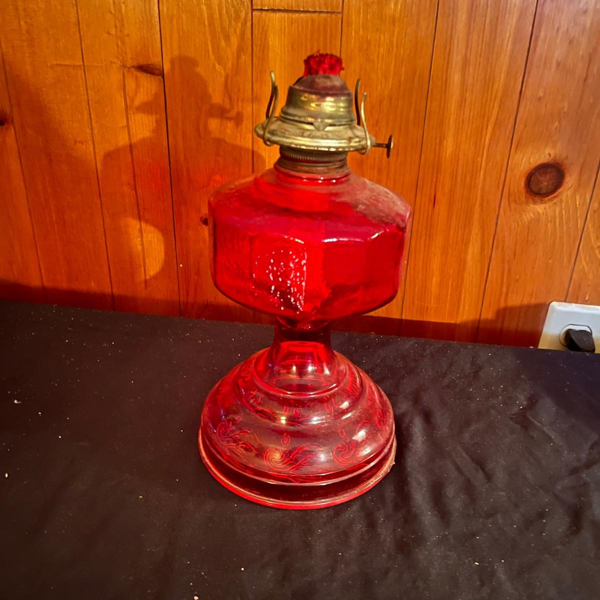 Lot includes a red glass Eagle oil lamp with a clear and red glass top. Lamp measures 6.5” x 18.5”.