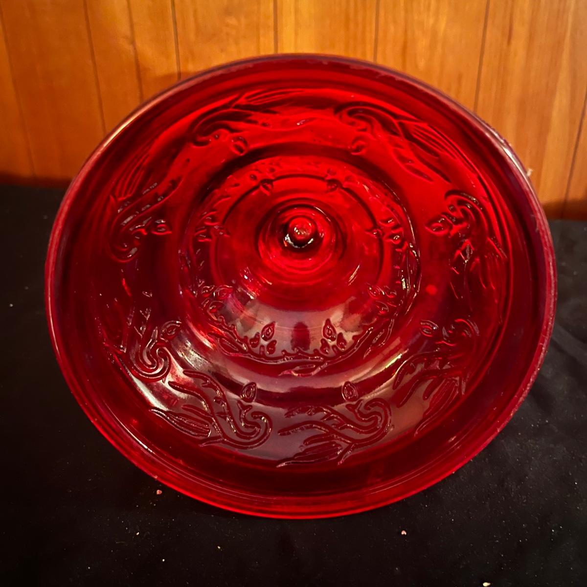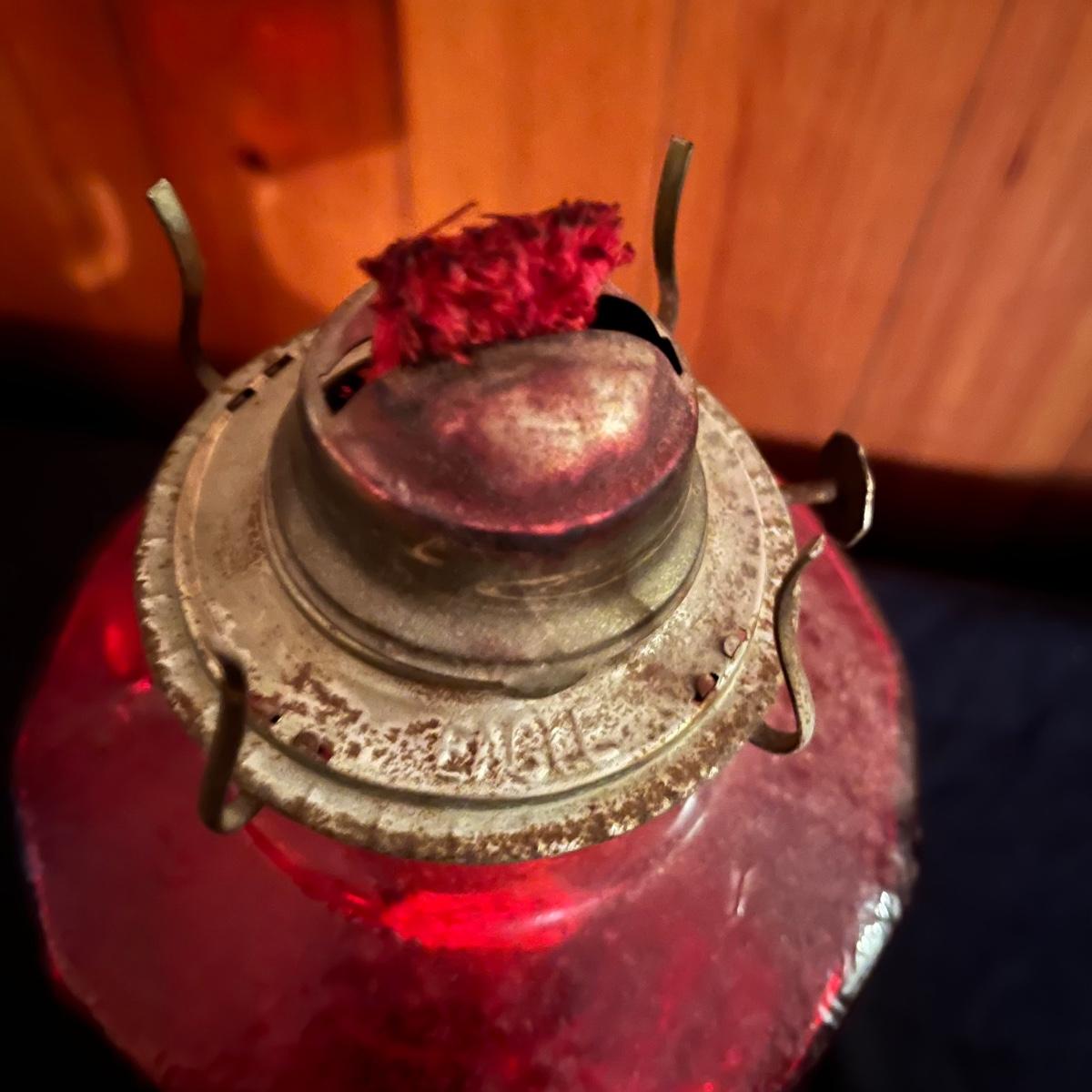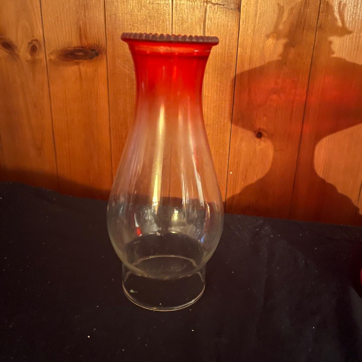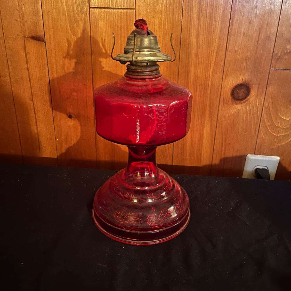Lot includes a red glass Eagle oil lamp with a clear and red glass top. Lamp measures 6.5” x 18.5”.