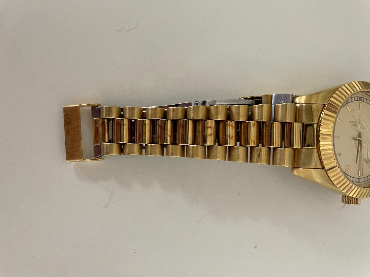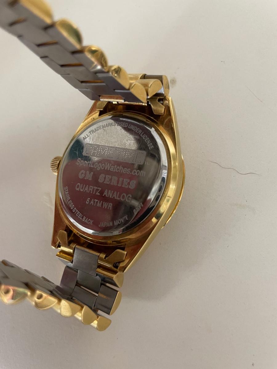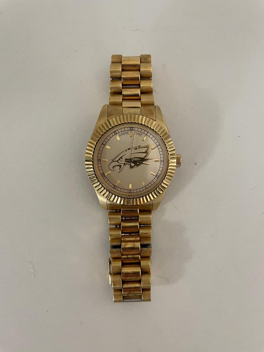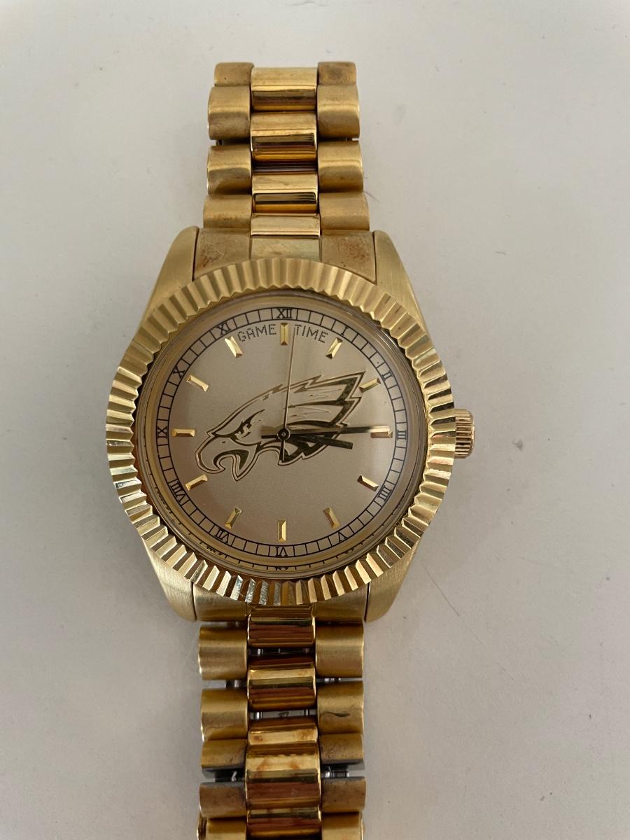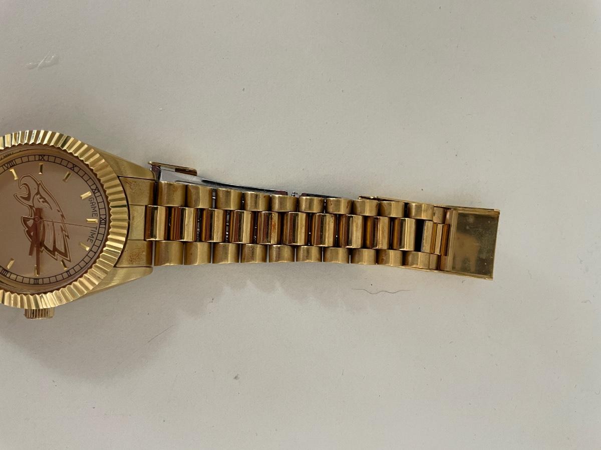 A stunning wristwatch that's perfect for the Eagles enthusiasts. The watch is made with high-quality stainless steel and features a beautiful gold bezel and dial color. It has a water resistance of 50m (5 ATM) and comes with a stainless steel band. Needs new battery other wise in great shape.