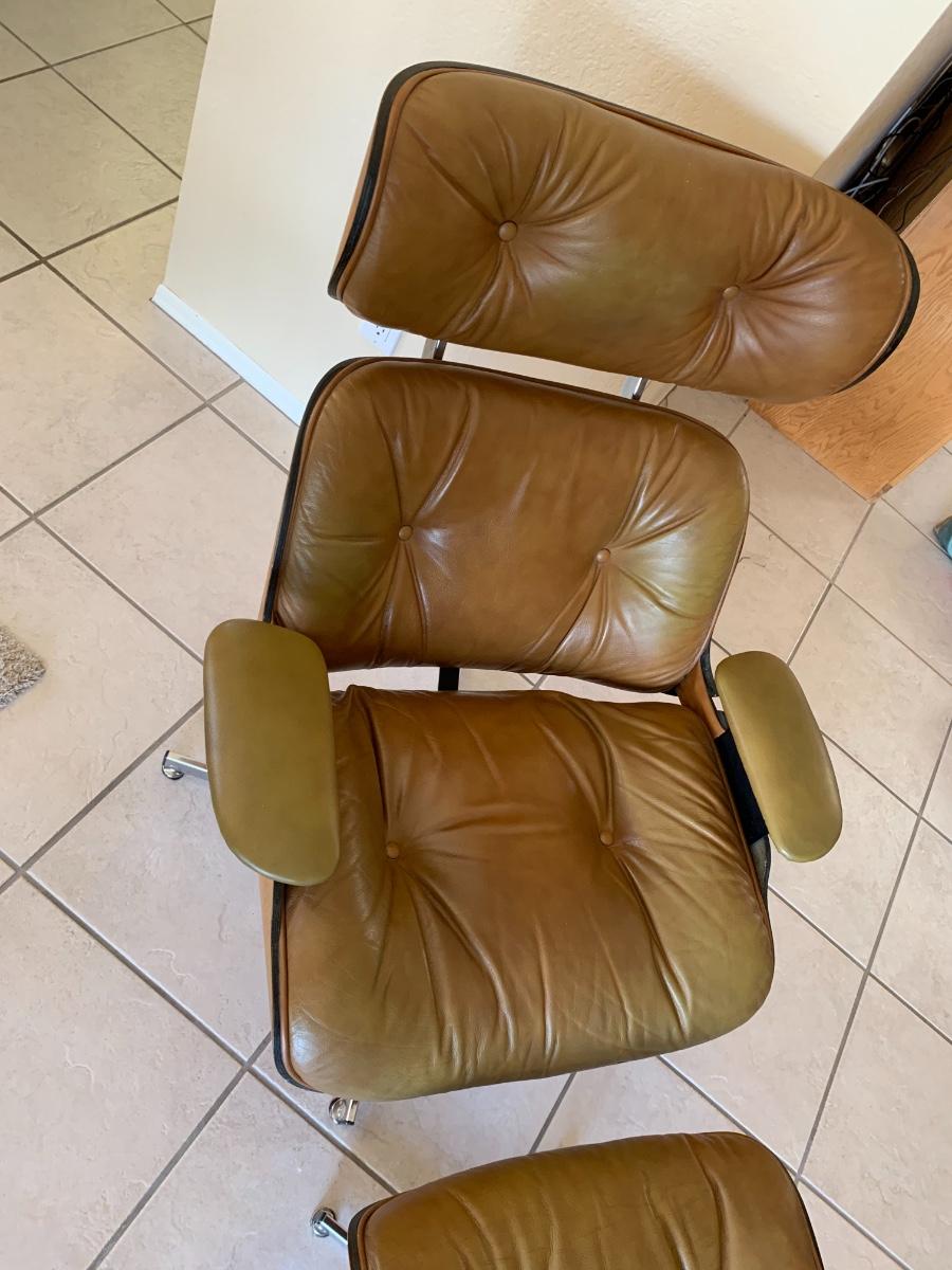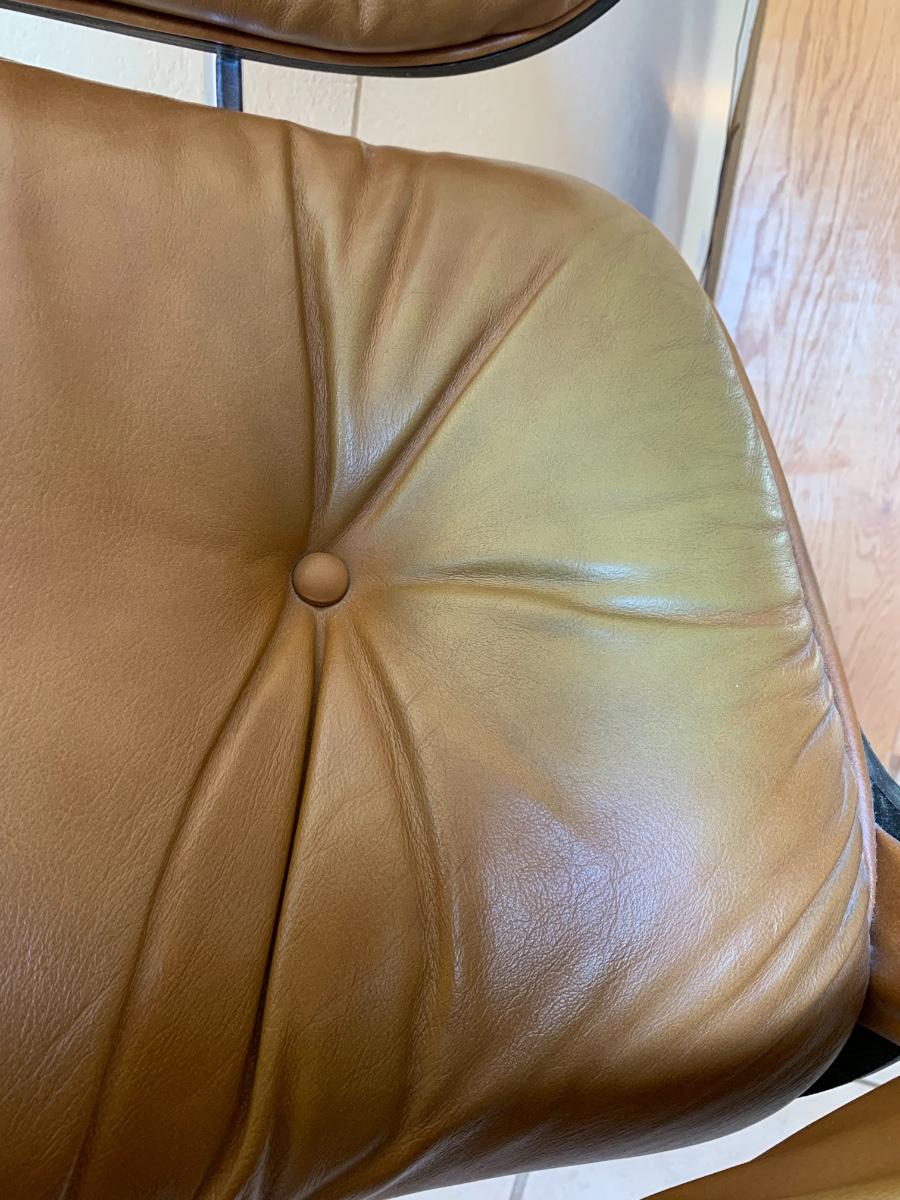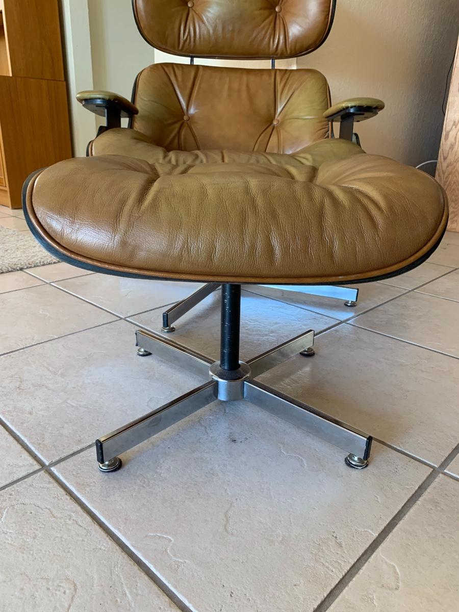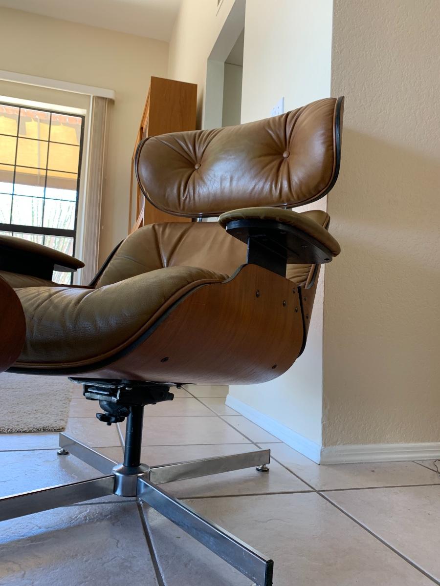Eames style lounge chair with ottoman by Selig Manufacturing Company in great condition with the acception of some fading on the edges and arms. (Seat height- 15 inches, back height- 39 inches, ottoman height- 16 inches) Extremely comfortable!