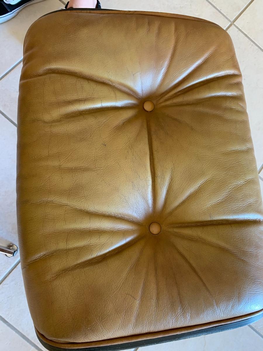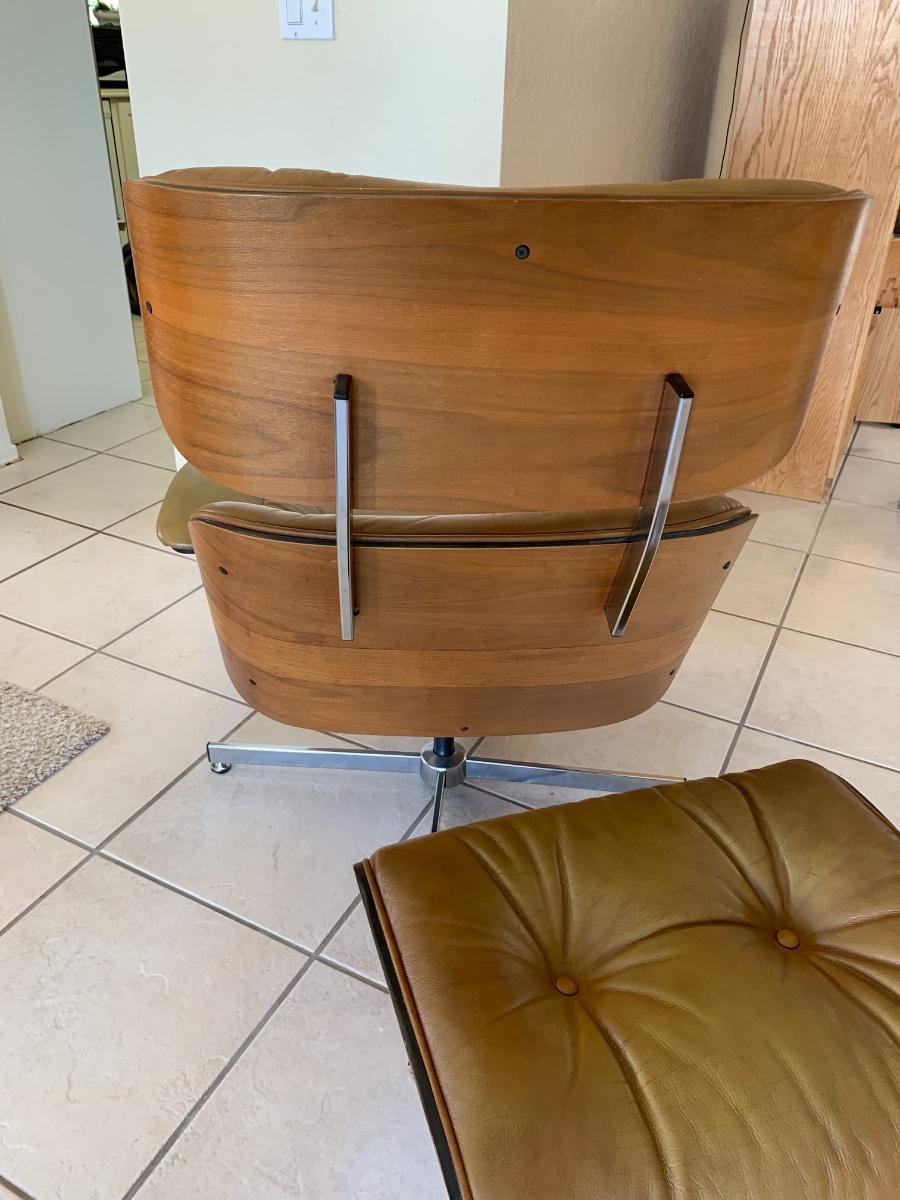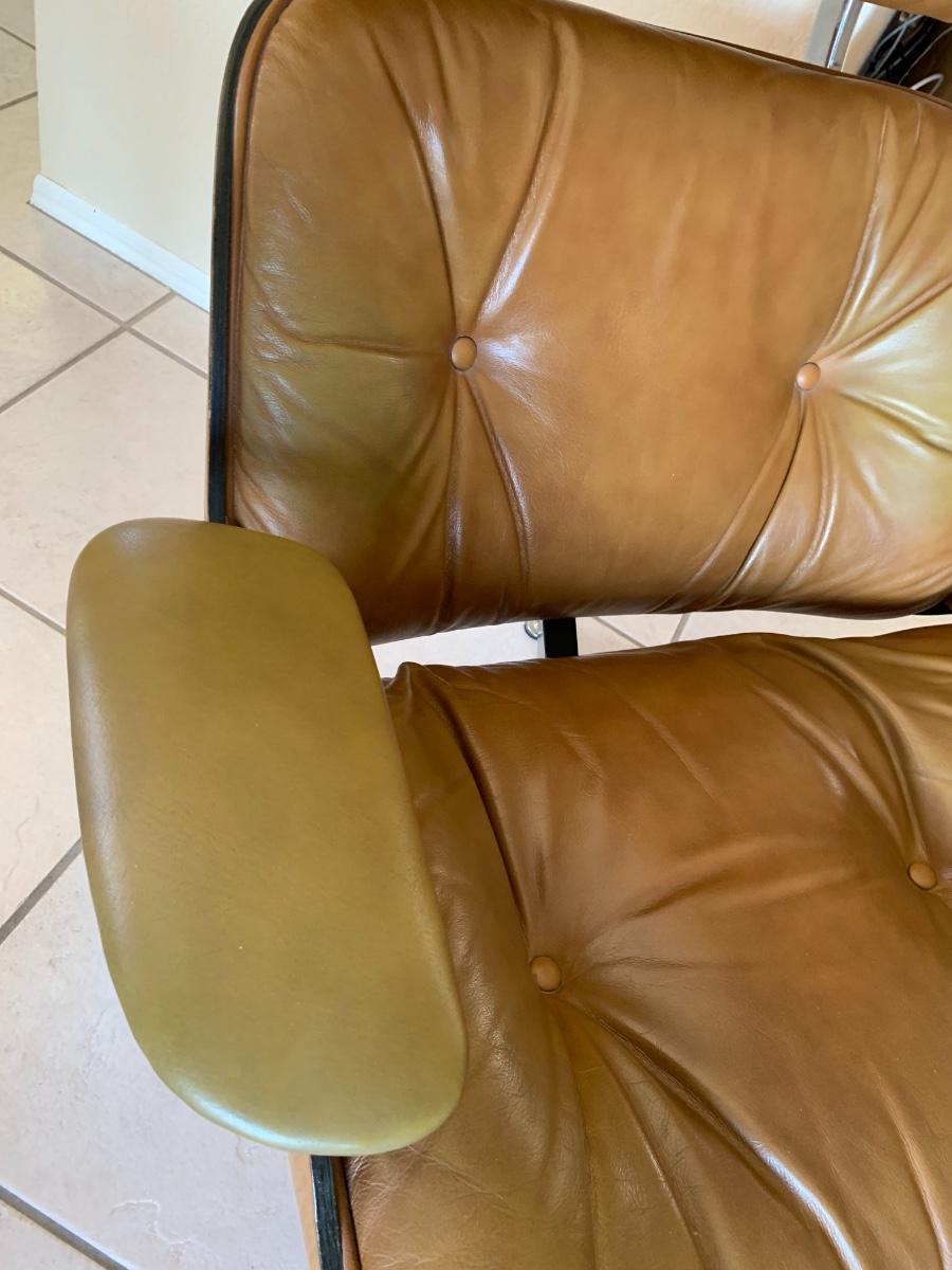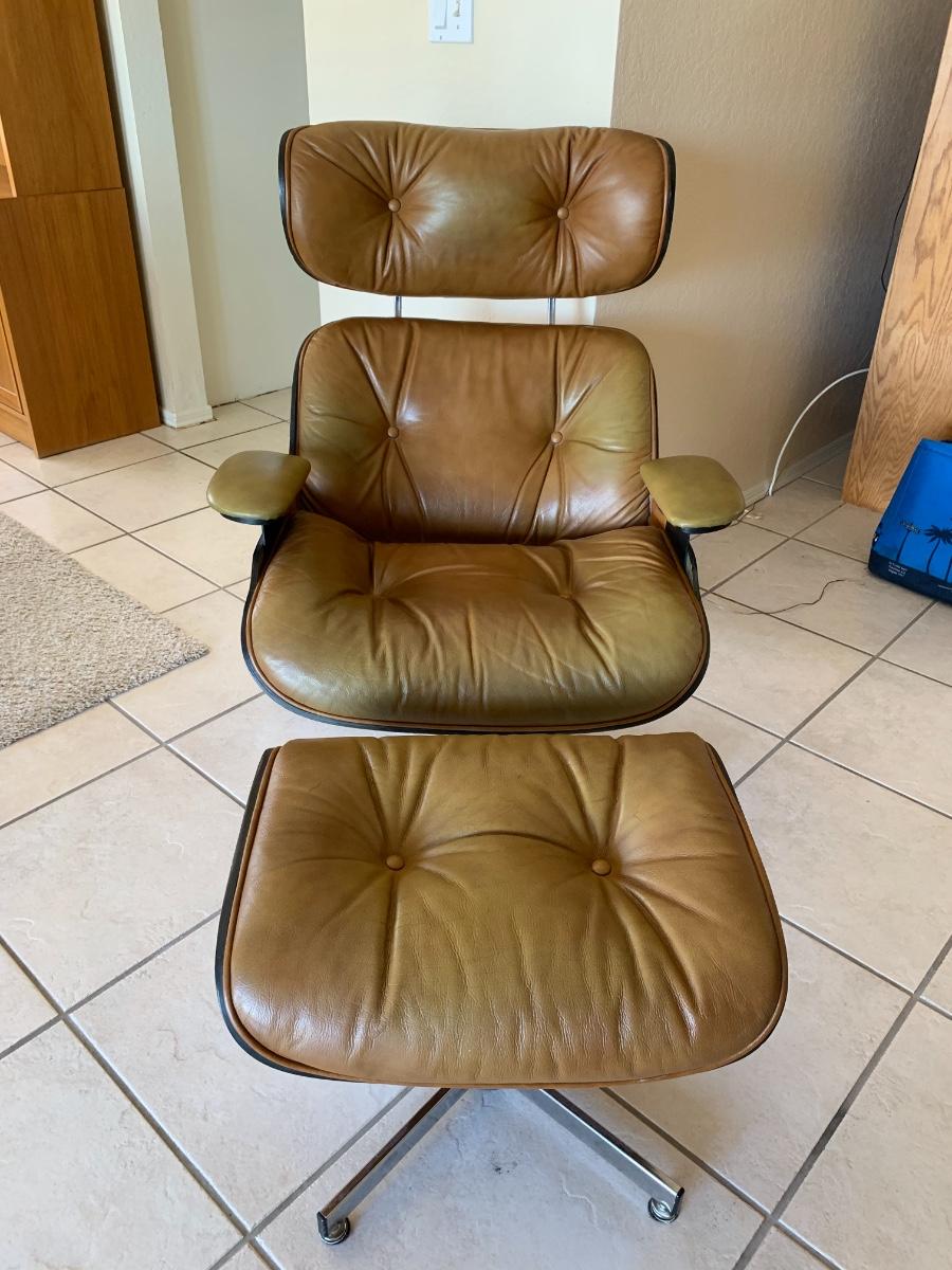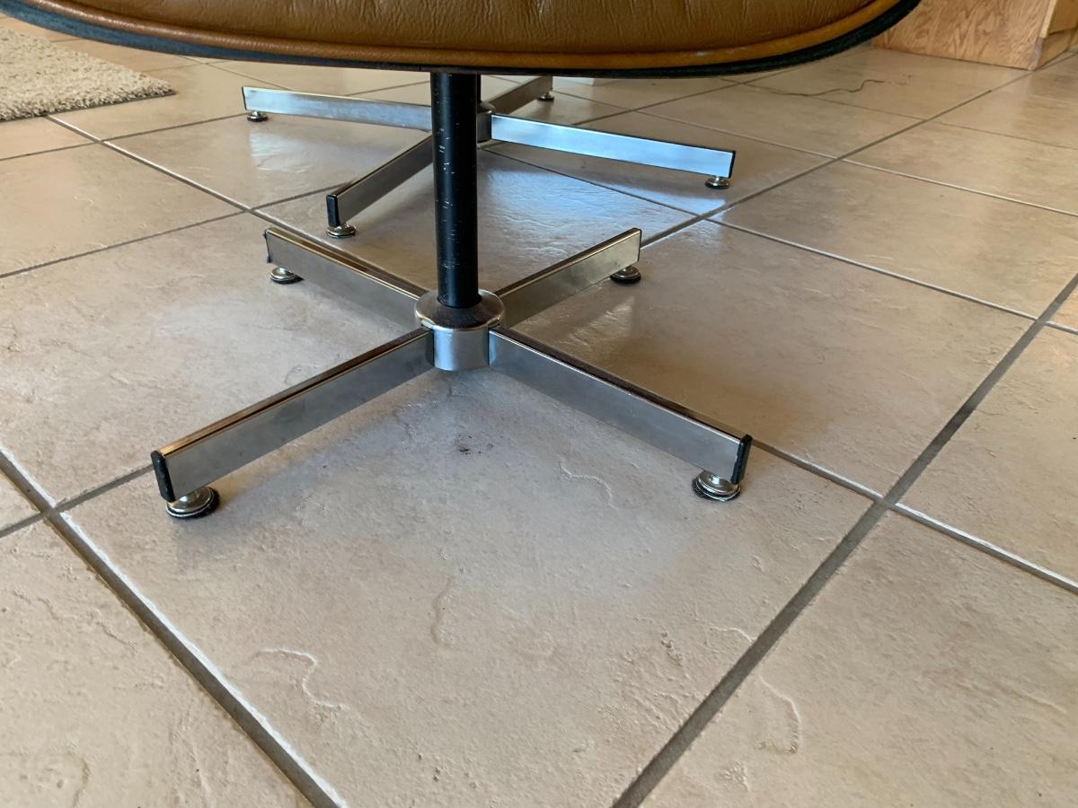 Eames style lounge chair with ottoman by Selig Manufacturing Company in great condition with the acception of some fading on the edges and arms. (Seat height- 15 inches, back height- 39 inches, ottoman height- 16 inches) Extremely comfortable!